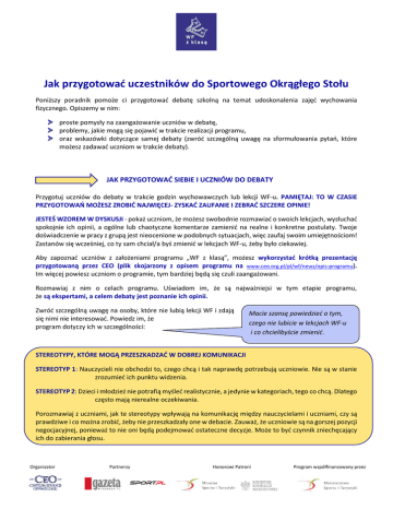 Jak przygotować uczestników do Sportowego Okrągłego Stołu Poniższy poradnik pomoże ci przygotować debatę szkolną na temat udoskonalenia zajęć wychowania fizycznego. Opiszemy w nim: proste pomysły na zaangażowanie uczniów w debatę, problemy, jakie mogą się pojawić w trakcie realizacji programu, oraz wskazówki dotyczące samej debaty (zwróć szczególną uwagę na sformułowania pytań, które możesz zadawać uczniom w trakcie debaty). JAK PRZYGOTOWAĆ SIEBIE I UCZNIÓW DO DEBATY Przygotuj uczniów do debaty w trakcie godzin wychowawczych lub lekcji WF-u. PAMIĘTAJ: TO W CZASIE PRZYGOTOWAŃ MOŻESZ ZROBIĆ NAJWIĘCEJ- ZYSKAĆ ZAUFANIE I ZEBRAĆ SZCZERE OPINIE! JESTEŚ WZOREM W DYSKUSJI - pokaż uczniom, że możesz swobodnie rozmawiać o swoich lekcjach, wysłuchać spokojnie ich opinii, a ogólne lub chaotyczne komentarze zamienić na realne i konkretne postulaty. Twoje doświadczenie w pracy z grupą jest nieocenione w podobnych sytuacjach, więc zaufaj swoim umiejętnościom! Zastanów się wcześniej, co ty sam chciał/a byś zmienić w lekcjach WF-u, żeby było ciekawiej. Aby zapoznać uczniów z założeniami programu „WF z klasą”, możesz wykorzystać krótką prezentację przygotowaną przez CEO (plik skojarzony z opisem programu na www.ceo.org.pl/pl/wf/news/opis-programu). Im więcej powiesz uczniom o programie, tym bardziej będą się czuli zaangażowani. Rozmawiaj z nim o celach programu. Uświadom im, że są najważniejsi w tym etapie programu, że są ekspertami, a celem debaty jest poznanie ich opinii. Zwróć szczególną uwagę na osoby, które nie lubią lekcji WF i zdają się nimi nie interesować. Powiedz im, że program dotyczy ich w szczególności: Macie szansę powiedzieć o tym, czego nie lubicie w lekcjach WF-u i co chcielibyście zmienić. STEREOTYPY, KTÓRE MOGĄ PRZESZKADZAĆ W DOBREJ KOMUNIKACJI STEREOTYP 1: Nauczycieli nie obchodzi to, czego chcą i tak naprawdę potrzebują uczniowie. Nie są w stanie zrozumieć ich punktu widzenia. STEREOTYP 2: Dzieci i młodzież nie potrafią myśleć realistycznie, a jedynie w kategoriach, tego co chcą. Dlatego często mają nierealne oczekiwania. Porozmawiaj z uczniami, jak te stereotypy wpływają na komunikację między nauczycielami i uczniami, czy są prawdziwe i co można zrobić, żeby nie przeszkadzały one w debacie. Zauważ, że uczniowie są na gorszej pozycji negocjacyjnej, ponieważ to nie oni będą podejmować ostateczne decyzje. Może to być czynnik zniechęcający ich do zabierania głosu. Organizator Partnerzy Honorowi Patroni Program współfinansowany przez JAK PRZYGOTOWAĆ DEBATĘ JAK ZORGANIZOWAĆ PRZESTRZEŃ? To, jak zorganizujesz przestrzeń debaty, nie pozostanie bez wpływu na jej przebieg. Najlepiej, żeby uczniowie czuli się swobodnie, będą wtedy szczerze się wypowiadać. Wybierz odpowiednio dużą salę, może być to sala gimnastyczna. Zadecyduj, czy uczniowie mają siedzieć na podłodze, czy na krzesłach: siedzenie na podłodze jest niekrępujące, z drugiej strony ustawienie krzeseł w sali gimnastycznej sugeruje, że debata jest ważnym wydarzeniem w życiu szkoły. Najlepsze są układy koła/półkola. Niekorzystne jest ustawienie konfrontacyjne – np. wszyscy nauczyciele siedzący naprzeciwko uczniów. Przestrzeń powinna pokazywać, że dyskusję prowadzicie wszyscy razem. WIEK UCZNIÓW Większość zawartych w poradniku wskazówek odwołuje się do wszystkich grup wiekowych uczniów. Wyjątkiem są pierwsze klasy szkoły podstawowej. W przypadku najmłodszych uczniów dodatkowo: w trakcie debaty podziel uczniów na mniejsze grupy dyskusyjne, przygotuj scenariusze pytań, jakie moderatorzy grup będą zadawali uczniom, wprowadź więcej zasad do „burzy mózgów” np. podnoszenie ręki, im młodsi uczniowie, tym debata powinna być krótsza. KOMUNIKACJA W POSZCZEGÓLNYCH ETAPACH DEBATY Na początku debaty poinformuj, jakie są zasady, jaki będzie przebieg i ile będzie trwała debata. Znając szczegóły uczniowie będą bardziej zmotywowani do pracy. ETAPY DEBATY 1. 2. 3. 4. DIAGNOZA SYTUACJI – Jak teraz wyglądają lekcje WF? Jakie są plusy i minusy? CELE DEBATY – poznanie opinii/potrzeb uczniów, zebranie pomysłów, rozwiązań BURZE MÓZGÓW – rozwiązania problemów PROJEKTOWANIE ROZWIĄZAŃ – proces eliminacji i ulepszania pomysłów. Konfrontowanie z celami. Uważaj, żeby rozwiązania były konkretne i realistyczne. 5. PODSUMOWANIE Organizator Partnerzy Honorowi Patroni Program współfinansowany przez DIAGNOZA SYTUACJI Pierwszym etapem debaty jest ustalenie kwestii, które należy omówić. Bardzo ważna jest rola prowadzącego debatę. Musi on/ona podsumowywać wypowiedzi uczestników i tak je formułować by były konstruktywne. Musi także umiejętnie dopytywać o konkrety. Jeśli problem jest konkretny i rozłożony na poszczególne cegiełki to staje się znacznie prostszy do rozwiązania. Zbyt ogólne sformułowanie problemu: Uczniowie nie lubią lekcji WF-u. Konkretne sformułowanie: Uczniowie nie lubią nieprzyjemnych szatni, przeszkadza im brak zasłonek w przebieralni; w zimie na sali gimnastycznej jest zbyt zimno; lekcje WF-u zawsze wyglądają tak samo itp. Jak młodzi ludzie dorastają czasem jest trudno na WF-ie – jakie mogą pojawić się problemy? Rozpocznij dyskusję na TRUDNE TEMATY: np. opisz hipotetyczny przypadek, żeby uczniowie nie musieli wypowiadać się o sobie WAŻNE: Nie spieraj się ze stanowiskiem uczestnika, dowiedz się, co za nim stoi. Jaką uczeń sygnalizuje potrzebę? Zawsze zadawaj pytanie: „dlaczego?” Uczeń mówi: Ja po prostu nienawidzę WF-u i już! Zapytaj: Dlaczego? Co dokładnie ci przeszkadza? Czego ci brakuje? PAMIĘTAJ, ŻEBY MÓWIĆ TEŻ O TYM, CO SIĘ TERAZ PODOBA NA WF-ie (np. atmosfera, sala, wycieczki na basen). To ważne informacje, które często pomijamy skupiając się na krytyce. CELE DEBATY Ustalanie celów jest bardzo ważne. Dobrze sformułowane cele mają wp