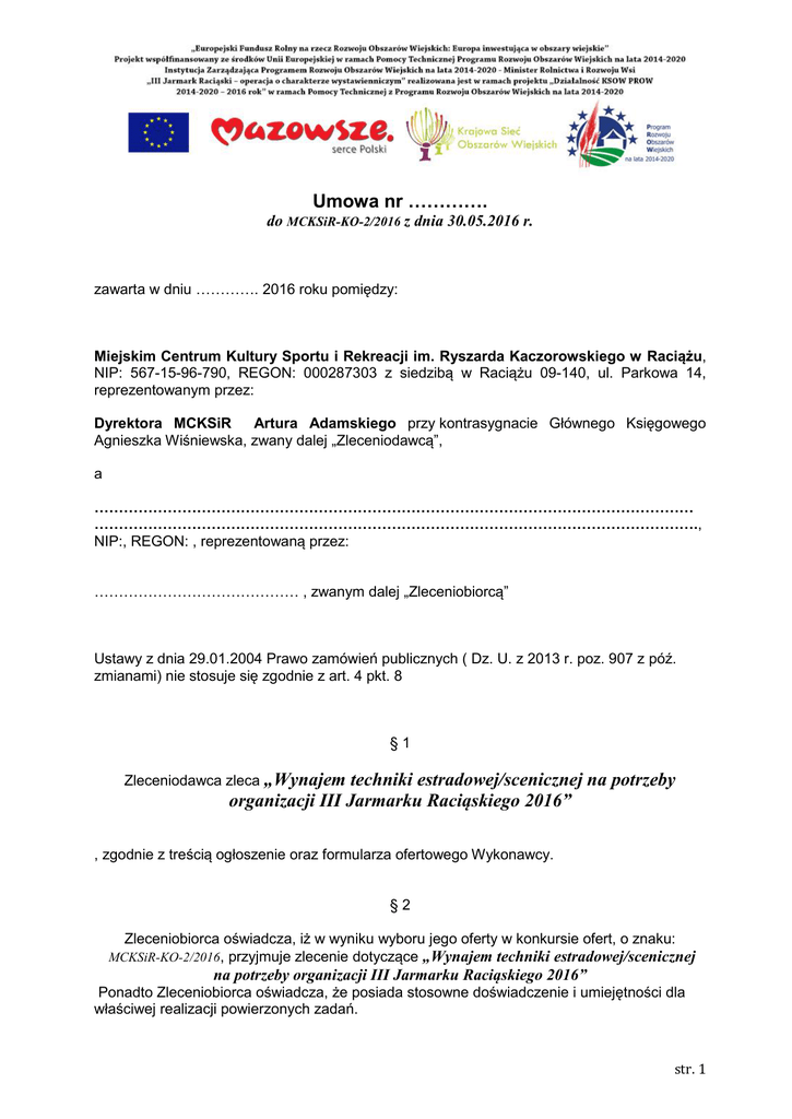 Umowa nr …………. do MCKSiR-KO-2/2016 z dnia 30.05.2016 r. zawarta w dniu …………. 2016 roku pomiędzy: Miejskim Centrum Kultury Sportu i Rekreacji im. Ryszarda Kaczorowskiego w Raciążu, NIP: 567-15-96-790, REGON: 000287303 z siedzibą w Raciążu 09-140, ul. Parkowa 14, reprezentowanym przez: Dyrektora MCKSiR Artura Adamskiego przy kontrasygnacie Głównego Księgowego Agnieszka Wiśniewska, zwany dalej „Zleceniodawcą”, a …………………………………………………………………………………………………………… ……………………………………………………………………………………………………………., NIP:, REGON: , reprezentowaną przez: …………………………………… , zwanym dalej „Zleceniobiorcą” Ustawy z dnia 29.01.2004 Prawo zamówień publicznych ( Dz. U. z 2013 r. poz. 907 z póź. zmianami) nie stosuje się zgodnie z art. 4 pkt. 8 §1 Zleceniodawca zleca „Wynajem techniki estradowej/scenicznej na potrzeby organizacji III Jarmarku Raciąskiego 2016” , zgodnie z treścią ogłoszenie oraz formularza ofertowego Wykonawcy. §2 Zleceniobiorca oświadcza, iż w wyniku wyboru jego oferty w konkursie ofert, o znaku: „Wynajem techniki estradowej/scenicznej na potrzeby organizacji III Jarmarku Raciąskiego 2016” MCKSiR-KO-2/2016, przyjmuje zlecenie dotyczące Ponadto Zleceniobiorca oświadcza, że posiada stosowne doświadczenie i umiejętności dla właściwej realizacji powierzonych zadań. str. 1 §3 1. Przedmiotem umowy jest realizacja zlecenia : Wynajem techniki estradowej/scenicznej (scena, nagłośnienie, oświetlenie, obsługa techniczna, ekran Led, agregat prądotwórczy oraz barierek lekkich oraz ciężkich) wg. wytycznych dotyczących występu zawartych w „raiderach” technicznych zespołów dołączonych jako załącznik do zapytania oraz wg. Minimum określonego przez organizatora (Opis przedmiotu zamówienia na Dzień 2) na potrzeby organizacji III Jarmarku Raciąskiego 2016 odbywającego się w dniach Termin realizacji: Impreza Plenerowa - III Jarmark Raciąski 02-03 Lipca 2016 r. plac Adama Mickiewicza 09-140 Raciąż, ( 02.07.16r. w godzinach 10:00 – 1:00 , 03.07.16r. w godzinach 13:00 – 23:00) §4 1. Za wykonanie przedmiotu umowy, o którym mowa w § 3 Zleceniodawca zapłaci Zleceniobiorcy wynagrodzenie w kwocie …………. zł brutto (słownie: …………….. złotych /100) w tym podatek VAT w wysokości 23 %, tj. w kwocie ………… zł. Płatność nastąpi w jednej części, po wykonaniu usługi oraz dostarczeniu faktury/rachunku. 2. Zapłata dokonana zostanie przelewem na rachunek bankowy Zleceniobiorcy w banku ………………………………..: o nr rachunku: ………………………………. , w terminie 7 dni od dnia doręczenia do siedziby Zleceniodawcy faktury VAT wystawionej dla: Miejskie Centrum Kultury Sportu i Rekreacji im. Ryszarda Kaczorowskiego w Raciążu Ul. Parkowa 14, 09-140 Raciąż NIP: 567-15-96-790 Regon: 000287303 3. Faktura zostanie wystawiona w dniu wykonania usługi. 4. Za dzień zapłaty przyjmuje się dzień obciążenia rachunku Zleceniodawcy. str. 2 §5 1.Strony Umowy postanawiają, że w razie sporów wynikłych z niniejszej umowy lub z nią związanych, będą współdziałać w celu ich ugodowego rozstrzygnięcia. 2.W przypadku braku osiągnięcia porozumienia, o którym mowa w pkt. 1 niniejszego paragrafu Strony poddają spory wynikłe z realizacji Umowy pod rozstrzygnięcie sądu powszechnego właściwego dla siedziby Zleceniodawcy. 3.Za nienależyte wykonanie przez dostawcę umowy w postaci przekroczenia terminu będą naliczane kary umowne w wysokości 0,5 % wartości zamówienia dziennie, począwszy od dnia następnego po dniu umownego terminu dostaw. 4.W takim wypadku Zamawiający ma prawo zlecić wykonanie innej firmie oraz obciążyć kosztami Wykonawcę. 5. Za odstąpienie od wykonania umowy po jej podpisaniu Strony ustalają karę umowną w wysokości – 100 % wartości brutto zawartej umowy. 6. Kary umowne, o których mowa w ust.3 i 4 płatne będą w terminie 14 dni od daty wystawienia przez Zleceniodawcę noty księgowej, przy czym Zleceniodawca ma prawo potrącić karę umowną z wynagrodzenia Wykonawcy. §6 Zmiany i uzupełnienia niniejszej Umowy mogą być dokonywane wyłącznie w formie pisemnego aneksu do Umowy pod rygorem nieważności. §7 W sprawach nie uregulowanych mają zastosowanie odpowiednie przepisy kodeksu cywilnego. §8 Umowę sporządzono w dwóch jednobrzmiących egzemplarzach, jeden dla Zleceniodawcy i jeden dla Zleceniobiorcy, przy czym każdy posiada jednakową moc prawną. ZLECENIODAWCA ZLECENIOBIORCA str. 3