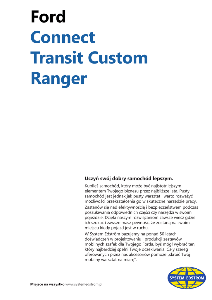Ford Connect Transit Custom Ranger Uczyń swój dobry samochód lepszym. Kupiłeś samochód, który może być najistotniejszym elementem Twojego biznesu przez najbliższe lata. Pusty samochód jest jednak jak pusty warsztat i warto rozważyć możliwości przekształcenia go w skuteczne narzędzie pracy. Zastanów się nad efektywnością i bezpieczeństwem podczas poszukiwania odpowiednich części czy narzędzi w swoim pojeździe. Dzięki naszym rozwiązaniom zawsze wiesz gdzie ich szukać i zawsze masz pewność, że zostaną na swoim miejscu kiedy pojazd jest w ruchu. W System Edström bazujemy na ponad 50 latach doświadczeń w projektowaniu i produkcji zestawów mobilnych szafek dla Twojego Forda, byś mógł wybrać ten, który najbardziej spełni Twoje oczekiwania. Cały szereg oferowanych przez nas akcesoriów pomoże „skroić Twój mobilny warsztat na miarę”. Miejsce na wszystko www.systemedstrom.pl Ford Connect S Rekomendowane ceny sprzedaży. Obowiązują od 2014-01-01 do odwołania. Podane ceny nie zawierają podatku VAT oraz kosztów montażu. Orientacyjny czas składania regału dla doświadczonego montera. Nr art. DxGxW F40060 1241x300x890 mm Nr art. DxGxW F40062 1241x300x890 mm Nr art. DxGxW F40064 1241x300x890 mm Kg Czas € 22 1,9 402,50 Kg Czas € 28 2,2 511,50 Kg Czas € 32 2,8 628,00 Nr art. kg Czas € F40070 79 6,6 1 839,00 Nr art. F40071 Nr art. DxGxW F40061 895x300x890 mm Nr art. DxGxW F40063 980x300x890 mm Nr art. DxGxW F40065 895x300x890 mm kg Czas € 107 8,5 2 397,50 Kg Czas € 31 2,6 624,50 Kg Czas € 36 2,9 792,50 Kg Czas € 42 2,5 917,00 Nr art. kg Czas € F40074 71 6,6 1 639,00 Ford Connect L Rekomendowane ceny sprzedaży. Obowiązują od 2014-01-01 do odwołania. Podane ceny nie zawierają podatku VAT oraz kosztów montażu. Orientacyjny czas składania regału dla doświadczonego montera. Nr art. DxGxW F40080 1633x300x890 mm Nr art. DxGxW F40082 1633x300x890 mm Nr art. DxGxW F40084 1601x300x890/1190 mm Kg Czas € 27 1,9 476,50 Kg Czas € 38 2,5 720,50 Kg Czas € 58 3,4 1 104,50 Nr art. kg Czas € F40090 94 6,6 1 898,00 Nr art. F40093 Nr art. DxGxW F40081 895x300x890 mm Nr art. DxGxW F40083 980x300x890 mm Nr art. DxGxW F40085 895x300x890 mm kg Czas € 111 7,8 2 096,00 Kg Czas € 31 2,6 624,50 Kg Czas € 36 2,9 792,50 Kg Czas € 42 2,5 917,00 Nr art. kg Czas € F40094 79 6,6 1 676,50 Ford Transit Custom 2933 mm Rozstaw osi Rekomendowane ceny sprzedaży. Obowiązują od 2014-01-01 do odwołania. Podane ceny nie zawierają podatku VAT oraz kosztów montażu. Orientacyjny czas składania regału dla doświadczonego montera. Nr art. DxGxW F40700 1878x300x1000 mm Nr art. DxGxW F40702 1878x300x1000 mm Nr art. DxGxW F40704 1878x300x1000/1265 mm Nr art. DxGxW F40706 1846x300x1000 mm Kg Czas € 35 2,7 628,50 Kg Czas € 48 3,4 839,50 Kg Czas € 61 3,7 1 166,00 Kg Czas € 69 4,1 1 426,50 Nr art. DxGxW F40701 1108x300x1000 mm Nr art. DxGxW F40703 1197x300x1000 mm Nr art. DxGxW F40705 1197x300x1000 mm Nr art. DxGxW F40707 1063x470x1000 mm Kg Czas € 41 2,4 761,50 Kg Czas € 46 2,7 929,50 Kg Czas € 57 3,1 1 119,00 Kg Czas € 37 2,0 568,00 Ford Transit Custom 3300 mm Rozstaw osi Rekomendowane ceny sprzedaży. Obowiązują od 2014-01-01 do odwołania. Podane ceny nie zawierają podatku VAT oraz kosztów montażu. Orientacyjny czas składania regału dla doświadczonego montera. Nr art. DxGxW F40720 2270x300x1000 mm Nr art. DxGxW F40722 2270x300x1000 mm Nr art. DxGxW F40724 2270x300x1000/1265 mm Nr art. DxGxW F40726 2238x300x1000 mm Kg Czas € 39 2,7 702,50 Kg Czas € 53 3,4 917,50 Kg Czas € 72 3,7 1 302,00 Kg Czas € 74 4,1 1 474,00 Nr art. DxGxW F40721 1500x300x1000 mm Nr art. DxGxW F40723 1589x300x1000 mm Nr art. DxGxW F40725 1500x300x1000 mm Nr art. DxGxW F40727 1242x470x1000 mm Kg Czas € 51 2,5 925,00 Kg Czas € 57 2,8 1 093,00 Kg Czas € 65 3,4 1 321,00 Kg Czas € 40 2,0 610,00 Ford Ranger Rekomendowane ceny sprzedaży. Obowiązują od 2014-01-01 do odwołania. Podane ceny nie zawierają podatku VAT oraz kosztów montażu. Orientacyjny czas składania regału dla doświadczonego montera. Nr art. DxGxW F40100 1062x300x890 mm Nr art. DxGxW F40102 1062x300x890 mm Nr art. DxGxW F40104 1242x300x505 mm Nr art. DxGxW F11032 1300x350x755 mm Kg Czas € 22 1,9 401,50 Kg Czas € 24 2,0 425,50 Kg Czas € 24 2,9 597,50 Kg Czas € 57 3,3 1 018,50 Nr art. DxGxW F40101 1062x300x890 mm Nr art. DxGxW F40103 1062x300x892 mm Nr art. DxGxW F40105 1176x470x395 mm Nr art. DxGxW F11033 1300x350x755 mm Kg Czas € 26 2,0 535,50 Kg Czas € 34 2,3 672,50 Kg Czas € 42 2,5 935,00 Kg Czas € 58 3,3 1 092,50 Elementy uniwersalne Rekomendowane ceny sprzedaży. Obowiązują od 2014-01-01 do odwołania. Podane ceny nie zawierają podatku VAT oraz kosztów montażu. Orientacyjny czas składania regału dla doświadczonego montera. Wysuwane ramy modułowe Nr art. DxGxW F11080 1210x700 mm Nr art. DxGxW F11082 1210x700 mm Nr art. DxGxW F11084 1210x700 mm Zestaw podstawowy Kg Czas € Nr art. DxGxW Kg Czas € 50 3,3 1 133,00 F3278 786x300x890 mm 12 1,7 234,00 Nr art. DxGxW Kg Czas Kg Czas € 55 3,3 1 202,50 Kg Czas € Nr art. DxGxW 48 3,3 1 075,00 F3279 395x300x890 mm F3282/F3290 999x300/200x890 mm 15/11 1,7 € 266/284 Kg Czas € 9 1,5 143,00 Akcesoria Rekomendowane ceny sprzedaży. Obowiązują od 2014-01-01 do odwołania. Podane ceny nie zawierają podatku VAT oraz kosztów montażu. Orientacyjny czas składania regału dla doświadczonego montera. Wkładki i podziałki do szuflad Pojemniki plastikowe Oświetlenie Zabezpieczenia ładunków Imadła i wysięgniki Uchwyty butli gazowych Stojak na puszki, spraye i kartusze Blokady walizek Transport długich elementów Wieszak na weze Pierwsza pomoc Akcesoria dachowe Opis Cena Nr art. Opis Oświetlenie Cena Akcesoria F8320 Zestaw oswietleniowy - 2 lampy 2,2 h 180,50 € 2753 Wspornik podziałki 3,50 € F8321 Zestaw oswietleniowy - 3 lampy 2,2 h 234,00 € 2754 Podziałka 300x60 mm 3,50 € F8322 Zestaw