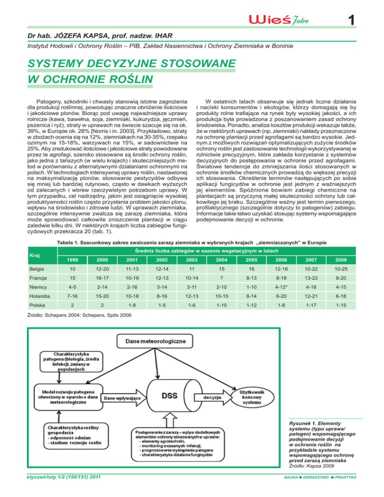 1 Dr hab. Józefa Kapsa, prof. nadzw. IHAR Instytut Hodowli i Ochrony Roślin – PIB, Zakład Nasiennictwa i Ochrony Ziemniaka w Boninie Systemy decyzyjne stosowane w ochronie roślin Patogeny, szkodniki i chwasty stanowią istotne zagrożenia dla produkcji roślinnej, powodując znaczne obniżenie ilościowe i jakościowe plonów. Biorąc pod uwagę najważniejsze uprawy rolnicze (kawa, bawełna, soja, ziemniaki, kukurydza, jęczmień, pszenica i ryż), straty w uprawach na świecie szacuje się na ok. 39%, w Europie ok. 28% [Norris i in. 2003]. Przykładowo, straty w zbożach ocenia się na 12%, ziemniakach na 30-35%, rzepaku ozimym na 15-18%, warzywach na 15%, w sadownictwie na 25%. Aby zredukować ilościowe i jakościowe straty powodowane przez te agrofagi, szeroko stosowane są środki ochrony roślin, jako jedna z tańszych (w wielu krajach) i skuteczniejszych metod w porównaniu z alternatywnymi działaniami ochronnymi na polach. W technologiach intensywnej uprawy roślin, nastawionej na maksymalizację plonów, stosowanie pestycydów odbywa się mniej lub bardziej rutynowo, często w dawkach wyższych od zalecanych i wbrew rzeczywistym potrzebom uprawy. W tym przypadku, cel nadrzędny, jakim jest osiągnięcie wysokiej produktywności roślin często przysłania problem jakości plonu, wpływu na środowisko i zdrowie ludzi. W uprawach ziemniaka, szczególnie intensywnie zwalcza się zarazę ziemniaka, która może spowodować całkowite zniszczenie plantacji w ciągu zaledwie kilku dni. W niektórych krajach liczba zabiegów fungicydowych przekracza 20 (tab. 1). W ostatnich latach obserwuje się jednak liczne działania i naciski konsumentów i ekologów, którzy domagają się by produkty rolne trafiające na rynek były wysokiej jakości, a ich produkcja była prowadzona z poszanowaniem zasad ochrony środowiska. Ponadto, analiza kosztów produkcji wskazuje także, że w niektórych uprawach (np. ziemniaki) nakłady przeznaczone na ochronę plantacji przed agrofagami są bardzo wysokie. Jednym z możliwych rozwiązań optymalizujących zużycie środków ochrony roślin jest zastosowanie technologii wykorzystywanej w rolnictwie precyzyjnym, które zakłada korzystanie z systemów decyzyjnych do postępowania w ochronie przed agrofagami. Światowe tendencje do zmniejszania ilości stosowanych w ochronie środków chemicznych prowadzą do większej precyzji ich stosowania. Określenie terminów następujących po sobie aplikacji fungicydów w ochronie jest jednym z ważniejszych jej elementów. Spóźnione bowiem zabiegi chemiczne na plantacjach są przyczyną małej skuteczności ochrony lub całkowitego jej braku. Szczególnie ważny jest termin pierwszego, profilaktycznego (szczególnie dotyczy to patogenów) zabiegu. Informacje takie łatwo uzyskać stosując systemy wspomagające podejmowanie decyzji w ochronie. Tabela 1. Szacunkowy zakres zwalczania zarazy ziemniaka w wybranych krajach „ziemniaczanych” w Europie Kraj Średnia liczba zabiegów w sezonie wegetacyjnym w latach 1999 2000 2001 2002 2003 2004 2005 2006 2007 2008 Belgia 10 12-20 11-13 12-14 11 15 16 12-16 10-22 10-25 Francja 15 16-17 10-19 12-13 10-14 ? 8-13 8-18 13-22 8-20 Niemcy 4-5 2-14 2-16 3-14 3-11 2-10 1-10 4-12* 4-18 4-15 Holandia 7-16 15-20 10-18 8-16 12-13 10-15 8-14 6-20 12-21 6-18 2 2 1-8 1-5 1-6 1-10 1-12 1-8 1-17 1-15 Polska Źródło: Schepers 2004: Schepers, Spits 2006 Rysunek 1. Elementy systemu (typu uprawa/ patogen) wspomagającego podejmowanie decyzji w ochronie roślin na przykładzie systemu wspomagającego ochronę przed zarazą ziemniaka Źródło: Kapsa 2009 styczeń/luty 1/2 (150/151) 2011 NAUKA ● DORADZTWO ● PRAKTYKA 2 Czym zatem jest system wspomagania decyzji (Decision Suport System)? Najbardziej ogólna definicja określa system wspomagania decyzji w ochronie roślin, jako zbiór instrukcji, mający na celu ułatwienie rolnikowi lub doradcy podjęcia decyzji o wykonaniu zabiegu chemicznego, opartej o informacje meteorologiczne i rachunek ekonomiczny. System decyzyjny składa się z modułów i działa w oparciu o moduł modelu rozwoju zwalczanego agrofaga i utworzone wcześniej moduły – bazy danych specjalistycznych, dotyczące zarówno rośliny chronionej, zwalczanych agrofagów, dostępnych środków ochrony roślin oraz moduły wprowadzanych informacji aktualnych, takich jak dane meteorologiczne, polowe i inne (rys. 1). W systemach doradczych obejmujących wiele agrofagów, proces doradczy rozpoczyna się od identyfikacji szkodnika bądź choroby występującej na badanej plantacji. Użytkownik rozpoczyna pracę z modułem od wyboru trybu identyfikacji agrofaga, korzystając z dostępnych w systemie metod oznaczenia szkodnika (osobnika dorosłego lub stadiów młodocianych) lub choroby na podstawie budowy morfologicznej oraz uszkodzeń roślin. W dalszym etapie identyfikacji można porównać także termin pojawu danego szkodnika lub choroby z terminem pojawienia się charakterystycznych uszkodzeń względem faz rozwojowych rośliny [Kozłowski, Weres 2008]. Do podstawowych modułów będących składowymi systemu decyzyjnego należy także system komunikacji z użytkownikiem. Informacja końcowa w systemach decyzyjnych może być dwojaka: „strategiczna” – dostarczająca informacji o wysokim ryzyku zaistnienia zdarzenia (wystąpienia choroby, pojawu szkodnika) lub „taktyczna” – dostarczająca użytkownikowi systemu informacji czy wykonać ochronny zabieg chemiczny. W ramach unijnego projektu ENDURE dokonano przeglądu systemów wspomagających podejmowanie decyzji w ochronie różnych upraw przed agrofagami w Europie [Been i in. 2009]. Przegląd dokonany w dwudziestu ośmiu krajach wykazał, że w Europie mamy ok. 70 aktualnie działających systemów wspomagania decyzji, których wyniki są dostępne dla rolników lub doradców. Wszystkie systemy zostały ocenione wspólnie przez 11 współpracujących w ramach projektu ENDURE instytucji, według wybranyc