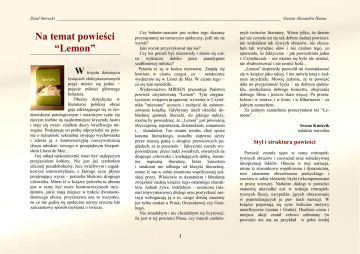 Dział literacki ________________________________________________________________________________________ Gazeta Alexandra Hausa Na temat powieści “Lemon” W trzystu dziesięciu tysiącach zleksykazowanych pojęć mieści się jedno − pojęcie miłości głównego bohatera. Obecny dotychczas w literaturze polskiej obraz geja zderzającego się ze środowiskiem patologicznym i niszowym sypie się niczym rozbite na najdrobniejsze kryształy lustro i staje się zwier- ciadłem duszy wrażliwego mizogina. Podejmuje on próbę odpowiedzi na pytanie o tożsamość seksualną swojego wychowanka i zderza ją z kontrowersyjną rzeczywistością obozu młodzie- żowego w przepięknym hiszpańskim Lloret de Mar… Gej odtąd niekoniecznie musi być najlepszym przyjacielem kobiety. Nie jest już symbolem ulicznej pseudobohemy, lecz wrażliwym i zagadkowym introwertykiem, z którego oczu płynie przejmujący wyraz − potrzeba bliskości drugiego człowieka. Mimo iż w książce potrzeba ta ubrana jest w ramy być może kontrowersyjnych incydentów, jakie mają miejsce w trakcie dwunastodniowego obozu, przyćmiewa ona to wszystko, na co nie godzą się społeczne normy etyczne lub zaściankowy sposób myślenia o świecie. Czy bohater-narrator jest wobec tego skazany przynajmniej na ostracyzm społeczny, jeśli nie na wyrok? Jaki wyrok przyszykował mu los? Czy los potrafi być niezawisły i stanie się coś, co wykracza daleko poza paradygmat szablonowej miłości? Pytania te są w końcu nieistotne. Znajdą się bowiem w cieniu czegoś, co − ostatecznie wydarzyło się w Lloret de Mar. W cieniu tego − co się tam narodziło… Wydawnictwo MIRSEN prezentuje Państwu powieść zatytułowaną "Lemon". Tym enigmatycznym wstępem pragniemy wywołać w Czytelniku "mieszane" uczucia i zachęcić do zainteresowania książką. Gdybyśmy mieli określić dokładniej gatunek literacki, do jakiego należy, można by powiedzieć, że „Lemon” jest powieścią obyczajową, reportażem, dziennikiem, romansem i… skandalem. Ten ostatni termin, choć spoza kanonu literackiego, zostałby zapewne użyty przez starszą panią o skrajnie prawicowych poglądach, za to pozostałe − faktycznie zostały wypowiedziane: przez ludzi światłych, otwartych na drugiego człowieka i kochających dobrą, starannie napisaną literaturę, która kunsztem i smakiem nie odbiega od klasyki literackiej, mimo iż ma w sobie znamiona współczesnej polskiej prozy. Właściwie to dynamizm i fabularna zwięzłość nadają książce tego ostatniego charakteru. Jednak żywe, rzekłabym − sceniczne (niemal trójwymiarowe) dialogi oraz poetyckość narracji wzbogacają ją o to, czego dzisiaj możemy już tylko szukać u Prusa, Orzeszkowej czy Goethego. Nie śmiałabym i nie chciałabym się licytować, ile jest w tej powieści Prusa, czy innych zasłużo- 1 nych twórców literatury. Wiem tylko, że dawno już nie czytało mi się tak dobrze żadnej powieści: nie widziałam tak żywych obrazów, nie słyszałam tak wyraźnie słów i nie czułam tego, co sprawiało, że faktycznie − jak powiedziała jedna z Czytelniczek − nie można się było nie uśmiać, nie zbulwersować i nie uronić łezki… „Lemon” doprawdy pozwolił mi rozsmakować się w książce jako takiej. I nie mówię tutaj o żadnym arcydziele. Mówię jedynie, że ta powieść dała mi przyjemność bycia − na dobrym spektaklu, posłuchania dobrego koncertu, obejrzenia dobrego filmu i jeszcze dużo więcej. Po prostu: byłam i w teatrze, i w kinie, i w filharmonii − za jednym zamachem. Za jednym zamachem przeczytałam też "Lemona". Iwona Kmiecik redaktor naczelna Styl i struktura powieści Powieść została ujęta w ramy retrospektywnych obrazów i rozważań oraz subiektywnej interpretacji faktów. Obecna w niej narracja, mimo iż stosunkowo współczesna i dynamiczna, nosi znamiona obrazowania poetyckiego i zawiera w sobie elementy liryki (wkomponowane w prozę wiersze). Niektóre dialogi w powieści stanowią nierzadko coś w rodzaju retrospektywnych fleszy, uwypukla- jących obrazowanie w poprzedzających je par- tiach narracji. W książce pojawiają się sym- boliczne motywy metafizyczne (szatan i Gruba). Dualizm czasu i miejsca akcji został celowo załamany (w powieści nie ma na przykład w pełni ścisłej Dział literacki ________________________________________________________________________________________ Gazeta Alexandra Hausa chronologii). Całość ma kompozycję quasiklamrową. Iwona Kmiecik redaktor naczelna 2 Dział literacki ________________________________________________________________________________________ Gazeta Alexandra Hausa O pseudorecenzji powieści “Lemon” 29 sierpnia 2011 S zanowni Państwo, w czerwcowym numerze niszowego magazynu „Replika”, powstałego z inicjatywy środowisk LGTB, opublikowany został krótki artykuł Studenta Szkoły Głównej Handlowej w Warszawie, Pana Macieja Krischenbauma, traktujący o mojej debiutanckiej powieści pt. „Lemon”. Ponieważ artykuł popełniony przez wyżej wymienionego Studenta pod względem formalnym (redaktorskim) oraz merytorycznym (dotyczącym tematu) zawiera szereg uchybień − stanowiąc jednocześnie przykład tego, jak nie powinno się pisać recenzji − nie pozostaje mi nic innego, jak ustosunkować się do niżej cytowanego tekstu. Debiutancka powieść Alexandra Hausa nasuwa skojarzenia ze „Śmiercią w Wenecji”, jednak to, delikatnie mówiąc, nie ta klasa, co arcydzieło Tomasza Manna. Właściwie nawet porównywanie obu książek jest bez sensu. Jednak w obu mamy historię zauroczenia polskim chłopcem, miłość ta pozostaje nieodwzajemniona, a akcja jest szczątkowa. Tyle analogii. W „Lemonie” wychowawca kolonijny zakochuje się w swym podopiecznym o tytułowej ksywce i pięknych oczach (co z resztą ciała, niestety raczej się nie dowiadujemy, powieść jest zdumiewająco aseksualna). Obiekt płomiennego uczucia przedstawiony 