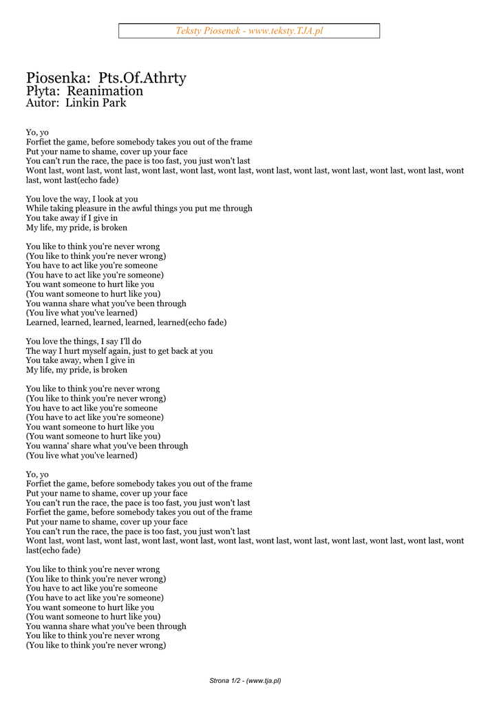 Teksty Piosenek - www.teksty.TJA.pl Piosenka: Pts.Of.Athrty Płyta: Reanimation Autor: Linkin Park Yo, yo Forfiet the game, before somebody takes you out of the frame Put your name to shame, cover up your face You can't run the race, the pace is too fast, you just won't last Wont last, wont last, wont last, wont last, wont last, wont last, wont last, wont last, wont last, wont last, wont last, wont last, wont last(echo fade) You love the way, I look at you While taking pleasure in the awful things you put me through You take away if I give in My life, my pride, is broken You like to think you're never wrong (You like to think you're never wrong) You have to act like you're someone (You have to act like you're someone) You want someone to hurt like you (You want someone to hurt like you) You wanna share what you've been through (You live what you've learned) Learned, learned, learned, learned, learned(echo fade) You love the things, I say I'll do The way I hurt myself again, just to get back at you You take away, when I give in My life, my pride, is broken You like to think you're never wrong (You like to think you're never wrong) You have to act like you're someone (You have to act like you're someone) You want someone to hurt like you (You want someone to hurt like you) You wanna' share what you've been through (You live what you've learned) Yo, yo Forfiet the game, before somebody takes you out of the frame Put your name to shame, cover up your face You can't run the race, the pace is too fast, you just won't last Forfiet the game, before somebody takes you out of the frame Put your name to shame, cover up your face You can't run the race, the pace is too fast, you just won't last Wont last, wont last, wont last, wont last, wont last, wont last, wont last, wont last, wont last, wont last, wont last, wont last(echo fade) You like to think you're never wrong (You like to think you're never wrong) You have to act like you're someone (You have to act like you're someone) You want someone to hurt like you (You want someone to hurt like you) You wanna share what you've been through You like to think you're never wrong (You like to think you're never wrong) Strona 1/2 - (www.tja.pl) Teksty Piosenek - www.teksty.TJA.pl You have to act like you're someone (You have to act like you're someone) You want someone to hurt like you (You want someone to hurt like you) You wanna share what you've been through (You live what you've learned) Ohhhhhhh Ohhhhhhh ***************************************** Polecamy Strony: www.opisy.tja.pl - Codzienie nowe opisy na GG www.rozmowki.tja.pl - Śmieszne Rozmówki www.tapeciarnia.pl - Mnustwo fajnych tapet na pulpit www.teledyski.tja.pl - Zawsze najnowsze teledyski www.lol2.pl - Śmieszne Filmiki, Kabarety www.wkinach.pl - Co jest grane w kinach ? Strona 2/2 - (www.tja.pl)