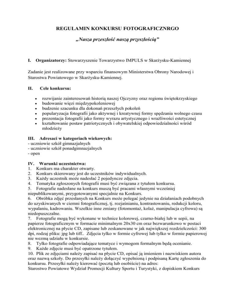 REGULAMIN KONKURSU FOTOGRAFICZNRGO „Nasza przeszłość naszą przyszłością” I. Organizatorzy: Stowarzyszenie Towarzystwo IMPULS w Skarżysku-Kamiennej Zadanie jest realizowane przy wsparciu finansowym Ministerstwa Obrony Narodowej i Starostwa Powiatowego w Skarżysku-Kamiennej. II. Cele konkursu: rozwijanie zainteresowań historią naszej Ojczyzny oraz regionu świętokrzyskiego budowanie więzi międzypokoleniowej budzenie szacunku dla dokonań przeszłych pokoleń popularyzacja fotografii jako aktywnej i kreatywnej formy spędzania wolnego czasu prezentacja fotografii jako formy wyrazu artystycznego i wrażliwości estetycznej kształtowanie postaw patriotycznych i obywatelskiej odpowiedzialności wśród młodzieży III. Adresaci w kategoriach wiekowych: - uczniowie szkół gimnazjalnych - uczniowie szkół ponadgimnazjalnych - open IV. Warunki uczestnictwa: 1. Konkurs ma charakter otwarty. 2. Konkurs skierowany jest do uczestników indywidualnych. 3. Każdy uczestnik może nadesłać 2 pojedyncze zdjęcia. 4. Tematyka zgłoszonych fotografii musi być związana z tytułem konkursu. 5. Fotografie nadesłane na konkurs muszą być pracami własnymi wcześniej niepublikowanymi, przygotowanymi specjalnie na Konkurs. 6. Obróbka zdjęć przesłanych na Konkurs może polegać jedynie na działaniach podobnych do uzyskiwanych w ciemni fotograficznej, tj. rozjaśnianiu, kontrastowaniu, redukcji koloru, wypalaniu, kadrowaniu. Wszelkie inne zmiany (fotomontaż, kolaż, manipulacja cyfrowa) są niedopuszczalne. 7. Fotografie mogą być wykonane w technice kolorowej, czarno-białej lub w sepii, na papierze fotograficznym w formacie minimalnym 20x30 cm oraz bezwarunkowo w postaci elektronicznej na płycie CD, zapisane lub zeskanowane w jak największej rozdzielczości: 300 dpi, rodzaj pliku: jpg lub tiff.. Zdjęcia tylko w formie cyfrowej lub tylko w formie papierowej nie wezmą udziału w konkursie. 8. Tylko fotografie odpowiadające tematyce i wymogom formalnym będą ocenianie. 9. Każde zdjęcie musi być opatrzone tytułem. 10. Plik ze zdjęciami należy zapisać na płycie CD, opisać ją imieniem i nazwiskiem autora oraz nazwą szkoły. Do przesyłki należy dołączyć wypełnioną i podpisaną Kartę zgłoszenia do konkursu. Przesyłki należy kierować (pocztą lub osobiście) na adres: Starostwo Powiatowe Wydział Promocji Kultury Sportu i Turystyki, z dopiskiem Konkurs „Nasza przeszłość naszą przyszłością”, ul. Konarskiego 20 pokój 302, 26-110 SkarżyskoKamienna 11. Nadesłanych na konkurs płyt CD organizator nie zwraca. 12. Zgłaszający zdjęcia do Konkursu uczestnik: • oświadcza, że zdjęcie nie narusza praw lub dóbr osobistych osób trzecich, jest wolne od wad prawnych, a jego treść jest zgodna z obowiązującym prawem; • prawa osób portretowanych zostały wyjaśnione i osoby sportretowane wyrażają zgodę na wystawienie i ich publikowanie również dla celów promocyjnych Konkursu oraz przyjmuje na siebie wszelkie roszczenia jakiejkolwiek natury, które osoby trzecie mogłyby kierować przeciwko organizatorom Konkursu, • przyjmuje warunki Regulaminu Konkursu, • wyraża zgodę na przetwarzanie swoich danych osobowych zgodnie z przepisami Ustawy z 29 sierpnia 1997 r. o ochronie danych osobowych (Dz.U.Nr.133 pozycja 883), • wyraża zgodę na nieodpłatne wykorzystywanie przez Organizatorów Konkursu nadesłanego zdjęcia w dowolnym czasie i formie dla celów promocji Konkursu. V. 1. 2. • • • • Zasady i kryteria oceny: Organizator powołuje Jury, które oceni prace konkursowe. Jury będzie oceniać prace konkursowe według następujących kryteriów: wyraz artystyczny fotografii pomysł na interpretację tematu konkursu walory techniczne zdjęć bogactwo wyobraźni autorów, ich wrażliwość na rzeczywistość. VII. Termin nadsyłania prac konkursowych: 1. Prace należy dostarczyć (osobiście lub przesyłką pocztową) na adres: Starostwo Powiatowe Wydział Promocji Kultury Sportu i Turystyki, z dopiskiem Konkurs „Nasza przeszłość naszą przyszłością”, ul. Konarskiego 20 pokój 302, 26-110 Skarżysko-Kamienna do 19 października 2016r. Prace przesłane po tym terminie nie będą rozpatrywane. VIII. Rozstrzygnięcie konkursu: 1. Jury spośród nadesłanych fotografii konkursowych wybierze 3 najlepsze, które uzyskają I, II i III miejsce w każdej kategorii wiekowej. 2. Jury spośród nadesłanych fotografii wybierze prace, które zostaną pokazane na wystawie pokonkursowej. 3. Uroczyste podsumowanie Konkursu, otwarcie wystawy pokonkursowej oraz wręczenie nagród i dyplomów uczestnikom konkursu odbędzie się 11 listopada 2016 r, w Hotelu Promień w Skarżysku-Kamiennej ul. Legionów 105. IX. Nagrody: Wszyscy uczestnicy otrzymają dyplomy za udział. Laureaci otrzymają nagrody rzeczowe. Nauczyciele/opiekunowie otrzymają dyplomy-podziękowania.