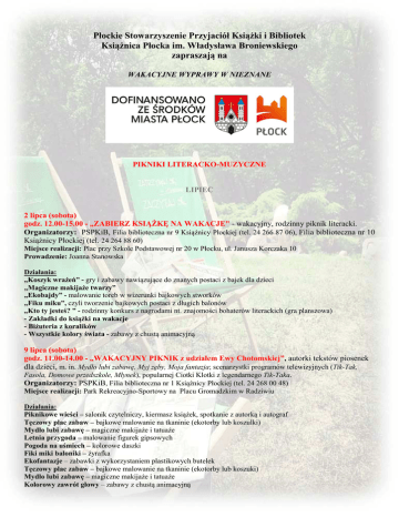 Płockie Stowarzyszenie Przyjaciół Książki i Bibliotek Książnica Płocka im. Władysława Broniewskiego zapraszają na WAKACYJNE WYPRAWY W NIEZNANE PIKNIKI LITERACKO-MUZYCZNE LIPIEC 2 lipca (sobota) godz. 12.00-15.00 - „ZABIERZ KSIĄŻKĘ NA WAKACJE" - wakacyjny, rodzinny piknik literacki. Organizatorzy: PSPKiB, Filia biblioteczna nr 9 Książnicy Płockiej (tel. 24 266 87 06), Filia biblioteczna nr 10 Książnicy Płockiej (tel. 24 264 88 60) Miejsce realizacji: Plac przy Szkole Podstawowej nr 20 w Płocku, ul. Janusza Korczaka 10 Prowadzenie: Joanna Stanowska Działania: „Koszyk wrażeń” - gry i zabawy nawiązujące do znanych postaci z bajek dla dzieci „Magiczne makijaże twarzy” „Ekobajdy” - malowanie toreb w wizerunki bajkowych stworków „Fiku miku”, czyli tworzenie bajkowych postaci z długich balonów „Kto ty jesteś? ” - rodzinny konkurs z nagrodami nt. znajomości bohaterów literackich (gra planszowa) - Zakładki do książki na wakacje - Biżuteria z koralików - Wszystkie kolory świata - zabawy z chustą animacyjną 9 lipca (sobota) godz. 11.00-14.00 - „WAKACYJNY PIKNIK z udziałem Ewy Chotomskiej”, autorki tekstów piosenek dla dzieci, m. in. Mydło lubi zabawę, Myj zęby, Moja fantazja; scenarzystki programów telewizyjnych (Tik-Tak, Fasola, Domowe przedszkole, Młynek), popularnej Ciotki Klotki z legendarnego Tik-Taka. Organizatorzy: PSPKiB, Filia biblioteczna nr 1 Książnicy Płockiej (tel. 24 268 00 48) Miejsce realizacji: Park Rekreacyjno-Sportowy na Placu Gromadzkim w Radziwiu Działania: Piknikowe wieści – salonik czytelniczy, kiermasz książek, spotkanie z autorką i autograf Tęczowy plac zabaw – bajkowe malowanie na tkaninie (ekotorby lub koszulki) Mydło lubi zabawę – magiczne makijaże i tatuaże Letnia przygoda – malowanie figurek gipsowych Pogoda na uśmiech – kolorowe daszki Fiki miki baloniki – żyrafka Ekofantazje – zabawki z wykorzystaniem plastikowych butelek Tęczowy plac zabaw – bajkowe malowanie na tkaninie (ekotorby lub koszuki) Mydło lubi zabawę – magiczne makijaże i tatuaże Kolorowy zawrót głowy – zabawy z chustą animacyjną 10 lipca (niedziela) godz. 12.30-16.00 - „CUDOWNA PODRÓŻ” z udziałem Ewy Chotomskiej Organizatorzy: PSPKiB , Filia biblioteczna nr 12 Książnicy Płockiej (tel. 695 669 774), Filia biblioteczna nr 3 Książnicy Płockiej (tel. 24 268 00 50), Dział zbiorów audiowizualnych (Biblioteka muzyczna tel. 24 262 00 87) Miejsce realizacji: Plac przy Miejskim Przedszkolu nr 2 w Płocku, ul. Ciechomicka 68 Działania: - malowanie figurek gipsowych - wykonanie opaski Myszki Miki - wykonanie Olafa z wykorzystaniem balonu - malowanie toreb (bohaterowie bajek Walta Disneya) - zostań bohaterem bajki Walta Disneya (tektura z otworem - zdjęcia) - zabawy muzyczno-ruchowe - zabawy z chustą animacyjną - wielka gra z bohaterami Walta Disneya (planszowa gra terenowa) - malowanie twarzy - kolorowanka Disneya SIERPIEŃ 25 sierpnia (czwartek) godz. 16.00-18.30 - „ARABSKI PIKNIK RODZINNY” Organizatorzy: PSPKiB, Filia biblioteczna nr 8 Książnicy Płockiej (tel. 24 263 46 92) Miejsce realizacji: Plac przy Szkole Podstawowej nr 23 w Płocku, ul. Walecznych 20 Działania: • spotkanie dzieci z przedstawicielem ambasady Zjednoczonych Emiratów Arabskich w Polsce i zaproszonymi gośćmi, a w tym: - występ dzieci inspirowany kulturą arabską, - występ zaproszonego artysty/animatora, który poprowadzi zabawę nawiązującą do tematyki pikniku, - warsztaty plastyczne dla uczestników pikniku, - gry i zabawy zręcznościowe. Godz. 19.30-6.00 - „Noc z Szeherezadą” dla dzieci z Bibliotecznego Klubu Miłośnika Przygód. ZAJĘCIA CYKLICZNE Zajęcia cykliczne Płockiego Stowarzyszenia Przyjaciół Książki i Bibliotek odbywające się we współpracy i na terenie placówek Partnera - Książnicy Płockiej im. Władysława Broniewskiego w Płocku (obowiązują zapisy, ilość miejsc ograniczona) „W krainie Pani Muzyki” Miejsce realizacji: Dział Zbiorów Audiowizualnych (ul. Kościuszki 3c, tel. 24 262 00 87) e-mail: [email protected] Projekt skierowany do dzieci w wieku 6-15 lat. Terminy i działania: 11-15 lipca 2016 r. oraz 8-12 sierpnia 2016 r., godz. 10.00-12.00 Tańce i zabawy ruchowe przy muzyce dla dzieci: - poznawanie instrumentów muzycznych, - budowanie letniej orkiestry, - prezentacja utworów muzycznych na orkiestrę. „Na własnej skórze” Miejsce realizacji: Biblioteka dla dzieci im. Wandy Chotomskiej (ul. Sienkiewicza 2, tel. 24 262 27 69), e-mail: [email protected] Projekt skierowany do dzieci w wieku 5-10 lat. Terminy i działania: 2-5 sierpnia, 9-12 sierpnia, 17 sierpnia i 24 sierpnia 2016, godz. 15.00-17.00 , 2, 4, 5 sierpnia Przekonaj się, jak to jest być zwycięzcą. Turniej gier logicznych. Zabawy stolikowe z czytelnikami. 3 sierpnia Przekonaj się, jak to jest być artystą cyrkowym, biorąc udział w warsztatach „Dziura w całym”. Spotkanie odkryje tajemnice iluzji, wprowadzi w wesoły nastrój, zachęci do ćwiczeń sprawnościowych. 9, 11, 12 sierpnia Przekonaj się, jak to jest być zwycięzcą. Turniej gier edukacyjnych. Zabawy stolikowe z czytelnikami. 10 sierpnia Przekonaj się, jak to jest być prawdziwym naukowcem. Mali badacze podczas spotkania „Dlaczego woda jest mokra?” poznają wszystkie stany skupienia wody. Pod opieką Szalonego Naukowca wykonają duże i małe bańki mydlane. 17 sierpnia Przekonaj się, jak to jest być aktorem podczas wyjątkowych warsztatów „Słowo w słowo”. Podczas zajęć dzieci poznają różne formy ekspresji scenicznej, m. in. teatr lalek. 24 sierpnia Przekonaj się, jak to jest być malarzem, biorąc udział w warsztatach plastycznych „Kto dmuchnął obraz?”. Każdy stworzy niepowtarzalną pracę, wykorzystując zaskakujące rekwizyty oraz niekonwencjonalne techniki plastyczne. „Kubuś Puchatek na wakacjach” Miejsce realizacji: Filia biblioteczna nr 1 Książnicy Płockiej (ul. Ziel