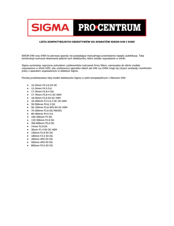 LISTA KOMPATYBILNYCH OBIEKTYWÓW DO APARATÓW NIKON D40 I D40X NIKON D40 oraz D40X to pierwsze aparaty nie posiadające manualnego przeniesienia napędu autofokusa. Taka konstrukcja wymusza stosowanie jedynie tych obiektywów, które zostały wyposaŜone w silniki. Sigma wychodząc naprzeciw potrzebom uŜytkowników lustrzanek firmy Nikon, wprowadza do oferty modele wyposaŜone w silniki HSM, aby uŜytkownicy aparatów takich jak D40 czy D40X mogli się cieszyć swobodą i komfortem pracy z aparatem wyposaŜonym w obiektyw Sigma. PoniŜej przedstawiamy listę modeli obiektywów Sigma w pełni kompatybilnych z Nikonem D40: • • • • • • • • • • • • • • • • • • • • 10-20mm F4-5.6 EX DC 12-24mm F4.5-5.6 17-35mm F2.8-4 DG 17-70mm F2.8-4.5 DC HSM 18-50mm F2.8 EX DC HSM 18-200mm F3.5-6.3 DC OS HSM 50-500mm F4-6.3 DG 50-150mm F2.8 APO EX DC HSM 70-200mm F2.8 DG MACRO 80-400mm F4.5-5.6 100-300mm F4 DG 120-300mm F2.8 DG 300-800mm F5.6 DG 14mm F2.8 EX 30mm F1.4 EX DC HSM 150mm F2.8 EX DG 180mm F3.5 EX DG 300mm APO EX DG 500mm APO EX DG 800mm F5.6 EX DG