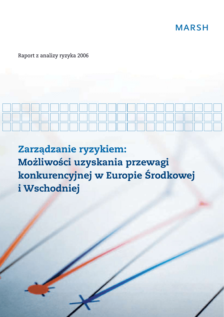 Raport z analizy ryzyka 2006 Zarządzanie ryzykiem: Możliwości uzyskania przewagi konkurencyjnej w Europie Środkowej i Wschodniej Wstęp NINIEJSZY RAPORT stanowi podsumowanie wyników naszego drugiego i najszerszego badania ryzyka, jakie zostało kiedykolwiek przeprowadzone w Europie Środkowej i Wschodniej (CEE). Badanie pokazało, w jak dużym stopniu rosnąca konkurencja i dynamika na rynku CEE wpływają na społeczność biznesową. Mapa regionu CEE Estonia Łotwa Działamy w szybko rozwijającym się środowisku gospodarczym, w którym następują poważne zmiany na skutek wymagań prawnych, poziomu inwestycji zagranicznych i kontroli międzynarodowej. Wszystkie te czynniki stanowią wyzwanie dla dotychczasowego podejścia do zarządzania ryzykiem w regionie. Nasze badanie określa obszary, w których przedsiębiorstwa CEE postrzegają potrzebę znacznej poprawy, koniecznej aby sprostać oczekiwaniom i wymogom zarządzania ryzykiem. Jego wyniki ilustrują także, jak wiele jeszcze firm nie zdobyło przewagi konkurencyjnej, z powodu nieumiejętności zidentyfikowania i zareagowania na zmiany w coraz bardziej dynamicznym środowisku biznesowym. Firma Marsh dokonała analizy postrzegania zarządzania ryzykiem przez 1200 menedżerów wyższego szczebla reprezentujących organizacje z 12 krajów na całym obszarze CEE. Obroty badanych spółek przekraczają 5 milionów euro rocznie (Rysunek 1). Badanie dotyczyło różnych sektorów i branż (Rysunek 2). Zadawaliśmy pytania dotyczące postawy wobec ryzyka, struktur zarządzania ryzykiem i związanych z tym obaw oraz zachowań liderów biznesu i menedżerów sektora publicznego w obszarze ubezpieczeń i zarządzania ryzykiem. Litwa Polska Republika Czeska Słowacja Węgry Słowenia Rumunia Chorwacja Serbia Czarnogóra Bułgaria Rysunek1 Respondenci wg. branż Rolnictwo, myślistwo, leśnictwo i rybołówstwo Produkcja, górnictwo i wydobycie 52 422 Największy sektor w naszej próbie to przedsiębiorstwa produkcyjne, górnicze i wydobywcze, które stanowiły 35% spółek, następnie hurtownie i handel detaliczny - 28%. Energetyka, gaz, wodociągi Transport, magazynowanie i komunikacja 72 Pragnę podziękować wszystkim menedżerom, którzy poświęcili swój czas na wypełnienie naszej ankiety. Bez ich wsparcia i zaangażowania niniejszy raport nie byłby możliwy. Pośrednictwo finansowe i agencje nieruchomości, wynajem 74 Ubezpieczenia społeczne, edukacja i ochrona zdrowia 14 Hotele i restauracje oraz inna działalność 84 Neil Irwin Dyrektor Zarządzający, Dział Rozwoju Działalności, Europa, Środkowy Wschód i Afryka 45 Budownictwo 104 Handel hurtowy i detaliczny, naprawy 333 Rysunek 2 EUROPEJSKI KRAJOBRAZ BIZNESOWY jest w dzisiejszych czasach mocno nieprzewidywalny; znajduje się pod wpływem różnorodnych czynników. Są to: zmiany klimatyczne i mające im przeciwdziałać rygorystyczne wymagania wobec przedsiębiorstw związane z ochroną środowiska, ptasia grypa i realne ryzyko pandemii, agresywna konkurencja z Dalekiego Wschodu oraz ciągle obecne zagrożenie terrorystyczne. Utrzymanie tendencji wzrostowych wymaga od dzisiejszych liderów biznesu w krajach CEE zarządzania ogromną ilością niepewności. Wyzwania dla biznesu Wzrost Ryzyka lub problemy, które mogą w znacznym stopniu ograniczać lub poprawiać zdolność do uzyskania planowanego wzrostu. Nieosiągnięcie celów biznesowych wynikające z braku dokładnych informacji, które pozwoliłyby na odpowiednie reagowanie na konkurencyjne środowisko, zmienność rynku, globalizację, nowych klientów, przyciąganie i zatrzymywanie pracowników oraz zapewnianie nowych inwestycji lub klientów Wydajność Ryzyka lub możliwości wynikające z programów utrzymania zakładu i urządzeń, nowych technologii, poprawy procesów biznesowych, redukcji administracji, pozyskiwania efektywnego kosztowo kapitału / funduszy i poprawa rentowności Zgodność Ryzyka związane z niespełnieniem unijnych lub krajowych przepisów dotyczących ochrony klienta, bhp, ochrony środowiska, ładu korporacyjnego, sprawozdawczości finansowej, itp. Ochrona Ryzyka związane z klęskami żywiołowymi, zniszczeniem majątku i przerwami w działalności, zjawiskami mającymi ujemny wpływ na wyniki, takimi jak ptasia grypa, zmiany klimatyczne, trudne warunki ekonomiczne, terroryzm, stres, planowanie i reagowanie kryzysowe, pożary, powodzie, itp. Poniższy raport rzuca światło na to, w jaki sposób radzą sobie oni z wyzwaniami. Za jego pośrednictwem staramy się także odpowiedzieć na pytanie, czy społeczność biznesowa nadąża za rzeczywistymi ryzykami. Najważniejsze wnioski: maksymalizacja sukcesu poprzez skuteczne zarządzanie ryzykiem DLA LEPSZEGO PRZEDSTAWIENIA WYNIKÓW podzieliliśmy je na cztery różne wyzwania biznesowe (Rysunek 3). Uważamy, że organizacje i ich liderzy muszą dobrze zrozumieć ryzyka związane z tymi obszarami, gdyż dopiero wtedy będą mogli obrać właściwy kurs na przyszłe sukcesy. „W następnym roku do Unii Europejskiej dołączają dwa nowe kraje i jestem pewny, że firmy z tych państw będą bardzo agresywnie zabiegać o klientów z Europy Zachodniej.” Czeska spółka Przystąpienie do Unii Europejskiej w roku 2004 otworzyło ośmiu krajom z naszego regionu drzwi do zachodnioeuropejskich i amerykańskich standardów zarządzania i przepisów. W tym kontekście chcieliśmy poznać najbardziej niepokojące dla liderów biznesu ryzyka oraz to, w jaki sposób nimi zarządzali. Sprawdzaliśmy także, jakie są ewentualne tendencje „wielkiego ryzyka” i czy firmy wiedzą, jak się z nimi zmierzyć. Rysunek 3 * Dla celów niniejszego raportu podzieliliśmy te ryzyka na cztery kategorie, jednak w rzeczywistości są one wzajemnie powiązane. Brak wiedzy o zarządzaniu Formalizacja procesów BADANIE WSKAZUJE na istnienie sporych rozbieżności pomiędzy rodzajami ryzyka, które są szczególnie niepokojące dla respondentów, a ich możliwo