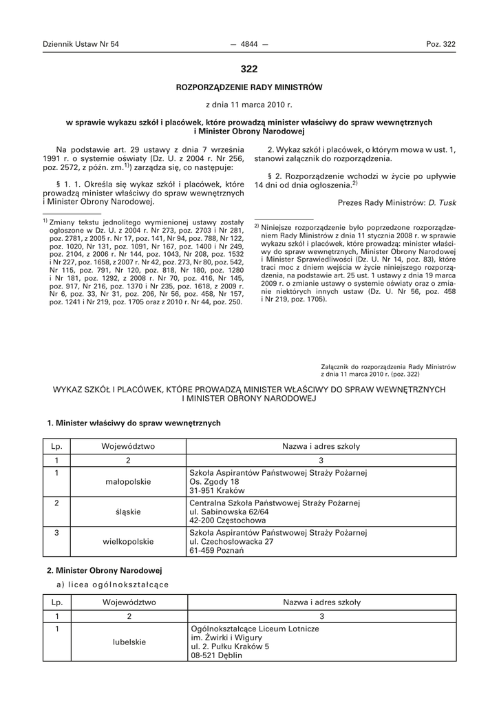 Dziennik Ustaw Nr 54 — 4844 — Poz. 322 322 ROZPORZĄDZENIE RADY MINISTRÓW z dnia 11 marca 2010 r. w sprawie wykazu szkół i placówek, które prowadzą minister właściwy do spraw wewnętrznych i Minister Obrony Narodowej Na podstawie art. 29 ustawy z dnia 7 września 1991 r. o systemie oświaty (Dz. U. z 2004 r. Nr 256, poz. 2572, z późn. zm.1)) zarządza się, co następuje: § 1. 1. Określa się wykaz szkół i placówek, które prowadzą minister właściwy do spraw wewnętrznych i Minister Obrony Narodowej. 1) Zmiany tekstu jednolitego wymienionej ustawy zostały ogłoszone w Dz. U. z 2004 r. Nr 273, poz. 2703 i Nr 281, poz. 2781, z 2005 r. Nr 17, poz. 141, Nr 94, poz. 788, Nr 122, poz. 1020, Nr 131, poz. 1091, Nr 167, poz. 1400 i Nr 249, poz. 2104, z 2006 r. Nr 144, poz. 1043, Nr 208, poz. 1532 i Nr 227, poz. 1658, z 2007 r. Nr 42, poz. 273, Nr 80, poz. 542, Nr 115, poz. 791, Nr 120, poz. 818, Nr 180, poz. 1280 i Nr 181, poz. 1292, z 2008 r. Nr 70, poz. 416, Nr 145, poz. 917, Nr 216, poz. 1370 i Nr 235, poz. 1618, z 2009 r. Nr 6, poz. 33, Nr 31, poz. 206, Nr 56, poz. 458, Nr 157, poz. 1241 i Nr 219, poz. 1705 oraz z 2010 r. Nr 44, poz. 250. 2. Wykaz szkół i placówek, o którym mowa w ust. 1, stanowi załącznik do rozporządzenia. § 2. Rozporządzenie wchodzi w życie po upływie 14 dni od dnia ogłoszenia.2) Prezes Rady Ministrów: D. Tusk 2) Niniejsze rozporządzenie było poprzedzone rozporządzeniem Rady Ministrów z dnia 11 stycznia 2008 r. w sprawie wykazu szkół i placówek, które prowadzą: minister właściwy do spraw wewnętrznych, Minister Obrony Narodowej i Minister Sprawiedliwości (Dz. U. Nr 14, poz. 83), które traci moc z dniem wejścia w życie niniejszego rozporządzenia, na podstawie art. 25 ust. 1 ustawy z dnia 19 marca 2009 r. o zmianie ustawy o systemie oświaty oraz o zmianie niektórych innych ustaw (Dz. U. Nr 56, poz. 458 i Nr 219, poz. 1705). Załącznik do rozporządzenia Rady Ministrów z dnia 11 marca 2010 r. (poz. 322) WYKAZ SZKÓŁ I PLACÓWEK, KTÓRE PROWADZĄ MINISTER WŁAŚCIWY DO SPRAW WEWNĘTRZNYCH I MINISTER OBRONY NARODOWEJ 1. Minister właściwy do spraw wewnętrznych Lp. Województwo Nazwa i adres szkoły 1 2 3 1 małopolskie 2 śląskie 3 wielkopolskie Szkoła Aspirantów Państwowej Straży Pożarnej Os. Zgody 18 31-951 Kraków Centralna Szkoła Państwowej Straży Pożarnej ul. Sabinowska 62/64 42-200 Częstochowa Szkoła Aspirantów Państwowej Straży Pożarnej ul. Czechosłowacka 27 61-459 Poznań 2. Minister Obrony Narodowej a ) lic e a ogó l n o ksz tał cące Lp. Województwo Nazwa i adres szkoły 1 2 3 1 lubelskie Ogólnokształcące Liceum Lotnicze im. Żwirki i Wigury ul. 2. Pułku Kraków 5 08-521 Dęblin Dziennik Ustaw Nr 54 — 4845 — Poz. 322 b) pr z e ds z k o l a Lp. Województwo Nazwa i adres przedszkola 1 2 3 1 lubelskie Przedszkole Wojskowe Nr 3 przy JW 4824 Osiedle Stawy 62 08-530 Dęblin Przedszkole Wojskowe Nr 84 ul. Waszkiewicza 17 66-440 Skwierzyna 2 lubuskie Przedszkole Wojskowe Nr 88 69-211 Wędrzyn Przedszkole Wojskowe Nr 94 ul. Świerkowa 2 68-100 Żagań 3 łódzkie Przedszkole Wojskowe Nr 129 Nowy Glinnik bl. 6 97-217 Lubochnia Przedszkole Wojskowe Nr 147 95-043 Lężnica Wielka Przedszkole Wojskowe Nr 12 ul. Oficerska 2 05-131 Zegrze 4 mazowieckie Przedszkole Wojskowe Nr 26 w Kazuniu Nowym 05-152 Czosnów Przedszkole Wojskowe Nr 32 przy JW 2474 Osiedle Wojskowe 05-127 Białobrzegi 5 pomorskie Przedszkole Nr 101 ul. Osiedle na Skarpie 2 84-313 Siemirowice Przedszkole Wojskowe Nr 63 ul. Świerczewskiego 8 77-330 Czarne Przedszkole Wojskowe Nr 36 ul. Sucharskiego 19 14-500 Braniewo 6 7 warmińsko-mazurskie zachodniopomorskie Przedszkole Wojskowe Nr 145 w Bemowie Piskim ul. Przedszkolaków 193 12-230 Biała Piska Przedszkole Wojskowe Nr 37 ul. Pancerniaków 5 78-524 Złocieniec Przedszkole Wojskowe Nr 137 ul. Osiedle XXX-lecia Ludowego Lotnictwa Polskiego 9 78-651 Mirosławiec Górny