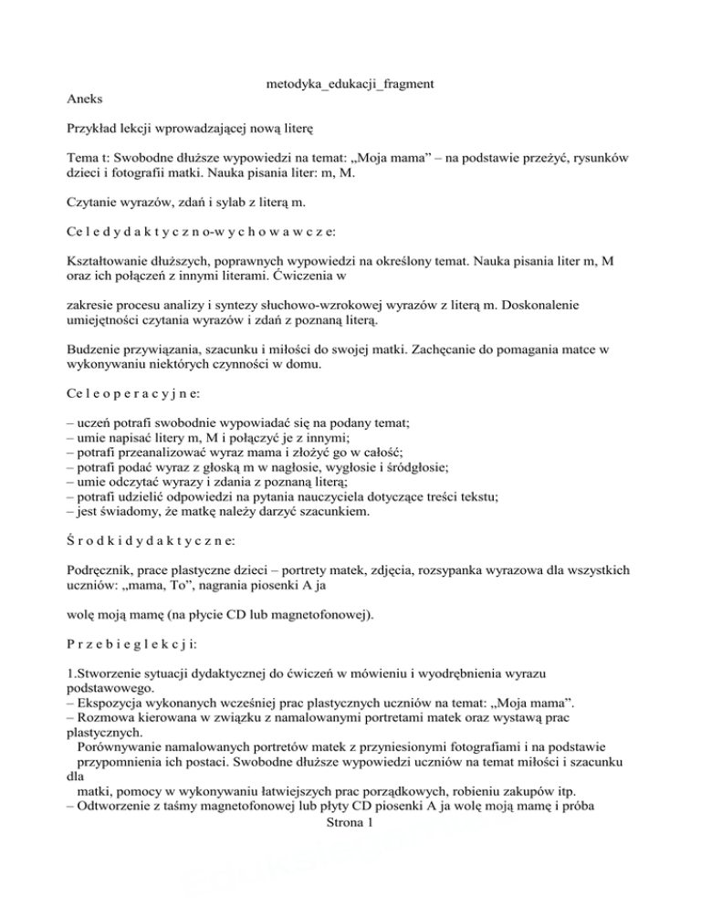 metodyka_edukacji_fragment Aneks Przykład lekcji wprowadzającej nową literę Tema t: Swobodne dłuŜsze wypowiedzi na temat: „Moja mama” – na podstawie przeŜyć, rysunków dzieci i fotografii matki. Nauka pisania liter: m, M. Czytanie wyrazów, zdań i sylab z literą m. Ce l e d y d a k t y c z n o-w y c h o w a w c z e: Kształtowanie dłuŜszych, poprawnych wypowiedzi na określony temat. Nauka pisania liter m, M oraz ich połączeń z innymi literami. Ćwiczenia w zakresie procesu analizy i syntezy słuchowo-wzrokowej wyrazów z literą m. Doskonalenie umiejętności czytania wyrazów i zdań z poznaną literą. Budzenie przywiązania, szacunku i miłości do swojej matki. Zachęcanie do pomagania matce w wykonywaniu niektórych czynności w domu. Ce l e o p e r a c y j n e: – uczeń potrafi swobodnie wypowiadać się na podany temat; – umie napisać litery m, M i połączyć je z innymi; – potrafi przeanalizować wyraz mama i złoŜyć go w całość; – potrafi podać wyraz z głoską m w nagłosie, wygłosie i śródgłosie; – umie odczytać wyrazy i zdania z poznaną literą; – potrafi udzielić odpowiedzi na pytania nauczyciela dotyczące treści tekstu; – jest świadomy, Ŝe matkę naleŜy darzyć szacunkiem. Ś r o d k i d y d a k t y c z n e: Podręcznik, prace plastyczne dzieci – portrety matek, zdjęcia, rozsypanka wyrazowa dla wszystkich uczniów: „mama, To”, nagrania piosenki A ja wolę moją mamę (na płycie CD lub magnetofonowej). P r z e b i e g l e k c j i: 1.Stworzenie sytuacji dydaktycznej do ćwiczeń w mówieniu i wyodrębnienia wyrazu podstawowego. – Ekspozycja wykonanych wcześniej prac plastycznych uczniów na temat: „Moja mama”. – Rozmowa kierowana w związku z namalowanymi portretami matek oraz wystawą prac plastycznych. Porównywanie namalowanych portretów matek z przyniesionymi fotografiami i na podstawie przypomnienia ich postaci. Swobodne dłuŜsze wypowiedzi uczniów na temat miłości i szacunku dla matki, pomocy w wykonywaniu łatwiejszych prac porządkowych, robieniu zakupów itp. – Odtworzenie z taśmy magnetofonowej lub płyty CD piosenki A ja wolę moją mamę i próba Strona 1 metodyka_edukacji_fragment zaśpiewania tej piosenki. – DłuŜsze, kilkuzdaniowe wypowiedzi dzieci na temat ich matek, np.: imię, zawód, kolor włosów, oczu, wzrost i inne charakterystyczne cechy fizyczne i psychiczne. Praca w domu i zawodzie, opieka nad dziećmi. Inne dodatkowe obowiązki mamy? Co ja lubię robić wspólnie z mamą? W jaki sposób mogłabym (mógłbym) pomoc swojej mamie i za co ją kocham? Przykład wypowiedzi: Moja mama ma na imię Zofia. Pracuje w przychodni lekarskiej. Jest średniego wzrostu, ma ciemne, brązowe oczy i kręcone włosy. Często śmieje się i lubi Ŝartować, nawet podczas trudnych zajęć w domu lub wspólnych spacerów. Bardzo kocha mnie i młodszego brata. Często bawi się z nami i pomaga nam w nauce, choć bardzo duŜo pracuje nawet w nocy. Wspólnie wyjeŜdŜamy na wycieczki za miasto, do ZOO, do muzeum. Jestem bardzo szczęśliwy, Ŝe mam taką dobrą i pracowitą mamę i dlatego ją kocham. – Ćwiczenia śródlekcyjne na tle muzyki. Improwizacja ruchowa na temat: „Pomagam mamusi podczas prac domowych”. 2.Analiza i synteza słuchowa wyrazu podstawowego mama. – Wymawianie wyrazu podstawowego sylabami z klaskaniem w dłonie. – Staranne wymawianie głoskami wyrazu mama z równoczesną jego syntezą. Liczenie głosek w tym wyrazie i przyporządkowanie im takiej samej liczby kolorowych nakrywek. – WyróŜnianie samogłosek i spółgłosek w wyrazie mama, liczenie ich. Wymawianie samogłosek w wyrazie podstawowym. – Podawanie wyrazów zawierających literę m, zaczynających się i kończących na tę literę. 3.Analiza i synteza wzrokowa wyrazu podstawowego mama. – Wklejenie zdjęcia mamy do zeszytu oraz poprawne odczytanie podpisu złoŜonego z liter drukowanych: mama, To. – UłoŜenie poprawne podpisu z rozsypanki i wklejenie go do zeszytu. – Wyodrębnienie litery m z wyrazu podstawowego mama. 4.Nauka pisania liter m, M i ich połączeń z samogłoskami a, o, e, i. – Prezentacja wzoru liter pisanych m, M. – Analiza kształtu liter m, M. – Demonstrowanie sposobu pisania liter m, M przez nauczyciela na tablicy w duŜym formacie, a potem w liniaturze. – Wodzenie bezśladowe po liniach tworzących literę. Pisanie w powietrzu i na ławce. – Pisanie liter w zeszycie ćwiczeniowym po śladach i bez śladów, w duŜym i normalnym formacie. – Prezentacja łączenia nowych liter pisanych z samogłoskami (ma, mo, mi, mu). – Czytanie i przepisywanie sylab do zeszytu. Strona 2 metodyka_edukacji_fragment 5.Pisanie wyrazu podstawowego mama. – Prezentacja pisania wyrazu podstawowego przez nauczyciela na tablicy i w liniaturze. – Pisanie wyrazów: mama, mamo, mam. 6.Czytanie przez uczniów tekstu z podręcznika. – Wyszukiwanie i podkreślenie wyrazu podstawowego oraz innych wyrazów z literą m. – Odczytywanie i łączenie w pary identycznych lub podobnych wyrazów z literą m. – Samodzielne podpisanie przez dzieci (na odwrocie) portretu malarskiego mamy (To mama). Strona 3