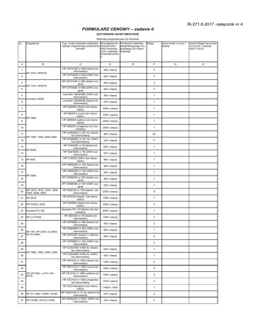 Ri.271.6.2017 -załącznik nr 4 FORMULARZ CENOWY – zadanie II ZESTAWIENIE ASORTYMENTOWE Materiały eksploatacyjne do drukarek Lp. Urządzenie A Typ, model materiału eksploata- Wymagania docyjnego oryginalnego producenta tyczące ilości drukarki stron drukowanych z jednego tonera/atrament u B Producent materiału Waga eksploatacyjnego oryginalnego lub równoważnego C D HP CZ101AE nr 650 (black) lub równoważny 360 i więcej 4 2 HP CZ102AE nr 650 (CMY) lub równoważny 200 i więcej 3 3 HP CZ101AE nr 650 (black) oryginał 360 i więcej 3 4 HP CZ102AE nr 650 (CMY) oryginał 200 i więcej 2 5 Lexmark 18C0035E (CMY) lub równoważny 450 i więcej 1 6 Lexmark 18C0034E (black) lub równoważny 475 i więcej 1 7 HP Q6000A (black) lub równoważny 2500 i więcej 1 8 HP Q6001A (cyan) lub równoważny 2000 i więcej 1 9 HP Q6002A (yellow) lub równoważny 2000 i więcej 1 10 HP Q6003A (magenta) lub równoważny 2000 i więcej 1 HP CH563EE nr 301 XL (black) lub równoważny 480 i więcej 22 12 HP CH564EE nr 301 XL (CMY) lub równoważny 330 i więcej 11 13 HP 51645AE nr 45 (black) lub równoważny 830 i więcej 1 14 HP C6578AE nr 78 (CMY) lub równoważny 970 i więcej 1 15 HP C1823D (CMY) lub równoważny 460 i więcej 1 16 HP CN692AE nr 704 (black) lub równoważny 480 i więcej 1 17 HP CN693AE nr 704 (CMY) lub równoważny 200 i więcej 1 18 HP CN692AE nr 704 (black) oryginał 480 i więcej 1 19 HP CN693AE nr 704 (CMY) oryginał 200 i więcej 1 20 HP 1010, 1012, 1018, 1020, 1022, 3030, 3052 HP Q2612A nr 12A (black) lub równoważny 2000 i więcej 9 21 HP 2015 HP Q7553X (black) lub równoważny 7000 i więcej 1 22 HP P2035, 2030 HP CE505A (black) lub równoważny 2300 i więcej 3 23 Kyocera FS 720 Kyocera TK-110 (black) lub równoważny 6000 i więcej 1 HP CB435A nr 35 (black) lub równoważny 1500 i więcej 4 25 HP C8765EE nr 338 (black) lub równoważny 450 i więcej 2 26 HP C9363EE nr 344 (CMY) lub równoważny 560 i więcej 1 HP C8767EE (black) nr 339 lub równoważny 800 i więcej 2 1 HP 1015, HP2515 HP 1015, HP2515 Lexmark X3530 HP 1600 11 HP 1000, 1050, 2050,3000 HP 930C HP R45 HP 2060 24 27 HP LJ P1005 HP 100, HP 2355, DJ 8450, HP DJ 6940 E F 28 HP C8766EE nr 343 (CMY) lub równoważny 29 HP CC641EE nr300 XL (black) lub równoważny 600 i więcej 1 30 HP CC644EE nr300 XL (CMY) lub równoważny 440 i więcej 1 31 HP CE310A nr 126A (black) lub równoważny 1200 i więcej 5 32 HP CE311A nr 126A (cyan) lub równoważny 1000 i więcej 3 HP CE312A nr 126A (yellow) lub równoważny 1000 i więcej 3 34 HP CE313A nr 126A (magenta) lub równoważny 1000 i więcej 3 35 HP CE314A(bęben) lub równoważny 14000 i 7000 1 36 HP DJ 1560, F2280, F4180 HP C9351CE nr 21 XL (black) lub równoważny 475 i więcej 4 HP F2280, HP DJ F4180 HP C9352CE nr 22XL (CMY) lub równoważny 415 i więcej 4 HP 1600, 1660, 2480, 2560 33 37 HP CP1025, LJ Pro 100 M175 4 Cena brutto w zł za 1 sztukę G Koszt (Waga*cena brutto w zł za 1 sztukę) Kol.F* Kol.G H Ri.271.6.2017 -załącznik nr 4 38 HP C9351CE nr 21 XL (black) oryginał 475 i więcej 1 39 HP C9352CE nr 22XL (CMY) oryginał 415 i więcej 1 40 HP CC530A (black) lub równoważny 3500 i więcej 3 41 HP CC531A (cyan) lub równoważny 2800 i więcej 2 42 HP CC532A (yellow) lub równoważny 2800 i więcej 2 43 HP CC533A (magenta) lub równoważny 2800 i więcej 2 44 Konica Minolta A0V301H (black) lub równoważny 2500 i więcej 1 45 Konica Minolta A0V30CH (magenta) lub równoważny 2500 i więcej 1 46 Konica Minolta A0V306H (yellow) lub równoważny 2500 i więcej 1 47 Konica Minolta A0V30HH (cyan) lub równoważny 2500 i więcej 1 Konica Minolta bęben CMYK A0VU0Y1 lub równoważny Black 45000 i więcej, color 11200 i więcej 1 49 Grzałka A12J022 50000 i więcej 1 50 Konica Minolta P1710-5670-02 (black) lub równoważny 6000 i więcej 1 20000 i więcej 1 HP CP2025 Konica Minolta 1680 48 Konica Minolta 1380 MF 51 Konica-Minolta bęben 1710568001 (black) Lub równoważny 52 Epson C13S050611 (yellow) lub równoważny 2000 i więcej 2 53 Epson C13S050612 (magenta) lub równoważny 1400 i więcej 2 54 Epson C13S050613 (cyan) lub równoważny 1400 i więcej 2 55 Epson C13S050614 (black) lub równoważny 2000 i więcej 2 56 HP CE285A (black) lub równoważny 1600 i więcej 20 57 HP CB540A (black) lub równoważny 2200 i więcej 6 58 HP CB541A (cyan) lub równoważny 1400 i więcej 6 HP CB542A (yellow) lub równoważny 1400 i więcej 6 60 HP CB543A (magenta) lub równoważny 1400 i więcej 6 61 HP C8727AE nr 27 (black) lub równoważny 220 i więcej 3 HP C8728AE (CMY) nr 28 lub równoważny 190 i więcej 1 Lexmark X340H11G (black) lub równoważny 6000 i więcej 3 Lexmark X340H22G lub równoważny 30000 i więcej 1 Samsung MLT-D1052L (black) lub równoważny 2500 i więcej 8 Samsung ML-2250D5 (black) lub równoważny 5000 i więcej 3 Samsung MLT-D1082S (black) lub równoważny Epson CX17NF 59 HP LJ 1102 HP LJ 1312, HP 1515, CM1312 HP 3650 62 63 Lexmark X342N 64 65 Samsung ML-2525, ML-2580, SCX-4623FN, SCX-4600, 2540, 66 Samsung ML 2251 N 67 Samsung ML-1640 1500 i więcej 1 68 Samsung ML-1630, SCX 4500 Samsung ML-D1630A (black) lub równoważny 2000 i więcej 2 Samsung SCX-4521F Samsung MLT-D119S (black) lub równoważny 2000 i więcej 1 Samsung ML-1520 Samsung ML-1520D3 (black) lub równoważny 3000 i więcej 1 Samsung ML-1610 Samsung ML-1610D2 (black) lub równoważny 2000 i więcej 1 72 Brother LC-1100HYBK (black) lub równoważny 900 i więcej 1 73 Brother LC-1100HYC (cyan) lub równoważny 750 i więcej 1 74 Brother LC-1100HYY (yellow) lub równoważny 750 i więcej 1 75 Brother LC-1100HYM (magenta) lub równoważny 750 i więcej 1 76 Canon CLI-525BK (black) lub równoważny 350 i więcej 1 77 Canon CLI-526BK (black) lub równoważny 500 i więcej 1 Canon CLI-526Y (yellow) lub równoważny 500 i więcej 1 69 70 71 78 Brother 6490 AK Brother 6490 AK Canon PIXMA MG-5250 Canon PIXMA MG-5250 Ri.271.6.2017 -załącznik nr 4 79 Canon CLI-52M (magenta) lub równoważny 500 i