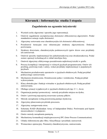 obowiązują od dnia 1 grudnia 2012 roku Kierunek : Informatyka studia I stopnia Zagadnienia na egzamin inżynierski 1. Wymień cechy algorytmu i sposoby jego reprezentacji. 2. Omówić zagadnienie asymptotycznej złożoności obliczeniowej algorytmów. Podać standardowe notacje rzędu złożoności. 3. Algorytmy sortowania oraz charakterystyka ich złożoności obliczeniowej. 4. Przedstawić iteracyjne oraz rekurencyjne struktury algorytmiczne. Dokonać porównania. 5. Struktury drzewiaste, charakterystyka podstawowych typów drzew oraz przykłady ich zastosowań. 6. Omówić sposoby implementacji list jednokierunkowej oraz dwukierunkowej. Podać zestaw operacji wchodzących w skład interfejsu listy. 7. Omówić algorytmy efektywnego poszukiwania najkrótszej ścieżki w grafie. 8. Procesy kompilacji i interpretacji w różnych językach programowania. Omów ich przebieg, porównaj wady i zalety, wskaż przykłady implementacji w popularnych językach. 9. Mechanizm przeładowanie operatorów w językach obiektowych. Podaj przykład praktycznego zastosowania. 10. Mechanizm dziedziczenia. Dziedziczenie jedno i wielokrotne. Podaj przykład wykorzystania. 11. Klasy abstrakcyjne i funkcje wirtualne w językach obiektowych. Podaj przykład zastosowania. 12. Obsługa sytuacji wyjątkowych w językach obiektowych (np. C++, Java). 13. Organizacja pamięci pomocniczej - metody przydziału miejsca na dysku; 14. Omów i porównaj najczęściej stosowane systemy plików. 15. Metody zarządzania wolną przestrzenią pamięci dyskowej. 16. Algorytmy planowania przydziału procesora. 17. Algorytmy zastępowania stron. 18. Schematy RAID (Redundant Array of Independent Disks). Porównanie pod kątem niezawodności i wydajności. 19. Omów metody zarządzania pamięcią. 20. Mechanizmy komunikacji międzyprocesowej IPC (Inter Process Communication). 21. Układy elektroniczne jako filtry. Klasyfikacja i przykłady zastosowań. 22. Wzmacniacz operacyjny. Parametry charakterystyczne, zastosowania. Strona 1 z 3 obowiązują od dnia 1 grudnia 2012 roku 23. Bramki i funktory logiczne. Tabele prawdy. Minimalizacja funkcji. 24. Układy sekwencyjne. Przykłady realizacji i obszary zastosowań. 25. Sumator równoległy. Sumator a jednostka arytmetyczno- logiczna. 26. Budowa i zasada działania procesorów: potokowy, wektorowy, CISC, RISC. 27. Klasyfikacja architektur komputerowych. 28. Systemy przerwań. Aspekty sprzętowe i programowe. 29. Omówić podstawowe tryby adresowania: 30. Formaty i typy rozkazów procesora, wpływ długości rozkazów procesora na wielkość zajmowanej pamięci przez program oraz na jego czas wykonania. 31. Typy i hierarchia pamięci w systemie komputerowym. 32. Omów metody projektowania baz danych. 33. Omów relacyjny model danych. 34. Na czym polega proces normalizacji baz danych 35. Przedstawić koncepcję transakcyjności w relacyjnych bazach danych. 36. Techniki modelowania bazy danych, diagramy E/R i UML, narzędzia do modelowania. 37. Problemy współbieżności i wielodostępu w SZBD. 38. Model ISO OSI. Model TCP/IP. Krótka charakterystyka warstw modelu. 39. Metody dostępu do medium. Protokół CSMA/CD. 40. Adresowanie IP, podsieci i maski podsieci zmiennej długości. 41. Ruting w sieciach komputerowych, metody rutingu, porównanie. 42. Metody dostępu do sieci w technologii bezprzewodowej WiFi. 43. Podstawowe i złożone topologie sieci komputerowych. 44. Charakterystyka systemów rozproszonych - zalety i wady. 45. Modele programowania równoległego. 46. Miary efektywności obliczeń równoległych. 47. Środowiska programowania równoległego. 48. Prawo Amdahla. 49. Obrazy rastrowe i wektorowe: budowa, właściwości, różnice. 50. Grafika rastrowa - prymitywy graficzne 2D: kreślenie odcinków, okręgów, wypełnianie obszarów. 51. Algorytmy poprawy jakości obrazu rastrowego. 52. Metody skalowania obrazów rastrowych. 53. Modele barw stosowane w grafice komputerowej (RGB, CMY, HSV, LAB). 54. Cykl życia oprogramowania. 55. Model kaskadowy i spiralny, charakterystyka i porównanie. Strona 2 z 3 obowiązują od dnia 1 grudnia 2012 roku 56. Metryki oprogramowania, przykłady i obszary zastosowań. 57. Specyfikacja wymagań funkcjonalnych i niefunkcjonalnych, rola UML w procesie specyfikowania wymagań. 58. Model logiczny a model fizyczny systemu – rola w procesie tworzenia oprogramowania. 59. UML w analizie i projektowaniu – omówienie podstawowych cech notacji. 60. Diagramy stanu oraz diagramy sekwencji, porównanie obszarów stosowania. 61. Testowanie oprogramowania, omówić model V. 62. Podstawowe pojęcia niezawodności systemów technicznych, niezawodność systemów oprogramowania, miary niezawodności. 63. Proces zarządzania bezpieczeństwem systemów informatycznych, polityka bezpieczeństwa. 64. Kryptosystemy symetryczne oraz metody dystrybucji kluczy w systemach symetrycznych. 65. Kryptografia asymetrycznej w zagadnieniach bezpieczeństwa sieciowych systemów komputerowych – przykłady zastosowań. 66. Podpis elektroniczny a podpis cyfrowy, definicje, przykłady zastosowań. 67. Zapory ogniowe – pojęcia podstawowe, obszary zastosowań. 68. Systemy wykrywania zagrożeń (IDS) – koncepcja, zasady lokalizacji sondy. 69. Wirtualne sieci prywatne (VPN) - koncepcja, przykłady zastosowań, stosowane protokoły. 70. Wyjaśnij określenie "exploitation-exploration trade-off" w kontekście próby definicji sztucznej inteligencji. 71. Na czym polega uczenie sieci neuronowej algorytmem typu backpropagation. 72. Omów podstawowe metody bezstratnej i stratnej kompresji danych. 73. Wymień standardowe metody kompresji sygnałów multimedialnych: obrazów nieruchomych, dźwięku, video. Omów dokładniej jedną z nich. Strona 3 z 3