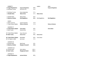 KOBIETY 8 Target Niepołomice 8 Perfekcja Tarnów Kasprzyk Magdalena Bezlowska Ewa 54 s 54 s srebro 2 Perfekcja Tarnów 2 Arkadia Kalisz Kocan Agnieszka Sikora Anna 57 s 57 s Sikora Anna 1 Arkadia Kalisz 1 Maximus Kraków Sikora Anna Rak Magdalena 60 s 60 s Rak Magdalena 1 Walkira Chorzów 1 Triada Piekary Śląskie Cyprian Karkosika Mateusz Rabsztyn 57 k 57 k JUNIORZY 57 2 Triada Piekary Sląskie 2 Ronin Tychy Cios Łukasz Kosma Artur 57 j 57 j 25 Triada Piekary Śląskie 25 Ronin Tychy Figura Sławomir Kosma Artur 57 j 57 j 26 Triada Piekary Sląskie 26 Pro Fighter Lublin Cios Łukasz Sęk Łukasz 57 j 57 j Bąk Patryk Borgiasz Krzysztof 60 j 60 j Góra Adrian Długajczyk Daniel 63,5 j 63,5 j złoto Kasprzyk Magdalena Rak Magdalena KADECI JUNIORZY 60 3 Arkadia Kalisz 3 Maximus Kraków JUNIORZY 63,5 14 Arkadia Kalisz 14 Ronin Tychy JUNIORZY 67 4 Target Niepołomice Karlinski Michal 67 j Mateusz Rabsztyn Cios Łukasz Kosma Artur Cios Łukasz 4 Target Niepołomice Opiela Artur 67 j 32 Target Niepołomice 32 Muaythai Kielce Karlioski Michał Siwonia Karol 67 j 67 j Karlinski Michal 33 Target Niepołomice 33 Target Niepołomice Opiela Artur Mirochna Łukasz 67 j 67 j Opiela Artur JUNIORZY 71 9 Arkadia Kalisz 9 Krak-sport Kraków Kopacki Piotr Kacparek Kamil 71 j 71 j JUNIORZY 75 15 Ronin Tychy 15 Brutals Łódz Wójcik Jakub Kucioski Dawid 75 j 75 j JUNIORZY 81 31 Pro-Fighter Lublin 31 Ronin Tychy Kuszewski Piotr Wojtynek Sławomir 81 j 81 j SENIORZY 60 6 Arkadia Sieradz Dawid Rafał 6 Raft Muay thai Rzeszów Wnek Wojciech 60 s 60 s 24 Arkadia Kalisz 24 Brutals Łódź Bąk Patryk Tomala Maciej 60 s 60 s 27 Fight Club Myślenice 27 Muaythai Kielce Wojtyca Dawid Zawada Daniel 60 s 60 s 28 Arkadia Sieradz Dawid Rafał 28 Raft Muay thai Rzeszów Gorlowski Sebastian 60 s 60 s Dawid Rafał Karlinski Michal Dawid Rafał SENIORZY 63,5 7 Firegym Banska Bystrica Rapcan Michał 7 Garuda Warszawa Skoczek Dariusz 63,5 s 63,5 s 30 Firegym Banska Bystrica Rapcan Michał 30 Raft Muay thai Rzeszów Pacuła Mariusz 63,5 s 63,5 s Rapcan Michał Rapcan Michał Wytwer Adrian Wytwer Adrian SENIORZY 67 45 Arkadia Kalisz 45 Kraksport- Kraków Wytwer Adrian Paszcza Grzegorz 67 s 67 s 29 Arkadia Kalisz 29 Triada Piekary Sląskie Wytwer Adrian Sadowski Jakub 67 s 67 s Maciaszek Rafał Wacławik Jakub 71 s 71 s 22 Fight Club Myślenice 22 Garuda Warszawa Smoter Michał Przybyszewski Marek 71 s 71 s 23 Kielce Muaythai 23 Triada Piekary Śląskie Maciaszek Rafał Kowalski Mariusz 71 s 71 s Maciaszek Rafał 21 Gimnazjon Sosnowiec 21 Fight Club Myślenice Wacławik Jakub Justyniak Witold 71 s 71 s Wacławik Jakub 43 Gymnazjon Sosnowiec 43 Garuda Warszawa Wacławik Jakub Przybyszewski Marek 71 s 71 s Wacławik Jakub SENIORZY 71 2 Kielce Muaythai 2 Gimnazjon Sosnowiec SENIORZY 75 8 Garuda Warszawa Lada Karol 8 Swietokrzyski Klub Muay Thai Miniszewski Bartłomiej 75 s 75 s Maciaszek Rafał Miniszewski Bartłomiej 4 Triada Piekary Śląskie 4 Fight Club Myślenice Szendzielorz Marcin Hyży Mateusz 75 s 75 s 5 Garuda Warszawa 5 Fight Club Niepołomice Łada Karol Smoter Michal 75 s 75 s 6 Raft Muay thai Rzeszów Lipka Tomasz 6 Pro Fighter Lublin Cichorz Artur 75 s 75 s 7 Muay Thai Kielce 7 Pro Fighter Lublin Mniszewski Bartlomiej Majchrowski Marcin 75 s 75 s Szendzielorz Marcin Łada Karol 75 s 75 s 38 Triada Piekary Śląskie 38 Garuda Warszawa 39 Raft Muay thai Rzeszów Lipka Tomasz 39 Muaythai Kielce Mniszewski Bartłomiej Łada Karol Miniszewski Bartłomiej Łada Karol 75 s 75 s SENIORZY 81 1 Fight Club Myślenice 1 Gimnazjon Sosnowiec Ciślik Grzegorz Tomczyk Marcin 81 s 81 s 9 Arkadia Kalisz 9 Gimnazjon Sosnowiec Mruk Arkadiusz Tomczyk Marcin 81 s 81 s Tomczyk Marcin 16 Raft Muay thai Rzeszów 16 Gimnazjon Sosnowiec Ząbek Dawid Tomczyk Marcin 81 s 81 s Tomczyk Marcin 17 Brutals Łódź 17 Fight Club Myślenice Michałecki Maciej Szczepaniak Łukasz 81 s 81 s 18 Krak-Sport Kraków 18 Arkadia Kalisz Szczurek Dawid Duczmal Mateusz 81 s 81 s Tomczyk Marcin 19 Arkadia Kalisz 19 Fight Club Myślenice Mruk Arkadiusz Malina Mateusz 81 s 81 s 20 Fight Club Myślenice 20 Garuda Warszawa Ciślik Grzegorz Wojas Karol 81 s 81 s 41 Gymnazjon Sosnowiec 41 Brutals Łódź Tomczyk Marcin Michałecki Maciej 81 s 81 s 42 Arkadia Kalisz 42 Arkadia Kalisz Duczmal Mateusz Mruk Arkadiusz 81 s 81 s SENIORZY 86 3 Firegym Banska Bystrica Konski Mirosław 3 Arkadia Kalisz Kruk Aleksander 86 s 86 s 10 Firegym Banska Bystrica Kooski Mirosław 10 Triada Piekary Slaskie Rąba Grzegorz 86 s 86 s 11 Maximus Kraków 11 Fight Club Myślenice Jnglot Michał Wincenciak Patryk 86 s 86 s 12 Arkadia Kalisz 12 Brutals Łódz Aleksander Kruk Sidowski Maciej 86 s 86 s 13 Fight Club Myślenice Fijał Sebastian 13 Raft Muaythai Rzeszów Bednarczyk Paweł 86 s 86 s 40 Arkadia Kalisz 40 Raft Muaythai Rzeszów Kruk Aleksander Bednarczyk Paweł 86 s 86 s SENIORZY 91 34 Ronin Tychy Nowicki Adam 91 s Mruk Arkadiusz Mruk Arkadiusz Kruk Aleksander Kooski Mirosław Kruk Aleksander Bednarczyk Paweł Kruk Aleksander 34 Triada Piekary Śląskie Rąba Grzegorz 91 s 35 Krak-Sport Kraków Miekina Przemysław 35 Raft Muay thai Rzeszów Kucharski Mateusz 91 s 91 s SENIORZY + 91 36 Garuda Warszawa 36 Brutals Łódź Szczepkowski Tomasz Stryjewski Kamil 91 s 91 s OPEN 37 Garuda Warszawa 37 Triada Piekary Sląskie Bala Tomasz Koziatek Tomasz open s open s Rąba Grzegorz Szczepkowski Tomasz Koziatek Tomasz