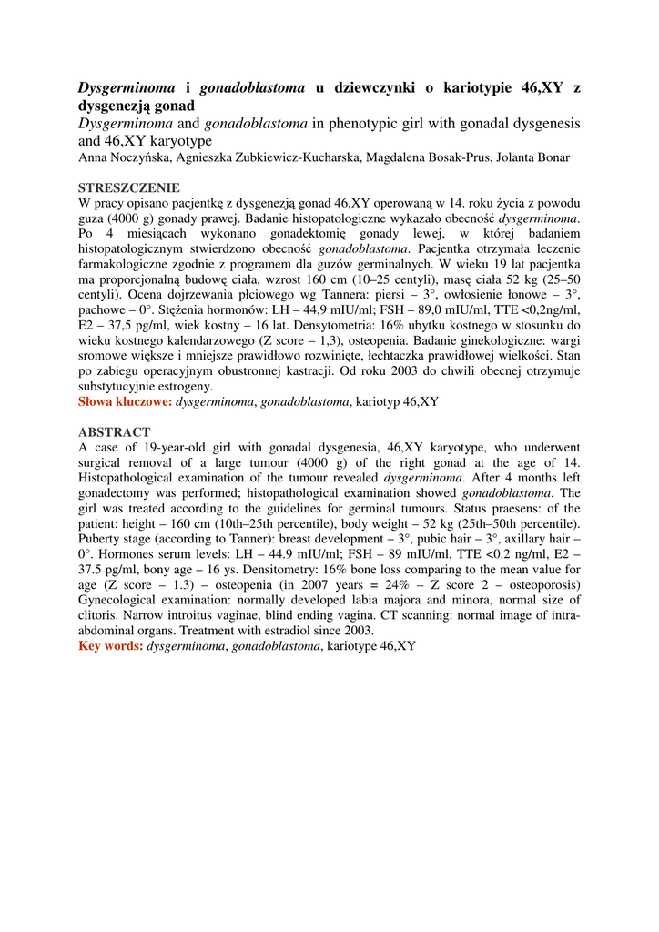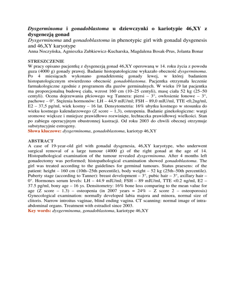 Dysgerminoma i gonadoblastoma u dziewczynki o kariotypie 46,XY z dysgenezją gonad Dysgerminoma and gonadoblastoma in phenotypic girl with gonadal dysgenesis and 46,XY karyotype Anna Noczyńska, Agnieszka Zubkiewicz-Kucharska, Magdalena Bosak-Prus, Jolanta Bonar STRESZCZENIE W pracy opisano pacjentkę z dysgenezją gonad 46,XY operowaną w 14. roku życia z powodu guza (4000 g) gonady prawej. Badanie histopatologiczne wykazało obecność dysgerminoma. Po 4 miesiącach wykonano gonadektomię gonady lewej, w której badaniem histopatologicznym stwierdzono obecność gonadoblastoma. Pacjentka otrzymała leczenie farmakologiczne zgodnie z programem dla guzów germinalnych. W wieku 19 lat pacjentka ma proporcjonalną budowę ciała, wzrost 160 cm (10–25 centyli), masę ciała 52 kg (25–50 centyli). Ocena dojrzewania płciowego wg Tannera: piersi – 3°, owłosienie łonowe – 3°, pachowe – 0°. Stężenia hormonów: LH – 44,9 mIU/ml; FSH – 89,0 mIU/ml, TTE <0,2ng/ml, E2 – 37,5 pg/ml, wiek kostny – 16 lat. Densytometria: 16% ubytku kostnego w stosunku do wieku kostnego kalendarzowego (Z score – 1,3), osteopenia. Badanie ginekologiczne: wargi sromowe większe i mniejsze prawidłowo rozwinięte, łechtaczka prawidłowej wielkości. Stan po zabiegu operacyjnym obustronnej kastracji. Od roku 2003 do chwili obecnej otrzymuje substytucyjnie estrogeny. Słowa kluczowe: dysgerminoma, gonadoblastoma, kariotyp 46,XY ABSTRACT A case of 19-year-old girl with gonadal dysgenesia, 46,XY karyotype, who underwent surgical removal of a large tumour (4000 g) of the right gonad at the age of 14. Histopathological examination of the tumour revealed dysgerminoma. After 4 months left gonadectomy was performed; histopathological examination showed gonadoblastoma. The girl was treated according to the guidelines for germinal tumours. Status praesens: of the patient: height – 160 cm (10th–25th percentile), body weight – 52 kg (25th–50th percentile). Puberty stage (according to Tanner): breast development – 3°, pubic hair – 3°, axillary hair – 0°. Hormones serum levels: LH – 44.9 mIU/ml; FSH – 89 mIU/ml, TTE <0.2 ng/ml, E2 – 37.5 pg/ml, bony age – 16 ys. Densitometry: 16% bone loss comparing to the mean value for age (Z score – 1.3) – osteopenia (in 2007 years = 24% – Z score 2 – osteoporosis) Gynecological examination: normally developed labia majora and minora, normal size of clitoris. Narrow introitus vaginae, blind ending vagina. CT scanning: normal image of intraabdominal organs. Treatment with estradiol since 2003. Key words: dysgerminoma, gonadoblastoma, kariotype 46,XY