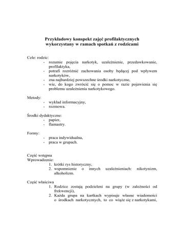 Przykładowy konspekt zajęć profilaktycznych wykorzystany w ramach spotkań z rodzicami Cele: rodzic: - rozumie pojęcia narkotyk, uzależnienie, przedawkowanie, profilaktyka, - potrafi rozróżnić zachowania osoby będącej pod wpływem narkotyków, - zna najbardziej powszechne środki narkotyczne, - wie, do kogo zwrócić się o pomoc w razie pojawienia się problemu uzależnienia narkotykowego. Metody: - wykład informacyjny, - rozmowa. Środki dydaktyczne: - papier, - flamastry. Formy: - praca indywidualna, - praca w grupach. Część wstępna Wprowadzenie: 1. krótki rys historyczny, 2. wspomnienie o innych alkoholizm. uzależnieniach: nikotynizm, Część właściwa 1. Rodzice zostają podzieleni na grupy (w zależności od frekwencji), 2. Każda grupa na kartkach wypisuje własne wiadomości o środkach narkotycznych, to co wiąże się z narkotykami, 3. Po wykonaniu zadania przedstawiciel każdej grupy odczytuje zebrane wspólnie informacje, 4. Usystematyzowanie podanych informacji (wszyscy z pomocą nauczyciela), zwrócenie uwagi na nieznaczną wiedzę w zakresie tematyki narkotykowej, 5. Nauczyciel przedstawia podstawowy podział i omawia go: - substancje opóźniające, - pobudzające układ nerwowy, - wywołujące zaburzenia w ośrodkowym układzie nerwowym. 6. Podział z uwagi na pochodzenie: - substancje naturalne, - substancje półsyntetyczne, - substancje syntetyczne. 7. Główne czynniki wywołujące skutki oddziaływania narkotyków to: - wielkość i jakość przyjętej dawki, - sposób zażywania, - osobowość zażywającego, - wcześniejszy kontakt i doświadczenie z narkotykami, - środowiska w którym dochodzi do konsumpcji. 8. Nauczyciel wyjaśnia pojęcia: - Narkotyk –substancja pochodzenia naturalnego lub syntetycznego, którego przyjęcie przez istotę żywą powoduje zdegenerowanie jednego lub więcej czynności organizmu. - Środek odurzający – substancja powodująca obniżenie lub pobudzenie określonego układu nerwowego wywołującego potrzebę jego stałego przyjmowania, uzależnienie psychiczne i fizyczne od działania środka oraz powodującego szkodliwe następstwa dla zdrowia psychicznego jak również fizycznego. - Środek psychotropowy – substancja syntetyczna należąca do leków lub substancji uzależniających. - Uzależnienie – stan, w którym człowiek nie potrafi obyć się bez danej substancji. Możemy wyróżnić dwa rodzaje uzależnień: Fizyczne – rodzaj uzależnienia powodowanego przez opiaty, barbiturany, pociągającego za sobą objawy łaknienia gdy zaprzestanie się przyjmowania danej substancji, Psychiczne – narastającą potrzebę psychologiczną przyjęcia narkotyku, którego odstawienie może wywołać objaw złego samopoczucia oraz stany lękowe. Towarzyszyć temu może tzw. zjawisko tolerancji. - Tolerancja – jest to określenie odporności na dany środek w wyniku czego dla uzyskania pożądanego efektu zachodzi konieczność zwiększenia przyjmowanego narkotyku. - Nawyk – (przyzwyczajenie) rodzaj psychicznego uzależnienia wynikającego ze stanu wielokrotnego przyjmowania narkotyku. - Głód narkotyczny – całkowite psychiczne i fizyczne uzależnienie od narkotyku, wywołujące stan nieprzezwyciężonej potrzeby przyjęcia kolejnej dawki, nagłe odstawienie narkotyku bez należytego dozoru lekarskiego może spowodować tzw. kryzys odstawienia często będący groźny w skutkach. - Odstawienie narkotyku – okres od 1-go do 2-ch tygodni niezbędny aby narkoman przestał odczuwać fizyczną potrzebę przyjęcia narkotyku. - Przedawkowanie – określenie na podanie do organizmu dawki narkotyku powodującej przekroczenie granicy wytrzymałości, głównie oparte na przyjęciu jakościowym a nie ilościowym danego narkotyku, jego objawem jest naruszenie wydolności krążeniowo-oddechowej organizmu mogącej doprowadzić do zejścia śmiertelnego. - Toksymania – określenie stanu zatrucia organizmu wywołanego przyjmowaniem narkotyku lub innego powodującego uzależnienie środka o szkodliwym działaniu na organizm. Jak rozpoznać czy dziecko bierze narkotyki? CHARAKTERYSTYCZNE ZACHOWANIA NAZWA (GRUPA) NARKOTYKÓW Opium, morfina, heroina, naturalne i półsyntetyczne przetwory maku KONTAKT JEDNORAZOWY Euforia, niepokój ruchowy lub senność, osłabienie reakcji na światło, brak apetytu, zwężenie źrenic, obniżenie ciśnienia krwi Rozpuszczalniki, środki Niezborność ruchów, wziewne agresja, rozszerzenie źrenic, kichanie, kaszel, krwawienie z nosa, mdłości, wymioty, biegunki Marihuana, haszysz, przetwory konopi indyjskich Kokaina, crack, przetwory liści krzewu coca DŁUGOTRWAŁE ZAŻYWANIE Wyniszczenie organizmu, zaparcia, zaburzenia menstruacji, próchnica, zmiany zapalne skóry Wyniszczenie organizmu, przekrwienie spojówek, zaburzenia pamięci, przygnębienie, zaburzenia snu, oczopląs, osłabienie mięśni Euforia połączona Wychudzenie, zaburzenia snu, wielomównością, przekrwienie gałek przewlekłe zapalenie ocznych, nadwrażliwość krtani i oskrzeli, apatia, zmysłów („razi mnie trudności światło”), kaszel, z koncentracją, zaburzenie koordynacji zmienność nastrojów ruchowej Euforia, pewność siebie, Wyniszczenie brak potrzeby snu, organizmu, urojenia wzrost aktywności prześladowcze, omamy, (także seksualnej), wybuchy agresji, rozszerzenie źrenic, bezsenność, drgawki, wytrzeszcz gałek przemiennie brak ocznych, katar, ból i wzrost łaknienia. gardła, pociąganie Ponadto crack upośledza nosem Amfetamina narkotyk syntetyczny Euforia, duży przypływ energii, brak potrzeby snu, brak apetytu, agresja, rozszerzenie źrenic LSD narkotyk syntetyczny Zaburzenie koordynacji ruchów, drżenie mięśni, rozszerzenie źrenic, mdłości, psychoza Ecstasy narkotyk syntetyczny Podniecenie, zwiększona energia, odporność na zmęczenie i sen, ból głowy oddychanie, powoduje utratę wagi i ataki paranoidalne Bezsenność, wychudzenie, zmiany nastroju, wielomówność, drżenie