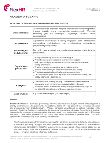 [email protected] www.flexhr.pl AKADEMIA FLEXHR 29.11.2016 OCENIANIE PRACOWNIKÓW PRODUKCYJNYCH Opis szkolenia: To trudne zadanie przybliży, wesprze przykładami - wieloletni praktyk i autor projektu oceny pracowników produkcyjnych. Warsztat kierowany jest dla średniego i wyższego szczebla kadry zarządzającej. Cel szkolenia: Zapoznanie uczestników z teorią dotyczącą ocen okresowych pracowników produkcyjnych oraz przedstawienie uczestnikom przykładowej formy oceny. Szkolenie jest dedykowane: Dla osób, które w swojej pracy mają okazję oceniać podległych im pracowników. Zagadnienia poruszane: Korzyści: Czas trwania: • Przygotowanie się do rozmowy oceniającej • Prawidłowe przeprowadzenie rozmowy oceniającej • Najczęstsze błędy popełniane w trakcie procesu oceny przez osobę oceniającą • Trudne sytuacje pojawiające się w trakcie oceny • Analiza przykładowych kompetencji w arkuszu oceny • Propozycja przykładowej karty oceny pracowniczej • Omówienie korzyści, jakie wynikają z wprowadzenia oceny dla osoby ocenianej i oceniającej • Doświadczenie realnej sytuacji i umożliwienie przećwiczenia omawianej teorii na konkretnych przykładach interakcji • Poznanie zasad prawidłowej formy oceny pracowniczej, czyli jak nie zdemotywować pracownika oceną pracowniczą 8 godzin szkoleniowych (7h zegarowych) Trener: Ewelina Sochacka – z zawodu psycholog, od wielu lat związana z dużymi firmami produkcyjnymi z branży elektronicznej jako pracownik, menadżer w dziale HR. Od ponad 6 lat prowadzi szkolenia dla pracowników firm produkcyjnych. Wiedzę trenerską ugruntowała w trakcie rocznego cyklu szkoleń „ Train the Trainers – szkolenie dla trenerów” prowadzonych przez firmę Schenk Institiut. Interesuje się szeroko rozumianą psychologią osobowości oraz systemową terapią rodzin. Kluczowe szkolenia: wdrożenia pracownika do pracy oraz ocen okresowych pracowników. Ponadto opracowała i wdrożyła trzy duże projekty szkoleniowe: Akademia Lidera (ponad 100 godzin zegarowych) – szkolenie skierowane do kadry zarządzającej z obszaru produkcji, mające na celu podniesienie umiejętności miękkich: asertywność, komunikacja, zarządzanie zespołem pracowników, motywowanie, delegowanie zadań itp. W szkoleniu wzięło udział 144 pracowników (liderów zespołu), 12 grup, po 12 uczestników w każdej grupie – program szkolenia własnego autorstwa. FlexHR Doradztwo Personalne Agencja Zatrudnienia Sp. z o.o., Nr wpisu do Rejestru Agencji Zatrudnienia 9172 Siedziba: Toruń, ul. Kościuszki 51B, NIP 8792685034 KRS 0000620750 -1- [email protected] www.flexhr.pl On The Job Training – szkolenie dla trenerów wewnętrznych (40 godzin zegarowych) – projekt trwał 12 miesięcy, wzięło w nim udział 12 osób i obejmował swoim zakresem: Wyłonienie spośród pracowników firmy grupy pracowników do pracy na stanowisku trenera wewnętrznego – rekrutacja i selekcja kandydatów do projektu. Bloki szkoleniowe dla wybranych kandydatów: asertywność, otwartość i działanie w grupie, komunikacja oraz sztuka prezentacji. Działania wspierające po szkoleniach – doraźne wsparcie dla nowych trenerów wewnętrznych Szkolenia z systemu ocen okresowych (ponad 150 godzin zegarowych) – szkolenie skierowane do wszystkich pracowników firmy (3500 osób, w tym również szkolenie dla kadry zarządzającej w języku angielskim), projekt autorski. Cena za szkolenie: 590,00 netto Rabaty: 150,00 za wczesny zapis 100,00 za drugą osobę z tej samej firmy 100,00 dla członków Izby Przemysłowo - Handlowej w Toruniu Uczestnicy otrzymają materiały szkoleniowe, certyfikat. Przygotowany jest również catering. Szkolenie odbywa się w godzinach od 9.00 do 16.00, miejsce: Piano, ul. Grudziądzka 110, Toruń. Zapisy na szkolenie: 1. Telefonicznie: +48 690 018 023 2. E-mailowo: [email protected] 3. Formularz zgłoszeniowy: www.flexhr.pl FlexHR Doradztwo Personalne Agencja Zatrudnienia Sp. z o.o., Nr wpisu do Rejestru Agencji Zatrudnienia 9172 Siedziba: Toruń, ul. Kościuszki 51B, NIP 8792685034 KRS 0000620750 -2-