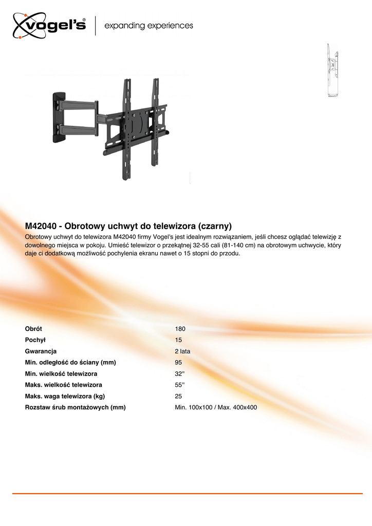 M42040 - Obrotowy uchwyt do telewizora (czarny) Obrotowy uchwyt do telewizora M42040 firmy Vogel's jest idealnym rozwiązaniem, jeśli chcesz oglądać telewizję z dowolnego miejsca w pokoju. Umieść telewizor o przekątnej 32-55 cali (81-140 cm) na obrotowym uchwycie, który daje ci dodatkową możliwość pochylenia ekranu nawet o 15 stopni do przodu. Obrót 180 Pochył 15 Gwarancja 2 lata Min. odległość do ściany (mm) 95 Min. wielkość telewizora 32'' Maks. wielkość telewizora 55'' Maks. waga telewizora (kg) 25 Rozstaw śrub montażowych (mm) Min. 100x100 / Max. 400x400 M42040 - Obrotowy uchwyt do telewizora (czarny) W zestawie z uchwytem ściennym do TV M42040 znajduje się instrukcja instalacji krok po kroku oraz materiały do zamontowania odbiornika na ścianie. Czarny uchwyt do telewizora pasuje do modeli o wadze do 25 kg. Uzyskaj najlepszy możliwy kąt oglądania dzięki obrotowemu uchwytowi do telewizora firmy Vogel's. Cechy - Montaż telewizora za pomocą otworów o rozstawie do 400 x 400 mm (VESA) - Możliwość obrotu, pochylenia i przysunięcia gwarantuje uzyskanie optymalnego kąta oglądania - Najlepsze kąty oglądania z dowolnego miejsca w pomieszczeniu - Produkt wstępnie zmontowany - instalacja w 3 łatwych krokach - Łatwy montaż Informacje logistyczne Kod produktu EAN 8712285327407 Waga netto (kg) 4.88 Szerokość pojedynczego opakowania (mm) 266 Długość pojedynczego opakowania (mm) 515 Wysokość pojedynczego opakowania (mm) 100 Version: 15-Dec-2015 Subject to printing errors, technical and price amendments. www.vogels.com