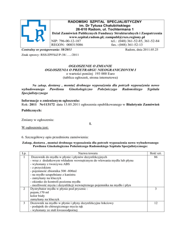 RADOMSKI SZPITAL SPECJALISTYCZNY im. Dr Tytusa Chałubińskiego 26-610 Radom, ul. Tochtermana 1 Dział Zamówień Publicznych Funduszy Strukturalnych i Zaopatrzenia www.szpital.radom.pl; [email protected] NIP: 796-00-12-187 tel.: (048) 361-52-85, 361-52-84 REGON: 000315086 fax.: (048) 361-52-13 Centralny nr postępowania: 58/2011 Radom, dnia 2011.05.25 Znak sprawy: RSS/ZPFSiZ/P-38/…../2011 OGŁOSZENIE O ZMIANIE OGŁOSZENIA O PRZETRARGU NIEOGRANICZONYM I o wartości poniżej 193 000 Euro (tablica ogłoszeń, strona internetowa) Na zakup, dostawę , montaż drobnego wyposażenia dla potrzeb wyposażenia nowo wybudowanego Pawilonu Specjalistycznego Ginekologiczno Położniczego Radomskiego Szpitala Informacje o zmienianym ogłoszeniu: Rok: 2011 Nr113172 data 13.05.2011 ogłoszenia opublikowanego w Biuletynie Zamówień Publicznych: Zmiany w ogłoszeniu: I. W ogłoszeniu jest: 6. Szczegółowy opis przedmiotu zamówienia: Zakup, dostawa , montaż drobnego wyposażenia dla potrzeb wyposażenia nowo wybudowanego Pawilonu Ginekologiczno Położniczego Radomskiego Szpitala Specjalistycznego: Lp. 1 2 3 Nazwa towaru Dozownik do mydła w płynie i płynów dezynfekcyjnych - wraz z dodatkowym wkładem wewnętrznym do wlewania mydła lub płynu - wykonany z tworzywa ABS - z przyciskiem - pojemność zbiornika 500 -800ml - na mydło uzupełniane z kanistra - zamykany na kluczyk - okienko do kontroli poziomu mydła - możliwość mycia i dezynfekcji wewnętrznego pojemnika na mydło i płyn Dystrybutor mydła w płynie pod prysznic : pojem,170 ml kolor biały zamykany na kluczyk Dozownik na mydło w płynie i płyny dezynfekcyjne łokciowy - podajnik do chirurgicznego mycia rąk - wykonany ze stali kwasoodpornej Ilość szt. 86 3 12 4 5 6 7 - pojemność zbiornika 1000 ml - płyny uzupełniane z kanistra -mechanizm dozujący wykonany ze stali kwasoodpornej, - łatwy w demontażu - możliwość pełnej sterylizacji - do wszystkich rodzajów płynów dezynfekcyjnych i mydła w płynie - uruchamiany przyciskiem łokciowym Dozownik płynów dezynfekcyjnych : a) uruchamiany przyciskiem łokciowym - wykonany z tworzywa ABS - pojemność zbiornika 500 -800ml - płyny uzupełniane z kanistra - zamykany na kluczyk - okienko do kontroli poziomu mydła - kolor biały b) podajnik do chirurgicznego mycia rąk - wykonany ze stali kwasoodpornej - pojemność zbiornika 500 ml - płyny uzupełniane z kanistra -mechanizm dozujący wykonany ze stali kwasoodpornej, - łatwy w demontażu - możliwość pełnej sterylizacji - do wszystkich rodzajów płynów dezynfekcyjnych i mydła w płynie - uruchamiany przyciskiem łokciowym Dozownik mydła w płynie : a) uruchamiany przyciskiem łokciowym - wykonany z tworzywa ABS - pojemność zbiornika 500 -800ml - na mydło uzupełniane z kanistra - zamykany na kluczyk - okienko do kontroli poziomu mydła - kolor biały b) podajnik do chirurgicznego mycia rąk - wykonany ze stali kwasoodpornej - pojemność zbiornika 500 ml - płyny uzupełniane z kanistra -mechanizm dozujący wykonany ze stali kwasoodpornej, - łatwy w demontażu - możliwość pełnej sterylizacji - do wszystkich rodzajów płynów dezynfekcyjnych i mydła w płynie - uruchamiany przyciskiem łokciowym Pojemnik na jednorazowe ręczniki składane - wykonany z tworzywa ABS - pojemność do 250 szt. ręczników - zamykany na kluczyk - okienko do kontroli ilości ręczników Podajnik ręczników papierowych składanych - wykonany ze stali kwasoodpornej -pojem.500 szt. ręczników: 80 4 86 4 168 7 8 - zamykany na kluczyk Pojemnik na ręczniki jednorazowe - do rączników na rolce - ręcznik na rolce o rozm.wys.20cm, średnica 20 cm - sposób rozwijania ręcznika – od środka rolki 4 9 10 Stojak łazienkowy na papier i szczotkę klozetową Lustro nad umywalkę - śruby mocujące (wkręcane do ściany przez lustro) - bez ramy - szlifowane - rozmiar :400mmx600mm 62 114 11 Wieszak ścienny - przykręcany do ściany -srebrny - satynowy - punktowy Wieszak ścienny - przykręcany do ściany -srebrny - satynowy - 2-punktowy Wieszak ścienny - przykręcany do ściany -srebrny - satynowy - 3- punktowy Wieszak ścienny - przykręcany do ściany -srebrny - satynowy - 4- punktowy Wieszak stojący - konstrukcja metalowa chromowana Kosz na odpady otwierany przyciskiem pedałowym - z wkładem - prostokątny - z tworzywa sztucznego , - poj.15 – 16 litrów - kolor biały 189 17 Kosz na odpady otwierany przyciskiem pedałowym, - z wkładem nierdzewnym - prostokątny - z tworzywa sztucznego , - poj.20- 25 litrów - kolor biały 49 18 Kosz na śmieci - stelaż druciany na worek foliowy - pokrywa z tworzywa sztucznego - poj.15-16 litrów - kolor biały 3 12 13 14 15 16 7 19 40 1 198 19 Kosz na śmieci biurowy 15l - z uchylną pokrywą - z tworzywa sztucznego - poj.15-16 litrów - kolor biały 6 20 Kosz na odpady otwierany przyciskiem pedałowym - ze stali nierdzewnej - z wyjmowanym wkładem - prostokątny - poj.15-20 litrów - kolor biały 23 21 Pojemnik na odpadki - plastikowy - pojemność ok.5 litrów - zdejmowana pokrywa 5 W ogłoszeniu powinno być : 6. Szczegółowy opis przedmiotu zamówienia: Zakup, dostawa , montaż drobnego wyposażenia dla potrzeb wyposażenia nowo wybudowanego Pawilonu Ginekologiczno Położniczego Radomskiego Szpitala Specjalistycznego: Lp. Nazwa towaru Ilość szt. 1 Dozownik do mydła w płynie i płynów dezynfekcyjnych 86 - wraz z dodatkowym wkładem wewnętrznym do wlewania mydła lub płynu - wykonany z tworzywa ABS - z przyciskiem - pojemność zbiornika 500 -800ml - na mydło uzupełniane z kanistra - zamykany na kluczyk lub zatrzask umieszczony w dolnej części obudowy, niewidoczny dla niewtajemniczonych - okienko do kontroli poziomu mydła - możliwość mycia i dezynfekcji wewnętrznego pojemnika na mydło i płyn 2 Dystrybutor mydła w płynie pod prysznic : 3 pojem,170 ml kolor biały zamykany na kluczyk 3 Dozownik na mydło w płynie i płyny dezynfekcyjne łokciowy 12 - podajnik do chirurg