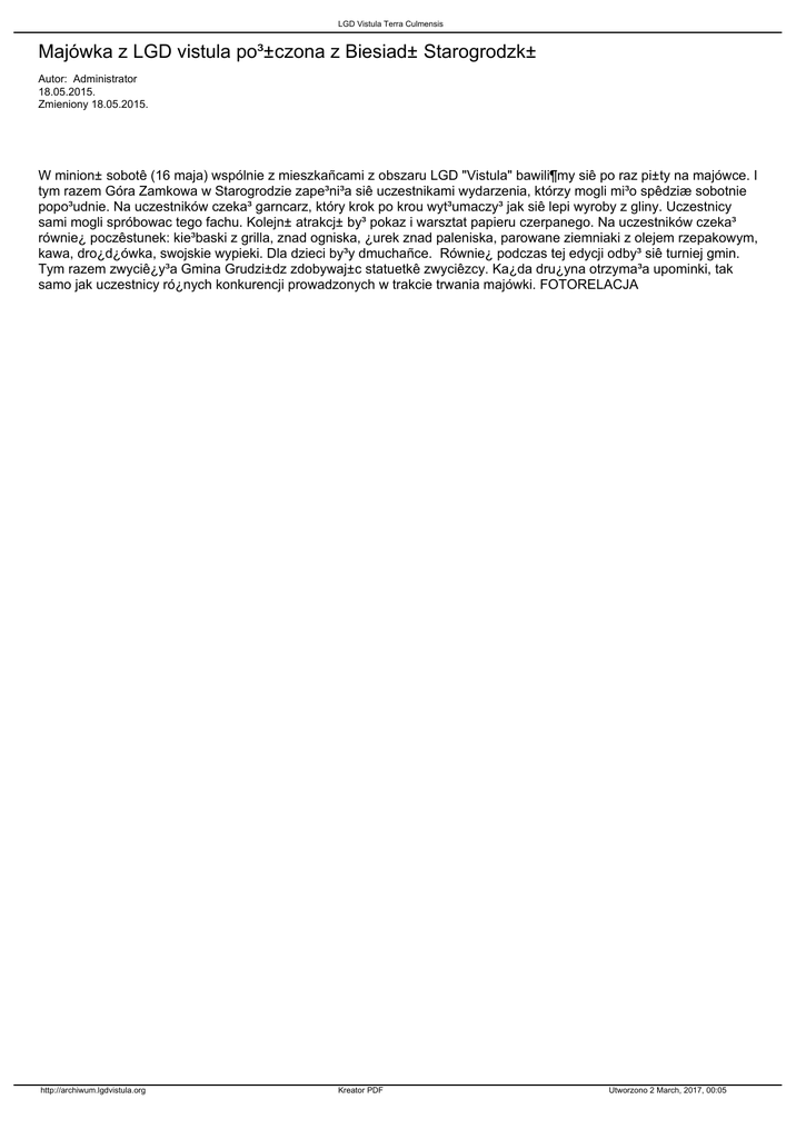 LGD Vistula Terra Culmensis Majówka z LGD vistula po³±czona z Biesiad± Starogrodzk± Autor: Administrator 18.05.2015. Zmieniony 18.05.2015. W minion± sobotê (16 maja) wspólnie z mieszkañcami z obszaru LGD "Vistula" bawili¶my siê po raz pi±ty na majówce. I tym razem Góra Zamkowa w Starogrodzie zape³ni³a siê uczestnikami wydarzenia, którzy mogli mi³o spêdziæ sobotnie popo³udnie. Na uczestników czeka³ garncarz, który krok po krou wyt³umaczy³ jak siê lepi wyroby z gliny. Uczestnicy sami mogli spróbowac tego fachu. Kolejn± atrakcj± by³ pokaz i warsztat papieru czerpanego. Na uczestników czeka³ równie¿ poczêstunek: kie³baski z grilla, znad ogniska, ¿urek znad paleniska, parowane ziemniaki z olejem rzepakowym, kawa, dro¿d¿ówka, swojskie wypieki. Dla dzieci by³y dmuchañce. Równie¿ podczas tej edycji odby³ siê turniej gmin. Tym razem zwyciê¿y³a Gmina Grudzi±dz zdobywaj±c statuetkê zwyciêzcy. Ka¿da dru¿yna otrzyma³a upominki, tak samo jak uczestnicy ró¿nych konkurencji prowadzonych w trakcie trwania majówki. FOTORELACJA http://archiwum.lgdvistula.org Kreator PDF Utworzono 2 March, 2017, 00:05