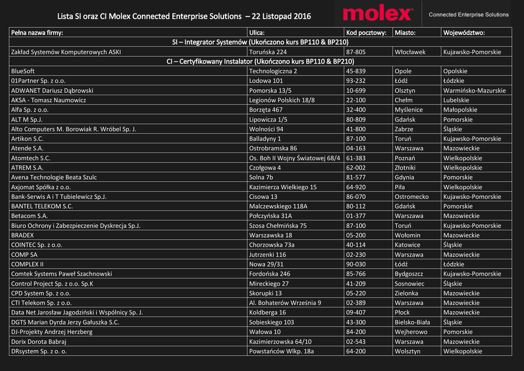 Lista SI oraz CI Molex Connected Enterprise Solutions – 22 Listopad