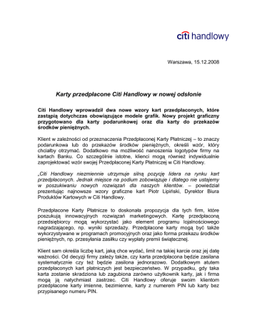 Warszawa, 15.12.2008 Karty przedpłacone Citi Handlowy w nowej odsłonie Citi Handlowy wprowadził dwa nowe wzory kart przedpłaconych, które zastąpią dotychczas obowiązujące modele grafik. Nowy projekt graficzny przygotowano dla karty podarunkowej oraz dla karty do przekazów środków pieniężnych. Klient w zależności od przeznaczenia Przedpłaconej Karty Płatniczej – to znaczy podarunkowa lub do przekazów środków pieniężnych, określi wzór, który chciałby otrzymać. Dodatkowo ma możliwość nanoszenia logotypów firmy na kartach Banku. Co szczególnie istotne, klienci mogą również indywidualnie zaprojektować wzór swojej Przedpłaconej Karty Płatniczej w Citi Handlowy. „Citi Handlowy niezmiennie utrzymuje silną pozycję lidera na rynku kart przedpłaconych. Jednak miejsce na podium zobowiązuje i dlatego nie ustajemy w poszukiwaniu nowych rozwiązań dla naszych klientów. – powiedział prezentując najnowsze wzory graficzne kart Piotr Lipiński, Dyrektor Biura Produktów Kartowych w Citi Handlowy. Przedpłacone Karty Płatnicze to doskonała propozycja dla tych firm, które poszukują innowacyjnych rozwiązań marketingowych. Kartę przedpłaconą przedsiębiorcy mogą wykorzystać jako element programu lojalnościowego nagradzającego, np. wyniki sprzedaży. Przedpłacone karty mogą być także wykorzystywane w programach promocyjnych oraz jako forma przekazu środków pieniężnych, np. przesyłania zasiłku czy wypłaty premii świątecznej. Klient sam określa liczbę kart, jaką chce wydać, limit na takiej karcie oraz jej datę ważności. Od decyzji firmy zależy także, czy karta przedpłacona będzie zasilana systematycznie czy też będzie zasilona jednorazowo. Dodatkowym atutem przedpłaconych kart płatniczych jest bezpieczeństwo. W przypadku, gdy taka karta zostanie skradziona lub zagubiona zarówno użytkownik karty, jak i firma mogą ją natychmiast zastrzec. Citi Handlowy oferuje swoim klientom przedpłacone karty imienne, bezimienne, karty z numerem PIN lub karty bez przypisanego numeru PIN. Szczegółowe informacje na temat kart przedpłaconych można uzyskać doradcy bankowego oraz pod numerem telefonu: 022 692 24 39 oraz na stronie www.citibank.pl/poland/corporate/polish/683.htm. ### Dodatkowych informacji udziela: Paweł Zegarłowicz, Dyrektor Biura Prasowego, tel. (0-22) 657 72 97 E-mail: [email protected] Agata Charuba–Chadryś, Specjalista ds. Kontaktów z Mediami, tel. (0-22) 692 90 52 E-mail: [email protected] Bank Handlowy w Warszawie SA to jedna z największych instytucji finansowych w Polsce, oferująca pod marką Citi Handlowy bogaty i nowoczesny asortyment produktów i usług bankowości korporacyjnej, inwestycyjnej i detalicznej. Bank Handlowy obsługuje 20 tys. klientów korporacyjnych i 800 tys. klientów indywidualnych poprzez nowoczesne kanały dystrybucji oraz sieć ponad 200 oddziałów. W skład grupy kapitałowej Banku wchodzą takie podmioty jak: Dom Maklerski Banku Handlowego i Handlowy Leasing. Przynależność do Citigroup, największej na świecie instytucji finansowej, zapewnia klientom Banku Handlowego dostęp do usług finansowych w ponad 100 krajach. Dodatkowe informacje można uzyskać na stronie internetowej www.citihandlowy.pl. Citi (NYSE:C) to wiodąca globalna firma świadcząca usługi finansowe. Obsługuje około 200 milionów klientów indywidualnych, korporacyjnych, rządowych i instytucjonalnych w ponad 100 krajach. Zapewnia bogaty wachlarz produktów i usług finansowych, jak bankowość komercyjna i inwestycyjna, bankowość detaliczna, kredytowanie, ubezpieczenia, usługi na rynków papierów wartościowych i zarządzanie aktywami. Główne marki pod znakiem handlowym Citigroup to Citibank, CitiFinancial, Primerica, Smith Barney i Banamex. Dodatkowe informacje można uzyskać na stronie internetowej www.citigroup.com.