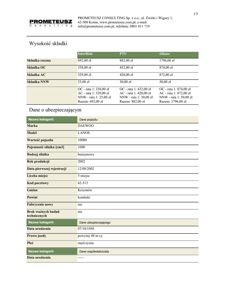 1/5 PROMETEUSZ CONSULTING Sp. z o.o., ul. Żwirki i Wigury 1, 62-500 Konin, www.prometeusz.com.pl, e-mail: [email protected], infolinia: 0801 011 719 Wysokość składki InterRisk PTU Allianz Składka roczna 692,00 zł 882,00 zł 1796,00 zł Składka OC 338,00 zł 432,00 zł 874,00 zł Składka AC 329,00 zł 420,00 zł 872,00 zł Składka NNW 25,00 zł 30,00 zł 50,00 zł OC - rata 1: 338,00 zł AC - rata 1: 329,00 zł NNW - rata 1: 25,00 zł Razem: 692,00 zł OC - rata 1: 432,00 zł AC - rata 1: 420,00 zł NNW - rata 1: 30,00 zł Razem: 882,00 zł OC - rata 1: 874,00 zł AC - rata 1: 872,00 zł NNW - rata 1: 50,00 zł Razem: 1796,00 zł Dane o ubezpieczającym Nazwa kategorii: Dane pojazdu Marka DAEWOO Model LANOS Wartość pojazdu 10000 Pojemność silnika [cm3] 1600 Rodzaj silnika benzynowy Rok produkcji 2002 Data pierwszej rejestracji 12/08/2002 Liczba miejsc 5 miejsc Kod pocztowy 62-513 Gmina Krzymów Powiat koniński Fabrycznie nowy nie Brak ważnych badań technicznych nie Nazwa kategorii: Dane ubezpieczającego Data urodzenia 07/10/1958 Prawo jazdy powyżej 48 m-cy Płeć mężczyzna Nazwa kategorii: Data urodzenia Dane współwłaściciela ----- 2/5 PROMETEUSZ CONSULTING Sp. z o.o., ul. Żwirki i Wigury 1, 62-500 Konin, www.prometeusz.com.pl, e-mail: [email protected], infolinia: 0801 011 719 Prawo jazdy ----- Płeć ----- Nazwa kategorii: Informacje o innych osobach dopuszczonych do prowadzenia pojazdu Prawo jazdy poniżej 36 m-cy Wiek poniżej 30 lat Nazwa kategorii: Dane o ubezpieczeniu pakietowym OC/AC Nazwa kategorii: Dane o ubezpieczeniu AC Dotychczasowy ubezpieczyciel Uniqa Bezszkodowość Po 12 i więcej latach bez szkód Ilość szkód w ostatnim roku 0 szkód Będzie zaświadczenie o bezszkodowości nie Przerwa w ubezpieczeniu bez przerwy Ilość lat bezszkodowych w ostatnim ZU Po 12 i więcej latach bez szkód Przewidywany początek okresu 17/08/2009 ubezpieczenia Ilość pozostałych ubezpieczonych pojazdów Nazwa kategorii: 0 Dane o ubezpieczeniu OC Dotychczasowy ubezpieczyciel Uniqa Bezszkodowość Po 12 i więcej latach bez szkód Ilość szkód w ostatnim roku 0 szkód Będzie zaświadczenie o bezszkodowości nie Przerwa w ubezpieczeniu bez przerwy Ilość lat bezszkodowych w ostatnim ZU Po 12 i więcej latach bez szkód Przewidywany początek okresu 17/08/2009 ubezpieczenia Ilość pozostałych ubezpieczonych pojazdów Nazwa kategorii: Ilość szkód w ostatnim roku 0 Dane o ubezpieczeniu NNW 0 szkód 3/5 PROMETEUSZ CONSULTING Sp. z o.o., ul. Żwirki i Wigury 1, 62-500 Konin, www.prometeusz.com.pl, e-mail: [email protected], infolinia: 0801 011 719 Założenia InterRisk PTU Allianz Suma ubezpieczenia NNW 5000,00 zł 5000 10000 Warunki płatności AC - ilość rat: 1 OC ilość rat: 1 AC - ilość rat: 1 OC ilość rat: 1 AC - ilość rat: 1 OC ilość rat: 1 Suma ubezpieczenia AC 10000,00 zł 10000 10000 Zakres AC AC+KR AC+KR AC+KR Amortyzacja części Zniesiona Zniesiona zniesiona Zakres terytorialny Europa (bez KR w WNP) Europa (bez KR w WNP) Europa (bez KR w WNP) Udział własny Zniesiony Zniesiony zniesiony PTU Allianz Włączenie ryzyka powodzi i zalania Franszyza redukcyjna Pojazd zastępczy Wprowadzenie opcji Gwarantowanej Sumy Ubezpieczenia Ubezpieczenie wyposażenia dodatkowego Odstąpienie od konsumpcji sumy ubezpieczenia Ogólne warunki ubezpieczenia InterRisk Nazwa kategorii: Ogólne Minimalna szkoda podlegająca 1% su, nie mniej niż 400,00 500 zł wypłacie zł 1% su, nie mniej niż 300 zł Holowanie Nie dotyczy do 400 PLN do 125 EUR Naprawa na miejscu Nie dotyczy do 400 PLN do 125 EUR Parkowanie Nie dotyczy do 3 dni nie 4/5 PROMETEUSZ CONSULTING Sp. z o.o., ul. Żwirki i Wigury 1, 62-500 Konin, www.prometeusz.com.pl, e-mail: [email protected], infolinia: 0801 011 719 Nazwa kategorii: Wyłączona odpowiedzialność w szkodach spowodowanych Przez osoby, których przewóz wymagany był potrzebą udzielenia pomocy medycznej Poprzez osmolenia wyłączona Poprzez usuwanie lub zapadanie się ziemi Poprzez zatopienia Poprzez lawiny Zużyciem opon (nie spełniających norm technicznych) Niesprawną instalacją gazową Przez zwierzętna wewnątrz pojazdu Nazwa kategorii: Pomniejszenie wypłaty odszkodowania przy szkodach spowodowanych Nie ma przekroczeniem prędkości Nazwa kategorii: Nie ma nie ma Obowiązkowy udział własny Z tytułu kolejnych szkód w okresie ubezpieczenia Nie ma Nie ma nie ma Ze względu na wiek pojazdu Nie ma Nie ma nie ma Nazwa kategorii: Zwroty kosztów Transportu pojazdów Tak do 800 PLN do kwoty 1.000 PLN (RP) lub 500 EUR (poza RP) Parkowania Tak do 15 dni do 500 PLN Dodatkowego badania technicznego Tak (bez limitu) tak (bez limitu) tak (bez limitu) Łączny limit zwrotu kosztów 10% su (max 500 EUR) 10% su (max 2 000 PLN) 5/5 PROMETEUSZ CONSULTING Sp. z o.o., ul. Żwirki i Wigury 1, 62-500 Konin, www.prometeusz.com.pl, e-mail: [email protected], infolinia: 0801 011 719 Nazwa kategorii: Świadczenia w razie awarii (Assistance) Holowanie Nie dotyczy do 800 PLN do 125 EUR (RP) lub 250 EUR (poza RP) Naprawa na miejscu Nie dotyczy do 400 PLN do 125 EUR (RP) lub 250 EUR (poza RP) Dostarczenie paliwa Nie dotyczy nie tak Zakwaterowanie Nie dotyczy nie Parkowanie Nie dotyczy nie max. 3 doby i 50 EUR/osobę(RP), lub 75 EUR/osobę(poza RP) do 25 EUR (RP) lub 38 EUR (poza RP) Pojazd zastępczy Nie dotyczy tak nie Łączny limit na Assistance Nie dotyczy InterRisk PTU Allianz {OC-klasa BM} wymagana kopia ostatniej polisy i zaświadczenie o bezszkodowym przebiegu ubezpieczenia Niedostateczne zabezpieczenia OC: Wymagana kopia AC: {liczba zabezp.}: ostatniej polisy i niedostateczne oświadczenie o zabezpieczenia bezszkodowym przebiegu ubezpieczenia AC: Niewystarczające zabezpieczenia AC-klasa BM wymagana kopia ostatniej polisy i zaświadczenie o bezszkodowym przebiegu ubezpieczenia AC: wymagana kopia ostatniej polisy i oświadczenie o bezszkodowym przebiegu ubezpieczenia Uwagi