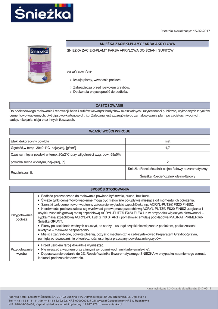 Ostatnia aktualizacja: 15-02-2017 ŚNIEŻKA ZACIEKIPLAMY FARBA AKRYLOWA ŚNIEŻKA ZACIEKIPLAMY FARBA AKRYLOWA DO ŚCIAN I SUFITÓW ŚNIEŻKA_ZACIEKIPLAMY_FARBA_AKRYLOWA WŁAŚCIWOŚCI: Izoluje plamy, wzmacnia podłoże. Zabezpiecza przed rozwojem grzybów. Doskonała przyczepność do podłoża. ZASTOSOWANIE Do podkładowego malowania i renowacji ścian i sufitów wewnątrz budynków mieszkalnych i użyteczności publicznej wykonanych z tynków cementowowapiennych, płyt gipsowokartonowych, itp. Zalecana jest szczególnie do zamalowywania plam po zaciekach wodnych, sadzy, nikotynie, oleju oraz innych tłuszczach. WŁAŚCIWOŚCI WYROBU Efekt dekoracyjny powłoki mat Gęstość,w temp. 20±0,1°C najwyżej, [g/cm³] 1,7 Czas schnięcia powłoki w temp. 20±2°C przy wilgotności wzg. pow. 55±5% powłoka sucha w dotyku, najwyżej, [h] 2 Śnieżka Rozcieńczalnik olejnoftalowy bezaromatyczny Rozcieńczalnik Śnieżka Rozcieńczalnik olejnoftalowy SPOSÓB STOSOWANIA Przygotowanie podłoża Podłoże przeznaczone do malowania powinno być trwałe, suche, bez kurzu. Świeże tynki cementowowapienne mogą być malowane po upływie miesiąca od momentu ich położenia. Szorstki tynk cementowo wapienny zaleca się wygładzić szpachlówką np. ACRYLPUTZ® FS20 FINISZ. Nierówności podłoża zaleca się wyrównać gotową masą szpachlową ACRYLPUTZ® FS20 FINISZ ,spękania i ubytki uzupełnić gotową masą szpachlową ACRYLPUTZ® FX23 FLEX lub w przypadku większych nierówności – sypką masą szpachlową ACRYLPUTZ® ST10 START i pomalować emulsją podkładową MAGNAT PRIMER lub Śnieżka GRUNT. Plamy po zaciekach wodnych osuszyć, po sadzy – usunąć cząstki niezwiązane z podłożem, po tłuszczach i nikotynie – malować bezpośrednio. Miejsca zagrzybione, pokryte pleśnią, oczyścić mechanicznie i zdezynfekować Preparatem Grzybobójczym, pamiętając równocześnie o konieczności usunięcia przyczyny powstawania grzybów. Przygotowanie wyrobu Przed użyciem farbę dokładnie wymieszać. Nie mieszać z wapnem oraz z innymi wyrobami wodnymi (farby emulsyjne). Dopuszcza się dodanie do 2% Rozcieńczalnika Bezaromatycznego ŚNIEŻKA w przypadku nadmiernego wzrostu lepkości podczas składowania. Karta techniczna 1/3 Ostatnia aktualizacja: 2017-02-15 Fabryka Farb i Lakierów Śnieżka SA, 39102 Lubzina 34A, Administracja: 39207 Brzeźnica, ul. Dębicka 44 Tel. + 48 14 681 11 11, fax +48 14 682 22 22, KRS 0000060537 XII Wydział Gospodarczy KRS w Rzeszowie NIP: 8181433438, Kapitał zakładowy w pełni opłacony: 12 617 778 zł, www.sniezka.pl Prace malarskie wykonywać przy temp. podłoża i otoczenia od +5°C do +25°C. Farbę w postaci handlowej nanieść w dwóch warstwach w odstępie co 4 h w temp. +20°C; niska temperatura otoczenia i wysoka wilgotność wydłużają czas schnięcia, w związku z czym zaleca się malować drugą warstwę w następnym dniu. Malowanie Przy zamalowywaniu plam nanieść na nie farbę tak jak w przypadku nowych podłoży, następnie całość można pomalować farbą emulsyjną. ŚNIEŻKA_ZACIEKIPLAMY_FARBA_AKRYLOWA Malować pędzlem lub wałkiem albo natryskiem hydrodynamicznym. Narzędzia użyte do malowania umyć rozcieńczalnikiem bezaromatycznym. Pomieszczenia w którym zastosowano wyrób lub elementy malowane wyrobem należy wietrzyć do zaniku zapachu i po tym okresie nadają się do użytkowania. PARAMETRY MALOWANIA DLA POSZCZEGÓLNYCH METOD PARAMETRY MALOWANIA METODY lepkość farby MALOWANIA Pędzel, wałek dodatek rozcieńczalnika średnica dyszy pistoletu ciśnienie natrysku zalecana ilość warstw [s] [%] [mm] [MPa] postać handlowa - - - 2 20÷21 1-2 nie stosuje się Natrysk pneumatyczny Natrysk postać handlowa 0,43÷0,66 - hydrodynamiczny* * natrysk wykonany na urządzeniach firmy Graco, model 395 ST PRO OKRES PRZYDATNOŚCI 24 miesiące OPAKOWANIA 400ml, 1L, 5L, Uniwersalna etykieta WYDAJNOŚĆ do 9 m²/L przy jednokrotnym malowaniu w zależności od rodzaju podłoża i sposobu nakładania KOLORYSTYKA biały, LZO Limit zawartości LZO dla tego produktu: (kat. A/g/FR): 350g/l (2010). Produkt zawiera max. 350 g/l. NORMY, BADANIA I ATESTY ZN-SN-002:2009/Az1:2010 Karta techniczna 2/3 Ostatnia aktualizacja: 2017-02-15 Fabryka Farb i Lakierów Śnieżka SA, 39102 Lubzina 34A, Administracja: 39207 Brzeźnica, ul. Dębicka 44 Tel. + 48 14 681 11 11, fax +48 14 682 22 22, KRS 0000060537 XII Wydział Gospodarczy KRS w Rzeszowie NIP: 8181433438, Kapitał zakładowy w pełni opłacony: 12 617 778 zł, www.sniezka.pl Atest Higieniczny: 144/322/160/2013 NORMA ZN-SN-002:2009/Az1:2010 WSKAZÓWKI BHP I PPOŻ ŚNIEŻKA_ZACIEKIPLAMY_FARBA_AKRYLOWA BEZPIECZEŃSTWO: Zawiera Węglowodory, C9C11, nalkanów, izoalkanów, cykliczne, <2% związków aromatycznych. Zawiera 2 oktyloizotiazol3(2H)on, butylokarbaminian 3jodo2propynylu. Może powodować wystąpienie reakcji alergicznej. Działa szkodliwie na organizmy wodne, powodując długotrwałe skutki. Łatwopalna ciecz i pary. Może wywoływać uczucie senności lub zawroty głowy. Powtarzające się narażenie może powodować wysuszanie lub pękanie skóry. W razie konieczności zasięgnięcia porady lekarza należy pokazać pojemnik lub etykietę. Chronić przed dziećmi. Przed użyciem przeczytać etykietę. Stosować rękawice ochronne/odzież ochronną/ochronę oczu/ochronę twarzy. W PRZYPADKU DOSTANIA SIĘ DO DRÓG ODDECHOWYCH: Wyprowadzić lub wynieść poszkodowanego na świeże powietrze i zapewnić mu warunki do swobodnego oddychania. Zawartość/pojemnik usuwać zgodnie z obowiązującymi przepisami. UWAGA! Informacje zawarte w karcie technicznej mają na celu zapewnienie optymalnego wykorzystania produktu, jednak nie są podstawą do odpowiedzialności prawnej Producenta, gdyż warunki wykonawstwa pozostają poza jego kontrolą. Wszelka ingerencja w skład produktu jest niedopuszczalna i może w znaczny sposób obniżyć jakość stosowanego materiału. W przypadku połączenia z wyrobami innych P