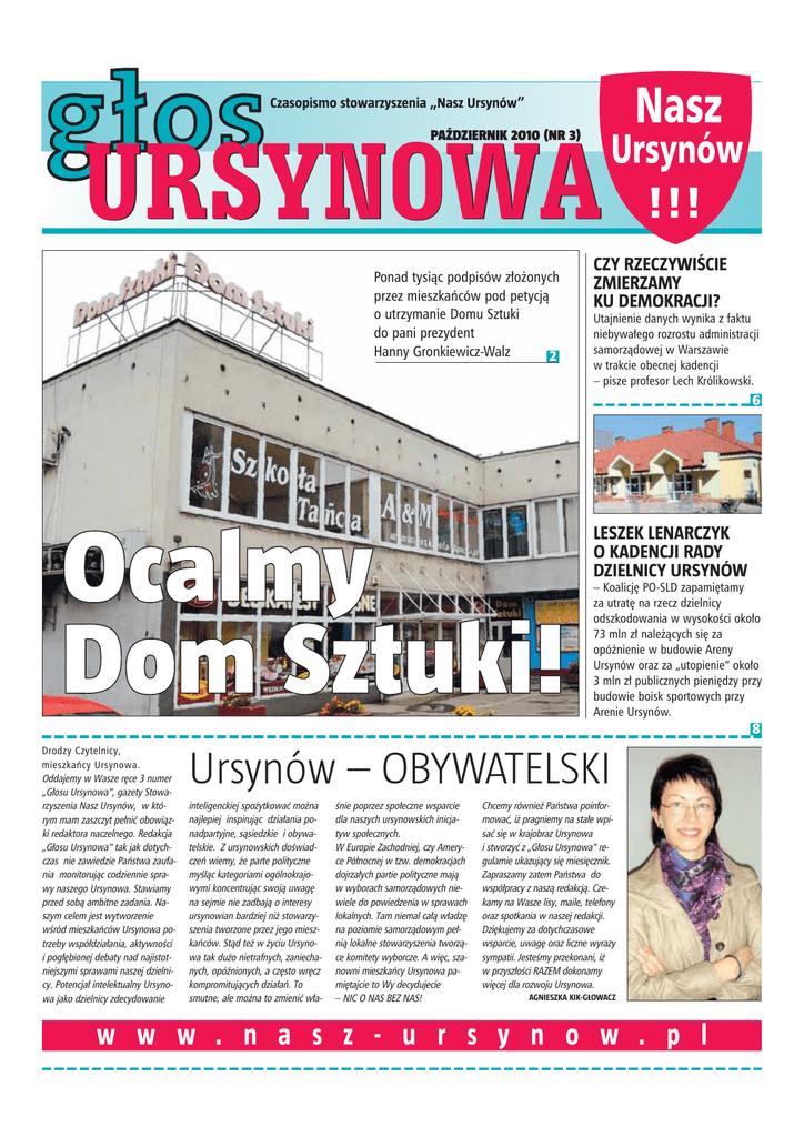 Czasopismo stowarzyszenia „Nasz Ursynów” URSYNOWA PAŹDZIERNIK 2010 (NR 3) Ponad tysiàc podpisów z∏o˝onych przez mieszkaƒców pod petycjà o utrzymanie Domu Sztuki do pani prezydent Hanny Gronkiewicz-Walz 2 CZY RZECZYWIŚCIE ZMIERZAMY KU DEMOKRACJI? Utajnienie danych wynika z faktu niebywa∏ego rozrostu administracji samorzàdowej w Warszawie w trakcie obecnej kadencji – pisze profesor Lech Królikowski. 6 LESZEK LENARCZYK O KADENCJI RADY DZIELNICY URSYNÓW – Koalicj´ PO-SLD zapami´tamy za utrat´ na rzecz dzielnicy odszkodowania w wysokoÊci oko∏o 73 mln z∏ nale˝àcych si´ za opóênienie w budowie Areny Ursynów oraz za „utopienie” oko∏o 3 mln z∏ publicznych pieni´dzy przy budowie boisk sportowych przy Arenie Ursynów. 8 Drodzy Czytelnicy, mieszkaƒcy Ursynowa. Oddajemy w Wasze r´ce 3 numer „G∏osu Ursynowa”, gazety Stowarzyszenia Nasz Ursynów, w którym mam zaszczyt pe∏niç obowiàzki redaktora naczelnego. Redakcja „G∏osu Ursynowa” tak jak dotychczas nie zawiedzie Paƒstwa zaufania monitorujàc codziennie sprawy naszego Ursynowa. Stawiamy przed sobà ambitne zadania. Naszym celem jest wytworzenie wÊród mieszkaƒców Ursynowa potrzeby wspó∏dzia∏ania, aktywnoÊci i pog∏´bionej debaty nad najistotniejszymi sprawami naszej dzielnicy. Potencja∏ intelektualny Ursynowa jako dzielnicy zdecydowanie Ursynów – OBYWATELSKI inteligenckiej spo˝ytkowaç mo˝na najlepiej inspirujàc dzia∏ania ponadpartyjne, sàsiedzkie i obywatelskie. Z ursynowskich doÊwiadczeƒ wiemy, ˝e parte polityczne myÊlàc kategoriami ogólnokrajowymi koncentrujàc swojà uwag´ na sejmie nie zadbajà o interesy ursynowian bardziej ni˝ stowarzyszenia tworzone przez jego mieszkaƒców. Stàd te˝ w ˝yciu Ursynowa tak du˝o nietrafnych, zaniechanych, opóênionych, a cz´sto wr´cz kompromitujàcych dzia∏aƒ. To smutne, ale mo˝na to zmieniç w∏a- Ênie poprzez spo∏eczne wsparcie dla naszych ursynowskich inicjatyw spo∏ecznych. W Europie Zachodniej, czy Ameryce Pó∏nocnej w tzw. demokracjach dojrza∏ych partie polityczne majà w wyborach samorzàdowych niewiele do powiedzenia w sprawach lokalnych. Tam niemal ca∏à w∏adz´ na poziomie samorzàdowym pe∏nià lokalne stowarzyszenia tworzàce komitety wyborcze. A wi´c, szanowni mieszkaƒcy Ursynowa pami´tajcie to Wy decydujecie – NIC O NAS BEZ NAS! Chcemy równie˝ Paƒstwa poinformowaç, i˝ pragniemy na sta∏e wpisaç si´ w krajobraz Ursynowa i stworzyç z „G∏osu Ursynowa” regularnie ukazujàcy si´ miesi´cznik. Zapraszamy zatem Paƒstwa do wspó∏pracy z naszà redakcjà. Czekamy na Wasze lisy, maile, telefony oraz spotkania w naszej redakcji. Dzi´kujemy za dotychczasowe wsparcie, uwag´ oraz liczne wyrazy sympatii. JesteÊmy przekonani, i˝ w przysz∏oÊci RAZEM dokonamy wi´cej dla rozwoju Ursynowa. AGNIESZKA KIK-GŁOWACZ w w w . n a s z - u r s y n o w . p l 2 głos URSYNOWA PAŹDZIERNIK 2010 (NR 3) Prawie wszyscy w obronie tradycji Gdy w czerwcu br. jasnym stało się, że SBM Jary nie przewiduje kontynuowania działalności Domu Sztuki w planowanej w tym miejscu inwestycji zawrzało wśród mieszkańców. Na czoło protestujących wysunęli się radny Piotr Guział i Alicja Janusz – doktorantka w Instytucie Biologii Doświadczalnej PAN. Pan radny dostrzegł szanse na uratowanie Domu Sztuki w powstającym właśnie planie zagospodarowania przestrzennego dla tej części Ursynowa. Traf chciał, że równolegle do walnego zgromadzenia w spółdzielni Jary był czas na zgłaszanie uwag do projektu planu. Radny skorzystał z tego prawa i wniósł, by plan obligował inwestora planowanego budynku do odtworzenia w nim domu kultury w zakresie nie mniejszym niż dotychczas. O dziwo Pani Prezydent zaakceptowała uwagę radnego Guziała wbrew zdaniu lokalnych działaczy PO na czele z radną Elżbietą Igras, która jak wieść gminna niesie, nie mogąc pogodzić się, że nie ona jest dyrektorem Domu Sztuki, robi wszystko by zniszczyć tę placówkę. W tym samym czasie z inicjatywy Pani Alicji Janusz ruszyła na facebo- Do: Prezydent m.st. Warszawy Hanna Gronkiewicz-Waltz 00-950 Warszawa pl. Bankowy 3/5, pok. 129 [email protected] oku strona Ocalić Dom Sztuki na Ursynowie. Mimo wakacji zapisało się na niej ponad 200 sympatyków, a obecnie liczba ta przekroczyła 360 osób. Nie było sensu działać równolegle, dlatego też połączone siły obrońców Domu Sztuki rozpoczęły we wrześniu zbiórkę podpisów pod petycją do Pani Prezydent na rzecz ocalenia tej placówki. W krótkim czasie zebrano ponad 1000 podpisów. Niemal nikt z przechodzących obok stolika z podpisami nie był obojętny. Temat poruszył i młodych i starszych, kibiców Legii i emerytów, singli i stateczne głowy rodzin. To zryw, który można porównać do udanej akcji w obronie Kopy Cwila. Teraz nadzieja dla Domu Sztuki w tym, że 21 listopada wybierzemy władzę, która będzie chciała pamiętać o ursynowskiej tradycji. Z tego samego okręgu będzie się o mandat ubiegać zarówno obrońca Domu Sztuki Piotr Guział z ramienia Naszego Ursynowa, jak i Elżbieta Igras z ramienia PO, która przez 4 lata jako szefowa komisji kultury nie znalazła czasu by spotkać się z szefami ursynowskich domów kultury i zrobiła wiele by Dom Sztuki przestał... istnieć. RED. Burmistrz Dzielnicy Ursynów Urszula Kierzkowska 02-777 Warszawa al. Komisji Edukacji Narodowej 61 [email protected] Szanowna Pani Prezydent Miasta Stołecznego Warszawy; Szanowna Pani Burmistrz Dzielnicy Ursynów; My, mieszkańcy oraz sympatycy Ursynowa, wnosimy apel o kontynuację działalności Domu Sztuki SMB Jary przy ulicy Wiolinowej 14 w zaplanowanej inwestycji Wiolinowy Pasaż, na powierzchni nie mniejszej niż obecnie i w takim samym lub powiększonym zakresie, włącznie z kinoteatrem. Przez ostatnie dwadzieścia sześć lat Dom Sztuki, jako najstarszy spośród czterech spółdzielczych domów kultury na blisko 150 tys. mieszkańców Urs
