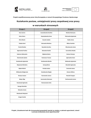Projekt współfinansowany przez Unię Europejską w ramach Europejskiego Funduszu Społecznego Kształcenie postaw, umiejętności pracy zespołowej oraz pracy w warunkach stresowych Grupa 1 Grupa2 Grupa3 Koss Joanna Lewandowska Karolina Mańska Katarzyna Kulus Estera Kasprzykowska Anna Piotrowska Agnieszka Mróz Marek Gryczka Izabela Radka Aneta Tabaka Karol Murawska Marlena Miłosz Karolina Pschuk Monika Rywalska Karolina Mieczkowska Aneta Ogonowska Paulina Butowska Kamila Czerwińska Natalia Salamon Aleksandra Głębocka Marta Kulesza Patrycja Świerżewska Sylwia Kostrzewa Tomasz Zgórzyńska Daria Koziołowska Agnieszka Rembowska Monika Mielewska Agnieszka Majewska Michalina Swirog Marta Maciołek Agnieszka Dąbek Michał Partyka Łukasz Żeromski Łukasz Witkowska Małgorzata Dawidowska Magda Ataman Milena Stempa Justyna Karwowska Joanna Nowiak Grzegorz Nałęcz Olga Jaranowska Katarzyna Ciechanowska Iwona Kowalczyk Agnieszka Romanowska Anita Starego Dominika Wiewióra Aneta Mankowski Wojciech Dragan Kamila Projekt „Kształcenie kadr dla innowacyjnej gospodarki opartej na wiedzy w zakresie agrochemii, chemii i ochrony środowiska (Inno-AgroChemOś)”