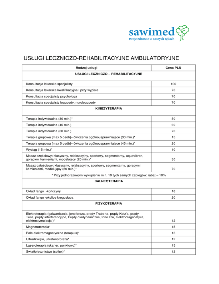 USŁUGI LECZNICZO-REHABILITACYJNE AMBULATORYJNE Rodzaj usługi Cena PLN USŁUGI LECZNICZO – REHABILITACYJNE Konsultacja lekarska specjalisty 100 Konsultacja lekarska kwalifikacyjna I przy wypisie 70 Konsultacja specjalisty psychologa 70 Konsultacja specjalisty logopedy, nurologopedy 70 KINEZYTERAPIA Terapia indywidualna (30 min.)* 50 Terapia indywidualna (45 min.) 60 Terapia indywidualna (60 min.) 70 Terapia grupowa [max 5 osób]– ćwiczenia ogólnousprawniające (30 min.)* 15 Terapia grupowa [max 5 osób]– ćwiczenia ogólnousprawniające (45 min.)* 20 Wyciąg (15 min.)* 10 Masaż częściowy: klasyczny, relaksacyjny, sportowy, segmentarny, aquavibron, gorącymi kamieniami, modelujący (20 min.)* 30 Masaż całościowy: klasyczny, relaksacyjny, sportowy, segmentarny, gorącymi kamieniami, modelujący (50 min.)* 70 * Przy jednorazowym wykupieniu min. 10 tych samych zabiegów: rabat – 10% BALNEOTERAPIA Okład fango -kończyny 18 Okład fango -okolice kręgosłupa 20 FIZYKOTERAPIA Elektroterapia (galwanizacja, jonoforeza, prądy Traberta, prądy Kotz’a, prądy Tens, prądy interferencyjne, Prądy diadynamiczne, tono liza, elektrodiagnostyka, elektrostymulacja )* 12 Magnetoterapia* 15 Pole elektromagnetyczne (terapuls)* 15 Ultradźwięki, ultrafonoforeza* 12 Laseroterapia (skaner, punktowo)* 15 Światłolecznictwo (sollux)* 12 Krioterapia miejscowa* 18 Drenaż limfatyczny [mechaniczny] 15-20 min * 30 Hydroterapia (masaż wirowy częściowy,)* 20 Hydroterapia (masaż wirowy całkowity)* 50 Masaż aquavibron (50 min.)* 70 Okłady mineralne 12 * Przy jednorazowym wykupieniu min. 10 tych samych zabiegów: rabat – 10% TERAPIA ZAJĘCIOWA Biofeedback (45 min.) 50 Indywidualna (30 min.) 60 Grupowa 2-4 os. (45 min.) 40 LOGOPEDIA Ćwiczenia logopedyczne (50 min.) 80 Ćwiczenia neurologopedyczne (45 min.) 90 POZOSTAŁE USŁUGI Świecowanie uszu 35 EKG 40 Toksyna botulinowa Kriokomora [outsourcing] wyjazd do Siedlec grupa. 7 osób indywidualnie 40