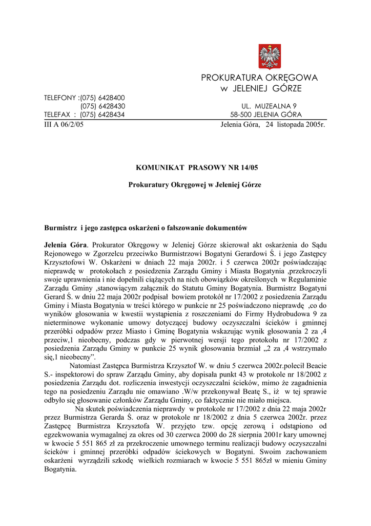 PROKURATURA OKRĘGOWA w JELENIEJ GÓRZE TELEFONY :(075) 6428400 (075) 6428430 TELEFAX : (075) 6428434 III A 06/2/05 UL. MUZEALNA 9 58-500 JELENIA GÓRA Jelenia Góra, 24 listopada 2005r. KOMUNIKAT PRASOWY NR 14/05 Prokuratury Okręgowej w Jeleniej Górze Burmistrz i jego zastępca oskarżeni o fałszowanie dokumentów Jelenia Góra. Prokurator Okręgowy w Jeleniej Górze skierował akt oskarżenia do Sądu Rejonowego w Zgorzelcu przeciwko Burmistrzowi Bogatyni Gerardowi Ś. i jego Zastępcy Krzysztofowi W. Oskarżeni w dniach 22 maja 2002r. i 5 czerwca 2002r poświadczając nieprawdę w protokołach z posiedzenia Zarządu Gminy i Miasta Bogatynia ,przekroczyli swoje uprawnienia i nie dopełnili ciążących na nich obowiązków określonych w Regulaminie Zarządu Gminy ,stanowiącym załącznik do Statutu Gminy Bogatynia. Burmistrz Bogatyni Gerard Ś. w dniu 22 maja 2002r podpisał bowiem protokół nr 17/2002 z posiedzenia Zarządu Gminy i Miasta Bogatynia w treści którego w punkcie nr 25 poświadczono nieprawdę ,co do wyników głosowania w kwestii wystąpienia z roszczeniami do Firmy Hydrobudowa 9 za nieterminowe wykonanie umowy dotyczącej budowy oczyszczalni ścieków i gminnej przeróbki odpadów przez Miasto i Gminę Bogatynia wskazując wynik głosowania 2 za ,4 przeciw,1 nieobecny, podczas gdy w pierwotnej wersji tego protokołu nr 17/2002 z posiedzenia Zarządu Gminy w punkcie 25 wynik głosowania brzmiał „2 za ,4 wstrzymało się,1 nieobecny”. Natomiast Zastępca Burmistrza Krzysztof W. w dniu 5 czerwca 2002r.polecił Beacie S.- inspektorowi do spraw Zarządu Gminy, aby dopisała punkt 43 w protokole nr 18/2002 z posiedzenia Zarządu dot. rozliczenia inwestycji oczyszczalni ścieków, mimo że zagadnienia tego na posiedzeniu Zarządu nie omawiano .W/w przekonywał Beatę S., iż w tej sprawie odbyło się głosowanie członków Zarządu Gminy, co faktycznie nie miało miejsca. Na skutek poświadczenia nieprawdy w protokole nr 17/2002 z dnia 22 maja 2002r przez Burmistrza Gerarda Ś. oraz w protokole nr 18/2002 z dnia 5 czerwca 2002r. przez Zastępcę Burmistrza Krzysztofa W. przyjęto tzw. opcję zerową i odstąpiono od egzekwowania wymagalnej za okres od 30 czerwca 2000 do 28 sierpnia 2001r kary umownej w kwocie 5 551 865 zł za przekroczenie umownego terminu realizacji budowy oczyszczalni ścieków i gminnej przeróbki odpadów ściekowych w Bogatyni. Swoim zachowaniem oskarżeni wyrządzili szkodę wielkich rozmiarach w kwocie 5 551 865zł w mieniu Gminy Bogatynia. Wobec obu sprawców zastosowano środek zapobiegawczy w postaci dozoru policji.Za przestępstwo niegospodarności i wyrządzenie szkody w wielkich rozmiarach oskarżonym grozi kara od 1 roku do10lat pozbawienia wolności. Nauczyciel Kolegium Karkonoskiego skazany za molestowanie studentki Jelenia Góra. W dniu 2 listopada 2005r. przed Sądem Rejonowym w Jeleniej Górze zakończył się proces przeciwko pracownikowi naukowemu Kolegium Karkonoskiego w Jeleniej Górze Przemysławowi K., którego Prokurator Rejonowy w Jeleniej Górze oskarżył o to, że w okresie od kwietnia 2003 do czerwca 2004r wykorzystując stosunek zależności łączący go ze studentką uczelni ,na której był zatrudniony, kilkakrotnie doprowadził ją do poddania się czynnościom seksualnym ,które polegały na dotykaniu jej przez oskarżonego po łydkach i całowaniu w usta oraz szyję. Ze zgromadzonego w niniejszej sprawie w toku postępowania karnego materiału dowodowego wynika także ,iż oskarżony Przemysław K. wielokrotnie proponował pokrzywdzonej Justynie J. odbycie z nim stosunku seksualnego, na co ona nie wyrażała zgody. Dlatego też oskarżony w przededniu egzaminu z prowadzonego przez niego przedmiotu ,wprost powiedział pokrzywdzonej, że konsekwentnie przyjętej, negatywnej postawy wobec niego odczuje w dniu egzaminu. Oskarżony od samego początku nie przyznał się do zarzucanego mu występku. Mimo to Sąd Rejonowy w Jeleniej Górze uznał go winnym popełnienia czynu z art. 13&1kk w zw. z art.199kk w zw. z art..12kk tj. usiłowania popełnienia przestępstwa nadużycia zależności i za to wymierzył mu karę 1 roku pozbawienia wolności z warunkowym zawieszeniem jej wykonania na okres 2 lat oraz orzekł zakaz wykonywania zawodu nauczyciela na okres 2 lat. Powyższy wyrok nie jest prawomocny. Prokurator Rejonowy w Jeleniej Górze zwrócił się do Sądu o doręczenie uzasadnienia wyroku na piśmie ,albowiem rozważa możliwość wniesienia apelacji co do przyjętej przez Sąd kwalifikacji prawnej czynu przypisanego oskarżonemu. 25 lat za zabójstwo pracownika firmy Provident Jelenia Góra. W dniu 17 listopada 2005r.Sąd Okręgowy w Jeleniej Górze wydal wyrok w sprawie przeciwko 20-letniemu Piotrowi F oraz 20-letniemu Sławomirowi P. mieszkańcom Bogatyni, których Prokurator Rejonowy w Zgorzelcu oskarżył o zabójstwo ze szczególnym okrucieństwem, z motywacji zasługującej na szczególne potępienie, w związku z dokonaniem rozboju, pracownika firmy Provident Dariusza P. Do zbrodni doszło w dniu 18 maja 2004r w Bogatyni, kiedy to Dariusz P. udał się do mieszkania Sławomira P. aby przyjąć od niego kolejną tygodniową ratę spłaty kredytu. Gdy pracownik firmy Provident zainkasował od oskarżonego pieniądze w kwocie 28zł 70 groszy i zamierzał wyjść, został zaatakowany przez oskarżonych Piotra F oraz Sławomira P, którzy zaczęli go bić po głowie drewnianą nogą od stołu. Następnie po obezwładnieniu ofiary zabrali jej portfel z pieniędzmi ,po czym włożyli Dariusza P. do szafki segmentu meblowego i mimo tego ,że jeszcze żył wynieśli do piwnicy Tam go pozostawili powodując jego zgon. Prokurator zażądał dla obu oskarżonych za zarzucaną im zbrodnię kary dożywotniego pozbawienia wolności z możliwością warunkowego przedterminowego zwolnienia po upływie 30 lat oraz pozbawienia praw publicznych na okres 10 lat. Sąd Okręgowy w Jeleniej Górze uznał jednak, że zabójstwa