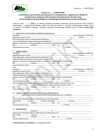 Umowa nr ..../-30/FP/2016 Umowa nr ....../-30/FP/2016 o refundację części kosztów poniesionych na wynagrodzenia, nagrody oraz składki na ubezpieczenia społeczne skierowanych bezrobotnych do 30 roku życia dla pracodawcy lub przedsiębiorcy niebędącego beneficjentem pomocy publicznej zawarta w dniu .............2016 r. w Lubaniu pomiędzy Powiatem Lubańskim reprezentowanym przez Starostę Lubańskiego, z upoważnienia którego działa Pani Krystyna Mucha - Dyrektor Powiatowego Urzędu Pracy w Lubaniu / Pani Bożena Jasińska – Zastępca Dyrektora Powiatowego Urzędu Pracy w Lubaniu zwany dalej „Urzędem” a 1) (osoba fizyczna prowadząca działalność gospodarczą) Panią/em …………………………………………………………………………………..………………………….. prowadzącą/ym działalność gospodarczą pod nazwą ………………………………………………………………………………….………………… , od dnia …………….. r. adres głównego miejsca wykonywania działalności: .............................................................................................., adresy dodatkowych miejsc wykonywania działalności: ........................................................................................, zgodnie z wpisem do Centralnej Ewidencji i Informacji o Działalności Gospodarczej, NIP ……………………………… REGON ……………………………… PKD …….Z – …………………………. . reprezentowany przez: ………………………………………………………………………… nr PESEL: ……………………………................. 2) (spółka cywilna) Panią/em …………………………………………………………………………………..………………………….. prowadzącą/ym działalność gospodarczą pod nazwą ………………………………………………………………………………….………………… , od dnia …………….. r. adres głównego miejsca wykonywania działalności: ..............................................................................................., adresy dodatkowych miejsc wykonywania działalności: ........................................................................................, zgodnie z wpisem do Centralnej Ewidencji i Informacji o Działalności Gospodarczej, NIP ……………………………… REGON ……………………………… PKD …….Z – …………………………. . reprezentowany przez: ………………………………………………………………………… nr PESEL: ……………………………................. oraz Panią/em …………………………………………………………………………………..………………………….. prowadzącą/ym działalność gospodarczą pod nazwą ………………………………………………………………………………….………………… , od dnia …………….. r. adres głównego miejsca wykonywania działalności: ..............................................................................................., adresy dodatkowych miejsc wykonywania działalności: ........................................................................................., zgodnie z wpisem do Centralnej Ewidencji i Informacji o Działalności Gospodarczej, NIP ……………………………… REGON ……………………………… PKD …….Z – …………………………. . reprezentowany przez: ……………………………………………………………………… nr PESEL: ……………………………................. prowadzącymi wspólnie działalność gospodarczą w formie spółki cywilnej pod nazwą ..........................................., na podstawie umowy spółki cywilnej zawartej w dniu .............................................. . NIP ……………………………… REGON ……………………………… PKD …….Z – …………………………. . reprezentowany przez: …………………………………………………………………………… 3) ( spółka z ograniczoną odpowiedzialnością, spółka akcyjna ) ................... spółką z ograniczoną odpowiedzialnością/spółką akcyjną/ z siedzibą w .............................................. ul................................................................................................................................................................................ wpisaną do Krajowego Rejestru Sądowego prowadzonego przez ............................................................................ pod nr KRS: ………...…, od dnia ……………., Kapitał zakładowy: ............................ (słownie: .....................................) NIP ……………………………… REGON ……………………………… PKD …….Z – …………………………………………………………………. reprezentowaną przez: ……………………………………………………………………… nr PESEL: ……………………………................. 4) (spółka jawna) …………………………………. z siedzibą w ............................ ul. ....................................................................................... wpisaną do Krajowego Rejestru Sądowego prowadzonego przez ............................................................................ pod nr KRS: ………....………, od dnia …………………. NIP ……………………………… REGON ……………………………… PKD …….Z – ………………………………………………………………. reprezentowaną przez: …………………………………………………………………………… nr PESEL: …………