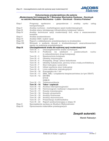 Etap IX – Uszczegółowienie analiz dla wybranej opcji modernizacji linii Dokumentacja przedprojektowa dla zadania „Modernizacja linii kolejowej Nr 7 Warszawa Wschodnia Osobowa - Dorohusk na odcinku Warszawa Wschodnia - Lublin - Dorohusk - Granica Państwa” Etap I Etap II Etap III Etap IV Etap V Etap VI Etap VII Etap VIII Etap IX Etap X Etap XI Prognozy społeczno - gospodarcze i analizy rynku usług transportowych Analizy ruchowo - marketingowe opcji modernizacyjnych Analiza stanu istniejącego infrastruktury kolejowej i taboru Analizy techniczne opcji modernizacji linii, wraz z oszacowaniem kosztów Analiza środowiskowa Analiza CBA i wybór opcji Raport o oddziaływaniu przedsięwzięcia na środowisko Wniosek o wydanie decyzji o środowiskowych uwarunkowaniach zgody na realizację przedsięwzięcia Uszczegółowienie analiz dla wybranej opcji modernizacji linii Tom IX - 1 Uszczegółowienie analiz ruchowych Tom IX - 2 Podtorze na szlakach i posterunkach ruchu (z odwodnieniem drogi kolejowej) Tom IX - 3 Nawierzchnia kolejowa Tom IX - 4 Obiekty inżynieryjne Tom IX - 5 Przejazdy, drogi i place ładunkowe Tom IX - 6 Obiekty kubaturowe, perony wraz z małą architekturą Tom IX - 7 Sieć trakcyjna i powrotna Tom IX - 8 Układ zasilania sieci trakcyjnej Tom IX - 9 Linia odbiorów nietrakcyjnych Tom IX - 10 Energetyka do 1 kV Tom IX - 11 SRK, SBL i urządzenia bezpieczeństwa (w tym DSAT) Tom IX - 12 ERTMS ETCS GSM-R Tom IX - 13 Telekomunikacja Tom IX - 14 Tabor i zaplecze Tom IX - 15 Analiza interoperacyjności Tom IX - 16 Harmonogram realizacji i etapowania robót Tom IX - 17 Koszty inwestycyjne Tom IX - 18 Koszty utrzymania Tom IX - 19 Analizy finansowe Tom IX - 20 Analizy ekonomiczne Tom IX - 21 Prezentacja multimedialna Tom IX - 22 Raport podsumowujący z etapu IX Sporządzenie syntezy ze Studium Wykonalności Opracowanie materiałów przetargowych Zespół autorski: Marek Rabsztyn TOM IX-14 Tabor i zaplecze strona 2 Etap IX – Uszczegółowienie analiz dla wybranej opcji modernizacji linii Spis treści Rozdział Strona SPIS TREŚCI........................................................................................................ 3 SPIS TABEL ......................................................................................................... 4 WYKAZ ZAŁĄCZNIKÓW ..................................................................................... 4 1. STAN DOTYCHCZASOWY ........................................................................ 5 Wstęp ................................................................................................................................................ 5 Analiza istniejącego taboru ........................................................................................................ 6 1.2.1 Elektryczne zespoły trakcyjne ............................................................................................. 6 1.2.2 Lokomotywy elektryczne ...................................................................................................... 6 1.2.3 Lokomotywy spalinowe ......................................................................................................... 7 1.2.4 Wagony pasażerskie .............................................................................................................. 7 1.2.5 Wagony towarowe .................................................................................................................. 7 1.3 Ocena posiadanego taboru trakcyjnego ................................................................................. 7 1.1 1.2 2. STAN PLANOWANY .................................................................................. 9 Dobór taboru w zależności od przedstawionych opcji modernizacji linii ....................... 9 Wymagania dotyczące taboru do ruchu regionalnego ........................................................ 9 Pociągi regionalne ........................................................................................................................ 9 2.3.1 Charakterystyka pociągów do ruchu regionalnego ....................................................... 9 2.3.2 Rynek taboru do ruchu regionalnego ...............................................................................10 2.3.3 Ceny taboru do ruchu regionalnego .................................................................................10 2.3.4 Proponowany tabor do ruchu regionalnego ...................................................................11 2.4 Opis wybranych zespołów trakcyjnych ..................................................................................12 2.5 Pociągi międzyregionalne ..........................................................................................................13 2.5.1 Charakterystyka pociągów do ruchu międzyregionalnego ........................................13 2.5.2 Proponowany tabor do ruchu międzyregionalnego na linii Warszawa – Lublin – Dorohusk ..................................................................................................................................13 2.5.3 Tabor wagonowy pasażerski do przewozów międzyregionalnych dla linii Warszawa – Lublin – Dorohusk – granica państwa ......................................................15 2.5.4 Tabor do przewozów towarowych na linii Warszawa – Lublin – Dorohusk – granica państwa .....................................................................................................................15 2.6 Tabor z przechylnym nadwoziem .............................................................................................15 2.7 Koszty utrzymania taboru w okresie całego życia taboru .................................................16 2.7.1 Utrzymanie taboru kursującego na linii Warszawa – Lublin – Dorohusk – granica państwa ..........................................................................................................