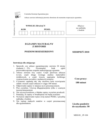 Centralna Komisja Egzaminacyjna Układ graficzny © CKE 2010 Arkusz zawiera informacje prawnie chronione do momentu rozpoczęcia egzaminu. WPISUJE ZDAJĄCY KOD PESEL Miejsce na naklejkę z kodem EGZAMIN MATURALNY Z HISTORII POZIOM ROZSZERZONY SIERPIEŃ 2010 Instrukcja dla zdającego 1. Sprawdź, czy arkusz egzaminacyjny zawiera 24 strony (zadania 1 – 25). Ewentualny brak zgłoś przewodniczącemu zespołu nadzorującego egzamin. 2. Arkusz zawiera trzy części. Część pierwsza arkusza to test, część druga wymaga analizy materiałów źródłowych, a część trzecia napisania krótkiego wypracowania na jeden z podanych tematów. 3. Czynności zaplanuj tak, aby możliwe było rozwiązanie zadań z trzech części arkusza w ciągu 180 minut. 4. Odpowiedzi zapisz w miejscu na to przeznaczonym. 5. Pisz czytelnie. Używaj długopisu/pióra tylko z czarnym tuszem/atramentem. 6. Nie używaj korektora, a błędne zapisy wyraźnie przekreśl. 7. Pamiętaj, że zapisy w brudnopisie nie będą oceniane. 8. Na karcie odpowiedzi wpisz swój numer PESEL i przyklej naklejkę z kodem. 9. Nie wpisuj żadnych znaków w części przeznaczonej dla egzaminatora. Czas pracy: 180 minut Liczba punktów do uzyskania: 50 MHI-R1_1P-104 Egzamin maturalny z historii Poziom rozszerzony 2 CZĘŚĆ I (20 punktów) Zadanie 1. (1 pkt) Wyjaśnij zmianę w sposobie życia ludzi, jaką przyniosła rewolucja neolityczna. ....................................................................................................................................................... ....................................................................................................................................................... ....................................................................................................................................................... Zadanie 2. (1 pkt) Na podstawie tekstu i własnej wiedzy wykonaj polecenie. [Arystoteles o zgromadzeniach ludowych] Na pierwszym z nich, zwanym głównym, musi się przeprowadzić głosowanie nad urzędnikami, czy zdaniem ludu dobrze swe czynności spełniają, omówić sprawy zaopatrzenia w zboże, jako też obrony kraju. Chcący wnieść skargę o zdradę stanu, muszą to w tym dniu właśnie uczynić. […] Drugie zgromadzenie przeznaczone jest na rozpatrzenie próśb. Każdy obywatel wedle woli może na znak prośby złożyć gałązkę i przedstawić ludowi sprawę, jaką zechce czy to osobistą, czy publiczną. […] Na zgromadzeniu ludowym odbywają się też wybory strategów, hipparchów (dowódców jazdy) i innych władz wojskowych w sposób, jaki lud postanowi. Źródło: J. Tazbirowa, E. Wipszycka, Historia. Starożytność, Podręcznik dla szkół średnich, Warszawa 1996, s. 98. Podaj nazwę ustroju politycznego opisanego w tekście źródłowym i wymień dwie funkcje, jakie pełniło zgromadzenie ludowe. Nazwa ustroju: ........................................................................................................................... Funkcje: • ................................................................................................................................................. • ................................................................................................................................................. Zadanie 3. (1 pkt) Uzupełnij poniższy tekst, wpisując w wykropkowane miejsca brakujące słowa. Upadek Cesarstwa Rzymskiego na Zachodzie to długotrwały proces. Znalazł on swoją kulminację w roku (1) ........................ , kiedy to wódz germański Odoaker usunął z tronu cesarza imieniem (2) .................................................................................. , a następnie odesłał insygnia koronacyjne do (3) (podaj nazwę miasta) ........................................................... . Krok ten przywrócił formalną jedność Cesarstwa. Egzamin maturalny z historii Poziom rozszerzony 3 Zadanie 4. (1 pkt) Rozstrzygnij, czy plan (źródło 1) i tekst (źródło 2) dotyczą tych samych wydarzeń. Uzasadnij odpowiedź. Źródło 1. Źródło: J. Dowiat, Historia I, Warszawa 1987, s. 414. Źródło 2. […] doszło do działań wojennych, poprzedzonych sojuszem z księciem Litwy […]. Wspólna wyprawa przeciwko Brandenburgii, w tym czasie sprzymierzonej z Luksemburgami, doprowadziła do poważnych konsekwencji. Do Wielkopolski wkroczyli Krzyżacy, związani układem z książętami mazowieckimi, rozpuszczając po całej Europie wieści o przymierzu zawartym przez polskiego króla z wrogami chrześcijaństwa. […] Nastąpiło koncentryczne uderzenie wojsk czeskich i zakonnych […]. Obie armie najeźdźcze były zdecydowanie silniejsze, Polska była zniszczona i wyczerpana […]. Źródło: Historia Polski do roku 1586, t. 1, Biblioteka Gazety Wyborczej, Warszawa 2007, s. 152–153. ....................................................................................................................................................... ....................................................................................................................................................... ....................................................................................................................................................... ...................................................................................................................................................... Egzamin maturalny z historii Poziom rozszerzony 4 Zadanie 5. (2 pkt) Na podstawie tekstu i własnej wiedzy wykonaj polecenia A i B. Grupa krewniacza miała też prawo do pomsty i główszczyzny w przypadku zabójstwa któregoś z jej członków. Władza monarsza starała się łagodzić surowe zwyczaje obowiązujące w tym zakresie, usiłując położyć nacisk na kary pieniężne, których istotna część zasilała zresztą komorę książęcą. Sama procedura sądowa opierała się na zeznani