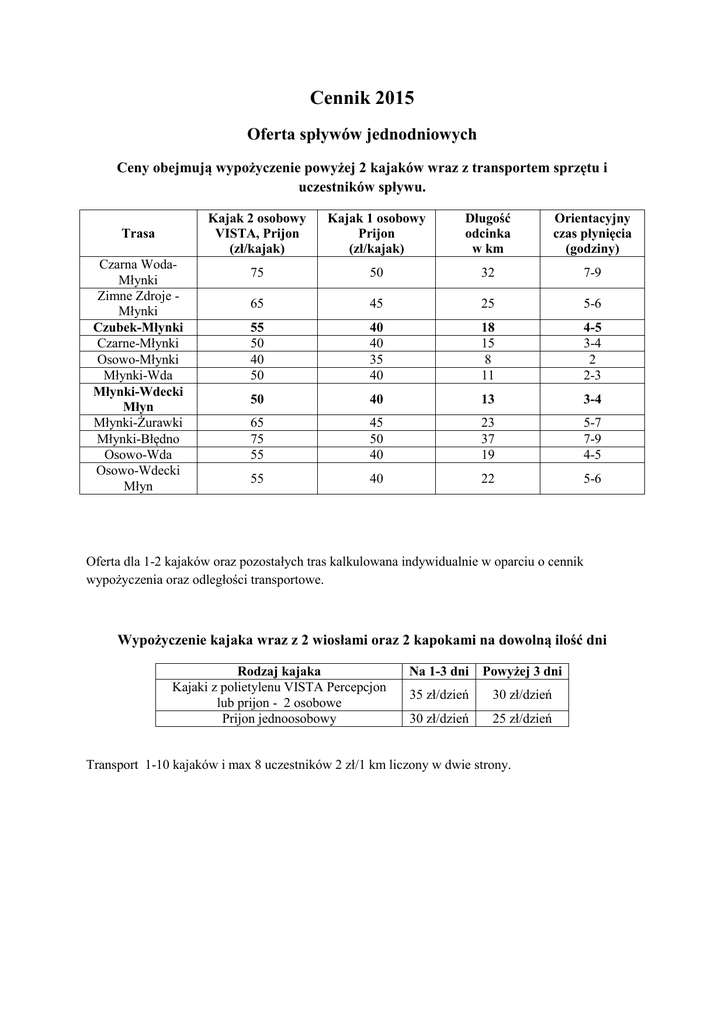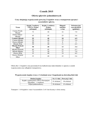 Cennik 2015 Oferta spływów jednodniowych Ceny obejmują wypożyczenie powyżej 2 kajaków wraz z transportem sprzętu i uczestników spływu. Trasa Czarna WodaMłynki Zimne Zdroje Młynki Czubek-Młynki Czarne-Młynki Osowo-Młynki Młynki-Wda Młynki-Wdecki Młyn Młynki-Żurawki Młynki-Błędno Osowo-Wda Osowo-Wdecki Młyn Kajak 2 osobowy VISTA, Prijon (zł/kajak) Kajak 1 osobowy Prijon (zł/kajak) Długość odcinka w km Orientacyjny czas płynięcia (godziny) 75 50 32 7-9 65 45 25 5-6 55 50 40 50 40 40 35 40 18 15 8 11 4-5 3-4 2 2-3 50 40 13 3-4 65 75 55 45 50 40 23 37 19 5-7 7-9 4-5 55 40 22 5-6 Oferta dla 1-2 kajaków oraz pozostałych tras kalkulowana indywidualnie w oparciu o cennik wypożyczenia oraz odległości transportowe. Wypożyczenie kajaka wraz z 2 wiosłami oraz 2 kapokami na dowolną ilość dni Rodzaj kajaka Kajaki z polietylenu VISTA Percepcjon lub prijon - 2 osobowe Prijon jednoosobowy Na 1-3 dni Powyżej 3 dni 35 zł/dzień 30 zł/dzień 30 zł/dzień 25 zł/dzień Transport 1-10 kajaków i max 8 uczestników 2 zł/1 km liczony w dwie strony. Przykładowe oferty tras kajakowych przy wypożyczeniach kajaków na dwa dni: 1. Nocleg na polu namiotowym w Młynkach a. Czarne – Młynki – Wda (15+10 = 25 km) b. Czubek – Młynki – Wdecki Młyn (18+13 = 31 km) c. Zimne Zdroje – Młynki – Wdecki Młyn (25+13 = 38 km) Opis spływu: - przyjazd na pole namiotowe „Boberek” (zakwaterowanie) - Transport kajaków oraz uczestników na miejsce startu - spływ do Młynek - nocleg na polu namiotowym „Boberek” - rano spływ w dół rzeki do miejsca zakończenia spływu (Wda lub Wdecki Młyn) - odbiór - transport kajaków oraz uczestników do Młynek - Zakończenie spływu – wyjazd do domu. - podczas spływu uczestnicy indywidualnie ponoszą koszty pobytu, noclegu, wyżywienia oraz ubezpieczenia. 2. Start w Młynkach – nocleg na trasie a. Młynki – Wdecki Młyn- Żurawki (13km + 10km = 23 km) b. Młynki – Wd.Młyn – Błędno (13km + 24km = 37 km) c. Młynki – Żurawki – Błędno (23km + 14km = 37 km) d. Młynki – Żurawki –Stara Rzeka (23km + 29km = 52 km) Opis spływu: - przyjazd na pole namiotowe „Boberek” - wydanie sprzętu uczestników - załadunek wyposażenia do kajaków - spływ w dół rzeki - nocleg na polu namiotowym na trasie (Wdecki Młyn lub Żurawki) - spływ w dół rzeki - odbiór – transport kajaków oraz uczestników spływu do Młynek - Zakończenie spływu – wyjazd do domu. - podczas spływu uczestnicy indywidualnie ponoszą koszty pobytu, noclegu, wyżywienia oraz ubezpieczenia. 3. Kończenie spływu w Młynkach na polu namiotowym „Boberek” a. Czarna Woda – Czarne – Młynki (17km + 15km = 32 km) b. Wojtal – Zimne Zdroje – Młynki (17km + 25km = 42 km) c. Borsk – Czarna Woda –Młynki (23km +32 km = 55 km) Opis spływu: - przyjazd na pole namiotowe „Boberek” w Młynkach - transport kajaków, wyposażenia oraz uczestników na miejsce startu - wydanie kajaków, załadunek wyposażenia do kajaków - spływ w dół rzeki na nocleg - nocleg na trasie na wybranym polu namiotowym - rano spływ do Młynek, zwrot sprzętu - zakończenie spływu – wyjazd do domu - podczas spływu uczestnicy indywidualnie ponoszą koszty pobytu, noclegu, wyżywienia oraz ubezpieczenia. 4. Inne trasy na Wdzie a. Wdecki Młyn – Błędno – Tleń (trasa leśna bardzo malownicza) (24km+22km=46 km) b. Lipusz – Wdzydze- Wojtal (23km + 18km = 41 km) c. Borsk- Czarna Woda – Czarne (23km + 17km = 40 km Opis spływu: - przyjazd na pole namiotowe „Boberek” w Młynkach - transport kajaków, wyposażenia oraz uczestników na miejsce startu - wydanie kajaków, załadunek wyposażenia do kajaków - spływ w dół rzeki na nocleg - nocleg na trasie na wybranym polu namiotowym - spływ w dół rzeki na umówione miejsce kończenia spływu - odbiór – transport kajaków oraz uczestników spływu do Młynek - zakończenie spływu – wyjazd do domu - podczas spływu uczestnicy indywidualnie ponoszą koszty, pobytu, noclegu, wyżywienia oraz ubezpieczenia. 5. Trasy na Brdzie a. Rytel lub Mylof – nocleg w Woziwodzie – kończenie spływu w Rudzkim Moście lub Świcie (19km lub 25km + 20km lub 25 km) b. Woziwoda - Świt - Zamrzenica - 36 km Opis spływu: - przyjazd na pole namiotowe „Boberek” w Młynkach - transport kajaków, wyposażenia oraz uczestników na miejsce startu - wydanie kajaków, załadunek wyposażenia do kajaków - spływ w dół rzeki na nocleg - nocleg na trasie na wybranym polu namiotowym - spływ w dół rzeki na umówione miejsce kończenia spływu - odbiór – transport kajaków oraz uczestników spływu do Młynek - zakończenie spływu – wyjazd do domu - podczas spływu uczestnicy indywidualnie ponoszą koszty, pobytu, noclegu, wyżywienia oraz ubezpieczenia. 6. Trasy trzydniowe na Wdzie a. Młynki – Wdecki Młyn- Błędno – Tleń (13km + 24km + 22 km = 59 km) b. Borsk –Czarna Woda – Czarne - Młynki (23 km + 17 km + 15km = 55 km) 7. Trasy kilkudniowe na Wdzie, Brdzie lub Wieżycy Zaproponuj rzekę, trasę spływu, a my przedstawimy Tobie propozycję oraz koszty