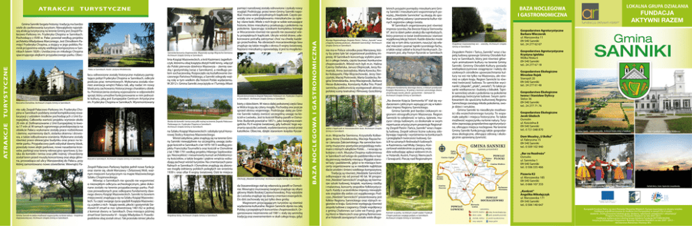 TURYSTYCZNE ATRAKCJE TURYSTYCZNE Gmina Sanniki bogata historią i tradycją ma bardzo wiele do zaoferowania turystom. Niewątpliwie największą atrakcją turystyczną na terenie Gminy jest Zespół Pałacowo-Parkowy im. Fryderyka Chopina w Sannikach. Pochodzący z XVIII w. Pałac powstał według projektu architekta Władysława Marconiego. Jest Ośrodkiem Pamięci Fryderyka Chopina, a stojący w jego pobliżu Pomnik przypomina wizytę wielkiego kompozytora w Sannikach latem 1828 r. Uwidacznia on młodego Chopina spacerującego alejkami przypałacowego parku. Obec- Sannickie koncerty chopinowskie. Wspaniały występ Wojciecha Siemiona. Archiwum Urzędu Gminy w Sannikach. Pałac w Sannikach. Autor: Justyna Wróblewska. Kościół w Osmolinie. Archiwum Urzędu Gminy w Sannikach. nie cały Zespół Pałacowo-Parkowy im. Fryderyka Chopina w Sannikach poddany został kompleksowej rewaloryzacji z udziałem środków pochodzących z Unii Europejskiej. Całkowita wartość projektu wyniesie około 20 mln zł. Dofinansowanie z Unii Europejskiej to kwota 17 mln zł. W ramach ogromnego przedsięwzięcia na obiekcie Pałacu wykonane zostały prace rozbiórkowe i ziemne, wymieniony dach, stolarka okienna i drzwiowa, a także odbudowana oranżeria. Wykonane zostały również prace elewacyjne budynku oraz prace na terenie parku. Przypałacowy park odzyskał dawny blask, powstały nowe alejki parkowe, nowe nasadzenia krzewów, parkingi oraz tereny rekreacyjno-sportowe, tj. boiska do kometki i tenisa oraz piłki nożnej. Utwardzony został teren przed muszlą koncertową oraz aleja główna, prowadząca od ulicy Warszawskiej do Pałacu, przy której zamontowano nowe oświetlenie. Wewnątrz Pa- Gmina Sanniki to także możliwość wypoczynku na łonie natury – krajobraz mazowieckiej wsi. Archiwum Urzędu Gminy w Sannikach. pamięci narodowej zostały odnowione i zyskały nowy wygląd. Podróżując przez teren Gminy Sanniki napotkać można wiele przydrożnych kapliczek. Często powstały one w podziękowaniu mieszkańców za opiekę i dane łaski. Wiele z nich kryje w sobie wzruszające historie, które mieszkańcy przekazują z pokolenia na pokolenie. Spacerując ścieżkami kompleksu leśnego w Mocarzewie również nie sposób nie zauważyć wielu przepięknych kapliczek. Ukryte wśród drzew, udekorowane potrafią zatrzymać choć na chwilę każdego przechodnia. Na obrzeżach mocarzewskiego lasu znajduje się także mogiła z okresu II wojny światowej. Najstarsi mieszkańcy opowiadają, iż jest to mogiła ko- łacu odtworzone zostały historyczne malatury pamiętające pobyt Fryderyka Chopina w Sannikach, odkryte podczas prac remontowych. Wykonana została również aranżacja wnętrz Pałacu tak, aby nadać im nowy blask przy zachowaniu historycznego charakteru obiektu. Pomieszczenia zostaną wyposażone w odpowiedni sprzęt, który umożliwi funkcjonowanie w nim jednostki kultury, jaką jest Europejskie Centrum Artystyczne im. Fryderyka Chopina w Sannikach. Wyremontowany linia Książąt Mazowieckich, a król Kazimierz Jagiellończyk, któremu obaj książęta złożyli hołd lenny, włączył do Polski pierwsze dzielnice Mazowsza – ziemię rawską i gostynińską (wraz z Sannikami), a niedługo potem sochaczewską. Rozpoczęło się kształtowanie ówczesnego Państwa Polskiego, a Sanniki odegrały ważną rolę w tym wielkim dla historii Polski wydarzeniu. W 2012 r. Gmina Sanniki zwyciężyła w I Turnieju Miast Muszla koncertowa w Zespole Pałacowo-Parkowym im. Fryderyka Chopina w Sannikach. Archiwum Urzędu Gminy w Sannikach. Boiska do kometki i tenisa oraz piłki nożnej na terenie Zespołu PałacowoParkowego im. Fryderyka Chopina w Sannikach. Archiwum Urzędu Gminy w Sannikach. Kościół w Sannikach. Archiwum Urzędu Gminy w Sannikach. Zespół Pałacowo-Parkowy będzie pełnił nowe funkcje oraz stanie się, obok Warszawy i Żelazowej Woli, ważnym miejscem turystycznym na mapie Mazowieckiego Szlaku Chopinowskiego. Mówiąc o Sannikach nie sposób nie wspomnieć o niezwykłym odkryciu archeologicznym, jakie dokonane zostało na terenie przypałacowego parku. Podczas prowadzonych prac odkopano fundamenty dawnego dworu Książąt Mazowieckich. Sanniki to bowiem miejscowość znajdująca się na Szlaku Książąt Mazowieckich. Tu część swojego życia spędzili Książęta Mazowieccy, a jeden z nich - książę rawski, płocki i gostyniński Siemowit VI zmarł w noc sylwestrową 1461/62 w jednej z komnat dworu w Sannikach. Dwa miesiące później zmarł brat Siemowita VI – książę Władysław II. Prawdopodobnie obaj zostali otruci. Tak przestała istnieć płocka na Szlaku Książąt Mazowieckich i zdobyła tytuł Honorowej Stolicy Księstwa Mazowieckiego. Wśród zabytków, jakie znajdują się na terenie Gminy Sanniki niewątpliwie na szczególną uwagę zasługuje kościół w Sannikach z lat 1870-1872 według projektu Franciszka Tournelle’a oraz kościół w Osmolinie z lat 1788-1791 według projektu Hilarego Szpilowskiego. Niezwykłość i niesamowity kunszt architektoniczny kościołów, a także bogate i piękne wnętrza wzbudzają zachwyt wśród turystów. Na cmentarzach parafialnych w Sannikach i Osmolinie znajdują się zbiorowe mogiły żołnierzy polskich poległych we wrześniu 1939 r. oraz ofiar II wojny światowej. Dziś te miejsca biety z dzieckiem. W nieco dalej położonej części lasu w Wólce kryją się cztery mogiły. Pochodzą one jeszcze sprzed okresu wojennego. Podróżując dalej po Gminie Sanniki należy zwrócić szczególną uwagę na kościół w Lwówku. Jest to kościół filialny parafii w Osmolinie. Budynek powstał w 1857 r., jako świątynia ewangelicka. Po II wojnie światowej, gdy ludność tego wyznania opuściła Lwówek, wydzierżawiony został przez katolików. Obecnie, dzięki staraniom księdza Ryszar- Obchody „Niedzieli Sannickiej”. Archiwum Urzędu Gminy w Sannikach. Krajobraz leśny. Archiwum Urzędu Gminy w Sannikach. da Sta