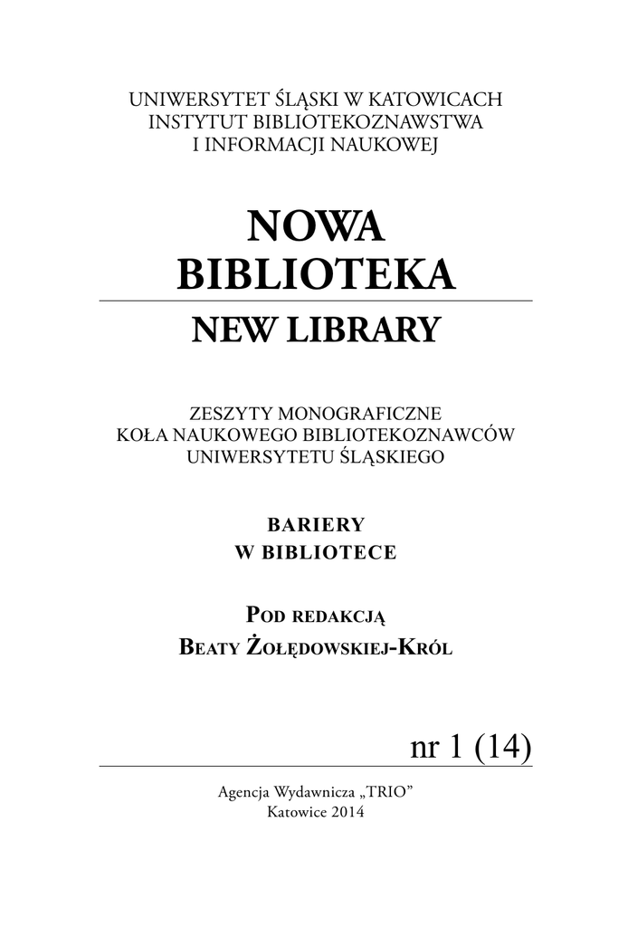 UNIWERSYTET ŚLĄSKI W KATOWICACH INSTYTUT BIBLIOTEKOZNAWSTWA I INFORMACJI NAUKOWEJ NOWA BIBLIOTEKA NEW LIBRARY ZESZYTY MONOGRAFICZNE KOŁA NAUKOWEGO BIBLIOTEKOZNAWCÓW UNIWERSYTETU ŚLĄSKIEGO BARIERY W BIBLIOTECE Pod redakcją Beaty Żołędowskiej-Król nr 1 (14) Agencja Wydawnicza „TRIO” Katowice 2014 RADA NAUKOWA prof. dr hab. Elżbieta Gondek prof. UŚ dr hab. Mariola Jarczykowa dr hab. Diana Pietruch-Reizes Dr. Philol. Baiba Holma (University of Latvia) REDAKCJA Agnieszka Bajor Izabela Swoboda Agnieszka Łakomy Małgorzata Caban REDAKCJA JĘZYKOWA Barbara Pytlos KOREKTA TEKSTÓW ANGIELSKICH Jacek Tomaszczyk OPRACOWANIE GRAFICZNE Anna Szczęśniak ADRES REDAKCJI Instytut Bibliotekoznawstwa i Informacji Naukowej Uniwersytet Śląski w Katowicach Pl. Sejmu Śląskiego 1 40-032 Katowice e-mail: [email protected] Publikacja ukazała się dzięki pomocy finansowej: Instytutu Bibliotekoznawstwa i Informacji Naukowej Uniwersytetu Śląskiego w Katowicach Uczelnianej Rady Samorządu Studenckiego Uniwersytetu Śląskiego w Katowicach ISSN 1505-4195 Publikacja recenzowana Zawartość odnotowana w indeksie cytowań CYTBIN Spis treści Nowa Biblioteka nr 1 (14), 2014 Artykuły i komunikaty Marzena Świgoń: Bariery i ograniczenia w dostępie do wiedzy i informacji – terminologia i klasyfikacja .......................................................7 Karolina Kustra: Library anxiety – czy użytkownicy Miejsko-Gminnej Biblioteki Publicznej im. Jana Kochanowskiego w Zwoleniu boją się biblioteki? .................................................................................................... 15 Marlena Gęborska: Bariery w procesie planowania – prakseologiczne podstawy zarządzania organizacją ..................................................... 33 Iwona Blicharska: Gromadzenie zbiorów w Bibliotece Uniwersytetu Śląskiego – perspektywy i problemy ..................................................................... 59 Zbigniew Gruszka: Problematyka działalności pozaprogramowej studentów na przykładzie bibliotekoznawczych kół naukowych w Polsce w świetle przeprowadzonych badań ............................................................. 69 Izabela Pyclik: Dostęp do bibliotek i zbiorów bibliotecznych osób niepełnosprawnych na Żywiecczyźnie. Komunikat z badań ........................ 95 Marek Deja: Podcasting i audiodeskrypcja jako forma promocji biblioteki w środowisku osób z niepełnosprawnością wzrokową ...............105 Magdalena Smyczek: Terapeutyczna rola książki w Lektorze Bernharda Schlinka.................................................................................................. 115 Agnieszka Modrok, Marta Romańska: Koncepcja zastosowania Systemu informacji publicznej dla osób z dysfunkcjami narządu wzroku i słuchu INFOMAT-E w Bibliotece Śląskiej w Katowicach. Komunikat ... 127 Maria Kycler: Program Biblioteca Abierta i Centrum Kultury Polskiej w Madrycie jako przykład działań biblioteki publicznej na rzecz społeczności wielokulturowej ..................................................................... 137 Agnieszka Bakalarz: Zagrożenia mikrobiologiczne zbiorów bibliotecznych ................................................................................................................. 165 Materiały Maria Kycler: Piśmiennictwo krajoznawcze i podróżnicze dotyczące Śląska za lata 1800-1922. Spis bibliograficzny. Część 3 ........................... 171 Joanna Kamińska: Bibliografia zawartości Studiów bibliologicznych za lata 1983-2011........................................................................................191 Sprawozdania Barbara Maria Morawiec: Biblioteka w przestrzeni edukacyjnej Bibliotekarz 2.0 – nowoczesność na bazie tradycji (Kraków, 23-24 maja 2013 r.) .................................................................................... 213 Ewa Olszowy: Rola biblioteki w zakresie parametryzacji uczelni XXVIII Forum Sekcji Bibliotek Szkół Wyższych przy Zarządzie Okręgu Stowarzyszenia Bibliotekarzy Polskich w Katowicach (Częstochowa, 18 września 2013 r.) ...................................................................................217 Ilona Czub, Dorota Sochocka: VII Ogólnopolska Konferencja StudenckoDoktorancka Kół Naukowych Bibliotekoznawców Czytelnik – Odbiorca – Użytkownik informacji w procesie kształtowania kultury czytelniczej i informacyjnej (Katowice, 5 grudnia 2013 r.) ............................................223 Barbara Kołodziej: Konferencja Bezpieczeństwo w Bibliotece I (Chorzów, 31 stycznia 2014 r.) ........................................................................... 227 Wydarzenia Kalendarium wydarzeń (oprac. Marta Kunicka)....................................... 232 Table of Contents New Library 2014, no. 1 (14) Articles and Communications Marzena Świgoń: Barriers and Limits in Access to Knowledge and Information – Terminology and Classification ............................................. 7 Karolina Kustra: Library Anxiety – Are the Users of the Municipal and Communal Public Jan Kochanowski Library in Zwoleń Afraid of the Library? ................................................................................................ 15 Marlena Gęborska: Barriers in the Planning Process – Praxeological Basics of Organization Management .......................................................... 33 Iwona Blicharska: Acquisitions in the Library of the University of Silesia – Prospects and Problems ............................................................... 59 Zbigniew Gruszka: Issues of Extra-curricular Activities of Students. A Case Study of Research Groups of Library Science in Poland ............... 69 Izabela Pyclik: Access of People with Disabilities to the Library and Library Collections in the Żywiec Area. Research Announcement ............. 95 Marek Deja: Podcasting and Audio Description As a Way of Promoting the Library Amo