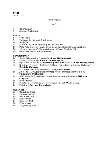 FILM 2011 SPIS TREŚCI nr 2 4 5 Kalendarium Andrzej Dudziński AKCJA 6 Film akcja 9 PoŜegnanie: Krzysztof Kolberger 10 Akcja TV 12 „Para do Ŝycia" o fascynacji Finów saunami 16 Piotr Polk o swojej nowej płycie opowiada Sebastianowi Łupakowi 18 „Czarny czwartek" film poświęcony ofiarom Grudnia '70 24 Ranking aktorów reklamowych COVER STORY 26 Sonia Bohosiewicz / wywiad Łukasz Maciejewski 34 Kobiety [niestety] / Bartosz Staszczyszyn 40 Pipi moŜe wszystko / z Dominiką Kluźniak rozm. Łukasz Maciejewski 46 Król Colin Pierwszy. O Colinie Firthcie, nagrodzonym Złotym Globem / ElŜbieta Ciapara 52 Od czego zaleŜni są niezaleŜni / Zbigniew Banaś 56 „Miś Yogi". O wyjątkowej promocji nowej animacji Warner Bros / Magdalena Michalska 60 CEL? CAŁUJ!. O burzliwej historii pocałunków w filmach / ElŜbieta Ciapara 66 Mity filmowe 68 Felieton psychologiczny / Katarzyna i Jacek Wasilewscy 70 Felieton / Bartosz śurawiecki RECENZJE 72 Kino, box office 86 Zapowiedzi TV 89 Serial kultowy 90 Nasze DVD 92 Recenzje DVD 96 Filmowisko 98 12 gniewnych ludz nr 3 4 5 Kalendarium Andrzej Dudziński AKCJA 6 Film akcja 9 Sundance 2011 10 Akcja TV 14 JeŜ Jerzy - wywiad z twórcami kultowego polskiego komiksu dla dorosłych 18 Olivier Assayas - rozmowa z reŜyserem filmu „Carlos" 20 Kazuo Ishiguro - sylwetka pisarza, autora m.in. „Nie opuszczaj mnie" COVER STORY 22 Method Acting - ElŜbieta Ciapara dogłębnie analizuje Metodę 30 Ring, czyli Ŝycie - Ranking najciekawszych filmów poświęconych boksowi 34 Jeszcze jej nie znacie, ale... / z Joanną Kulig rozm. Łukasz Maciejewski 40 Po prostu Gajos - o wybitnym polskim aktorze pisze Łukasz Maciejewski 44 Bez kobiet byłbym nikim / z Woodym Allenem rozm. Anna Serdiukow 52 Człowiek, który słyszy obrazy / z Jerzym Kapuścińskim, szefem Studia KADR, rozm. Łukasz Maciejewski 55 Nasz wróg wewnętrzny / z Janem Komasą, reŜyserem „Sali samobójców", rozm. Magda Sendecka 58 Cud oŜywienia obrazu - film „Młyn i krzyŜ" Lecha Majewskiego według Magdaleny Nowickiej 62 Rok Kieślowskiego - fragment ksiąŜki Stanisława Zawiślińskiego 64 Serial prawdę ci powie 66 Mity filmowe 68 Felieton psychologiczny / Katarzyna i Jacek Wasilewscy 70 Felieton / Bartosz śurawiecki RECENZJE 72 Kino, box office 86 Zapowiedzi TV 92 Recenzje DVD 96 Filmowisko 98 12 gniewnych ludzi nr 4 4 8 9 11 12 18 20 Kalendarium Film Akcja Andrzej Dudziński Akcja TV Berlinale 2011 - korespondencja Bartosza śurawieckiego Jameson Int. Dublin Film Festival / rozmowa z Kevinem Spacey Apel dokumentalistów COVER STORY 24 Banderas gra dla BZ WBK / z Antonio Banderasem rozm. Anita Zuchora o jego karierze i reklamie dla BZ WBK 30 Aktorzy w reklamach. O udziale gwiazd filmowych w reklamach / pisze ElŜbieta Ciapara 36 Catherine Deneuve - sylwetka wielkiej damy francuskiego kina 40 U Weira zagrałbym nawet lustro / z Edem Harrisem rozm. Joanna Orzechowska 42 Przynajmniej zakręć wodę! / z Martyną Wojciechowską o Jane Goodall i ekologii rozm. Sebastian Łupak 46 Kto tak pięknie puka? 0 drodze do kariery i swojej roli w „Erratum" / Tomasz Kot opowiada Sebastianowi Łupakowi 48 Dajmy wariata, niech se polata! Bartosz Staszczyszyn analizuje filmowy portret ludzi chorych psychicznie 52 Ta maszyna zabija faszystów / z Przemysławem Wojcieszkiem rozm. Łukasz Maciejewski 58 Chateau Marmont - o najsłynniejszym hollywoodzkim hotelu / pisze Anita Zuchora 64 Klan Coppolów - o klanach rodzinnych w Fabryce Snów / pisze ElŜbieta Ciapara 68 Mity filmowe 70 Felieton psychologiczny / Katarzyna i Jacek Wasilewscy 72 Felieton / Bartosz śurawiecki RECENZJE 74 Kino, bok office 86 Zapowiedzi TV 92 Recenzje DVD 96 Filmowisko 98 12 gniewnych ludzi nr 5 4 8 12 18 20 22 24 Kalendarium Film Akcja Akcja TV Jameson Empire Awards 2011. Londyńska gorączka 51. Krakowski Festiwal Filmowy 25. Tarnowska Nagroda Filmowa 8. Festiwal Muzyki Filmowej w Krakowie COVER STORY 26 Sposoby na blondynkę / Anita Zuchora i ElŜbieta Ciapara porównują kariery Kirsten Dunst i Reese Witherspoon 34 38 42 44 48 54 58 60 66 68 70 Klnij i szukaj guza / z Izą Kuną rozmawia Łukasz Maciejewski Fakt prasowy ≠ Fakt filmowy Monstrum, czyli kreator / z Kornelem Mundruczó rozm. Mariola Wiktor Jakiej muzyki słucha pan podczas uprawiania seksu... / z Jakubem Gierszałem rozm. Łukasz Maciejewski Jak sfilmować Balcerowicza? 8. Planete Doc Film Festival. Dokument nie zna granic Herzog w epoce kamienia w 3D - o sztuce naskalnej sprzed ponad 30 tyś. lat pisze paleontolog / Karol Szymczak Festiwal w Cannes - o kontrowersyjnych zwycięzcach z poprzednich lat pisze / ElŜbieta Ciapara Mity filmowe Felieton psychologiczny / Katarzyna i Jacek Wasilewscy Felieton / Bartosz śurawiecki RECENZJE 72 Kino, box office 86 Zapowiedzi TV 90 Nasze DVD 92 Recenzje DVD 96 Filmowisko 98 12 gniewnych ludzi nr 6 4 6 7 10 14 15 16 18 Kalendarium Film Akcja Andrzej Dudziński prezentuje Akcja TV Studio Filmowe Alvernia. Amerykańskie wampiry pod polską kopułą Polski Box Office. Polskie filmy ratują rynek kinowy Matt Groening: „Czuję się trochę jak Bóg" X-Men: Pierwsza Klasa. Wojna mutantów COVER STORY 20 O, w mordę! Ale śmieszne... Duga część „Kac Vegas" / rozwaŜania o komedii Anity Zuchory i Sebastiana Łupaka 28 34 36 40 42 46 52 56 60 62 68 70 72 74 Wszyscy jesteśmy zwierzętami / z Mają Ostaszewską rozm. Łukasz Maciejewski Kino się globalizuje / z Jerzym Skolimowskim rozm. Beata Postnikoff Byłem przecinkiem w słowie „pokój" / z Robertem Clińskim rozm. Anita Zuchora Boli mnie krzywda owadów / z Saoirse Ronan rozm. Magdalena Lankosz Bogowie (i boginie) są dziś dziećmi Anatomia skandalu Metafizyczne ciarki… / z Magdaleną Łazarkiewicz rozm. Jacek Rakowiecki Boom na Boona Niebo Kopernika Quo vadis, Hollywood? Billy Wilder Mity filmowe Felieton Psychologiczny / Katarzyna i Jacek Wasilewscy Felieton / Bartosz śurawiecki RECENZJE 76 Kino, bok office 86 Zapowiedzi TV 90 Nasze DVD 92 Recenzje DVD 96 F