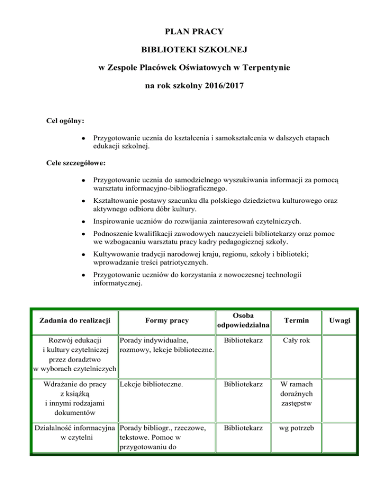 PLAN PRACY BIBLIOTEKI SZKOLNEJ w Zespole Placówek Oświatowych w Terpentynie na rok szkolny 2016/2017 Cel ogólny: Przygotowanie ucznia do kształcenia i samokształcenia w dalszych etapach edukacji szkolnej. Cele szczegółowe: Przygotowanie ucznia do samodzielnego wyszukiwania informacji za pomocą warsztatu informacyjno-bibliograficznego. Kształtowanie postawy szacunku dla polskiego dziedzictwa kulturowego oraz aktywnego odbioru dóbr kultury. Inspirowanie uczniów do rozwijania zainteresowań czytelniczych. Podnoszenie kwalifikacji zawodowych nauczycieli bibliotekarzy oraz pomoc we wzbogacaniu warsztatu pracy kadry pedagogicznej szkoły. Kultywowanie tradycji narodowej kraju, regionu, szkoły i biblioteki; wprowadzanie treści patriotycznych. Przygotowanie uczniów do korzystania z nowoczesnej technologii informatycznej. Zadania do realizacji Formy pracy Rozwój edukacji Porady indywidualne, i kultury czytelniczej rozmowy, lekcje biblioteczne. przez doradztwo w wyborach czytelniczych Wdrażanie do pracy z książką i innymi rodzajami dokumentów Lekcje biblioteczne. Działalność informacyjna Porady bibliogr., rzeczowe, w czytelni tekstowe. Pomoc w przygotowaniu do Osoba odpowiedzialna Termin Bibliotekarz Cały rok Bibliotekarz W ramach doraźnych zastępstw Bibliotekarz wg potrzeb Uwagi konkursów, w odrabianiu lekcji. Sukcesywne wzbogacanie Zakupy książek, inne formy księgozbioru pod kątem gromadzenia księgozbioru. rozbudowy warsztatu informacyjnobibliograficznego Bibliotekarz w miarę możliwości Tworzenie opisów Katalogi: alfabetyczny bibliograficznych książek i rzeczowy. Bibliotekarz Stale Bibliotekarz we współpracy z innymi nauczycielami X/ 2016 Propagowanie książek i czytelnictwa. „Międzynarodowy Miesiąc Bibliotek Szkolnych”. Narodowe Czytanie Sienkiewicza – „Quo Vadis”. „Święto pluszowego misia”. ”Andrzejki i Katarzynki na wesoło”, „Mikołajki z Mikołajkiem”. „ Kącik czytelniczy”, wystawki książek, „Święto Patrona Szkoły”gazetka. Przyjęcie w poczet czytelników uczniów klas pierwszych. Konkursy czytelnicze: „Tworzymy szkolną encyklopedię bohaterów książkowych”. „Zakładka do książki.„Korowód bajkowych postaci”. „Moje życzenia dla biblioteki”. Głośne czytanie dzieciom – „Czytam, bo lubię”: Dni książek detektywistycznych i przygodowych. Dni baśni i książek fantasy. Dni książek przyrodniczych. Dni książek popularnonaukowych. XI/2016 XII/ 2016 Cały rok XI/2016 I-II/2017 Cały rok Dni poezji. Łamańce językowe-poprawne odczytywanie trudnych tekstów. Akcja czytelnicza: „Nie osądzaj książki po okładce”. Akcja czytelnicza- „Duży czyta małemu”. Konkurs dla klas IV-VI – ”Biblioteki szkolne rządzą”na plakat promujący bibliotekę szkolną. „Biblioliada” – konkurs międzyklasowy: IV-VI. Konkurs literacki dla ucz. gimnazjum – „Pasja czytania, pasja pisania”. Wzbogacanie księgozbioru o nowe lektury, zgodnie z nową podstawą programową, księgozbioru podręcznego, popularnonaukowego. Zakup książek z projektu :„Narodowy Program Rozwoju Czytelnictwa”. Plebiscyt na najciekawsze nowości wydawnicze. Bibliotekarz Udostępnianie Wystawy, oglądanie filmów Bibliotekarz, pomieszczenia czytelni na edukacyjnych, inni nauczyciele różne formy prezentacji profilaktycznych, prezentacje multimedialne uczniów. Współpraca z Gminną Biblioteką Publiczną Współpraca z wychowawcami klas oraz polonistami w poznawaniu uczniów i ich preferencji czytelniczych oraz stanie czytelnictwa wg potrzeb wg potrzeb Cały rok Imprezy czytelnicze, konkursy, wymiana informacji na temat zainteresowań czytelniczych uczniów. Konsultacje dot. zakupu nowości wydawniczych. Bibliotekarz, pracownicy biblioteki wg potrzeb Rozmowy nt. przeczytanych książek, porady indywidualne, analiza statystyki czytelnictwa, uzgadnianie wykazu lektur. Pomoc w opiece nad ucz. w czasie wyjazdów Bibliotekarz Stale Cały rok edukacyjnych. Kształcenie umiejętności Zajęcia biblioteczne. wyszukiwania informacji Indywidualne zajęcia z na dany temat uczniami . (z uwzględnieniem potrzeb i zainteresowań uczniów) bibliotekarz cały rok Udostępnianie uczniom miejsca w czytelni i kąciku czytelniczym na odrabianie lekcji (pomoc w ich odrabianiu) Bibliotekarz wg potrzeb Bibliotekarz wg oferty Bibliotekarz wg potrzeb Inspirowanie do Gazetki i wystawy podejmowania obchodów tematyczne książek. rocznic historycznych, dnia patrona szkoły, świąt państwowych i wydarzeń kulturalnych Bibliotekarz wg harmonogramu (kalendarium rocznic) Sukcesywne wzbogacanie Zakup książek, filmów. działu literatury regionalnej, ekologicznej oraz księgozbioru podręcznego Bibliotekarz Stale Wprowadzanie nowych Lekcje biblioteczne. metod aktywizujących w zakresie prowadzonych zajęć bibliotecznych Bibliotekarz W czasie doraźnych zastępstw Organizowanie wystaw Wystawy i gazetki dotyczących tradycji okolicznościowe, prezentacja rodzinnych związanych książek, imprezy b-teczne. z polską obyczajowością religijną (Boże Narodzenie) imprez okolicznościowych Bibliotekarz Czytelnia, kącik czytelniczy, porady bezpośrednie. Zajęcia plastyczne, quizy literackie. Słuchanie muzyki relaksacyjnej. Udział w różnych formach Konferencje, wymiana doskonalenia: doświadczeń, warsztaty, konferencjach kursy. metodycznych, kursach warsztatach Wzbogacanie warsztatu Plansze dydakt., materiały pracy przez tworzenie graficzne. pomocy dydaktycznych wg harmonogramu w czasie zastępstw (Andrzejki, Mikołajki, Dzień Nauczyciela, rocznice poświęcone sławnym ludziompisarzom, poetom itp.) Gromadzenie materiałów Wycinki z prasy, książki, nt. Dzierzkowic i regionu. prasa lokalna. Wystawki. Inspirowanie zainteresowania uczniów historią, kulturą i zabytkami Dzierzkowic. Bibliotekarz Stale Cały rok Włączenie się w realizację Szkolnego Programu Profilaktyki. Realizacja Programu pt. „III Elementarz” w klasach d