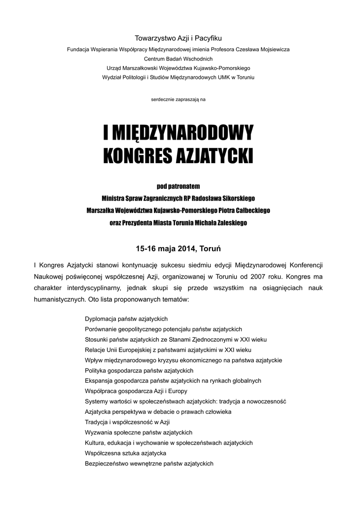 Towarzystwo Azji i Pacyfiku Fundacja Wspierania Współpracy Międzynarodowej imienia Profesora Czesława Mojsiewicza Centrum Badań Wschodnich Urząd Marszałkowski Województwa Kujawsko-Pomorskiego Wydział Politologii i Studiów Międzynarodowych UMK w Toruniu serdecznie zapraszają na I MIĘDZYNARODOWY KONGRES AZJATYCKI pod patronatem Ministra Spraw Zagranicznych RP Radosława Sikorskiego Marszałka Województwa Kujawsko-Pomorskiego Piotra Całbeckiego oraz Prezydenta Miasta Torunia Michała Zaleskiego 15-16 maja 2014, Toruń I Kongres Azjatycki stanowi kontynuację sukcesu siedmiu edycji Międzynarodowej Konferencji Naukowej poświęconej współczesnej Azji, organizowanej w Toruniu od 2007 roku. Kongres ma charakter interdyscyplinarny, jednak skupi się przede wszystkim na osiągnięciach nauk humanistycznych. Oto lista proponowanych tematów: Dyplomacja państw azjatyckich Porównanie geopolitycznego potencjału państw azjatyckich Stosunki państw azjatyckich ze Stanami Zjednoczonymi w XXI wieku Relacje Unii Europejskiej z państwami azjatyckimi w XXI wieku Wpływ międzynarodowego kryzysu ekonomicznego na państwa azjatyckie Polityka gospodarcza państw azjatyckich Ekspansja gospodarcza państw azjatyckich na rynkach globalnych Współpraca gospodarcza Azji i Europy Systemy wartości w społeczeństwach azjatyckich: tradycja a nowoczesność Azjatycka perspektywa w debacie o prawach człowieka Tradycja i współczesność w Azji Wyzwania społeczne państw azjatyckich Kultura, edukacja i wychowanie w społeczeństwach azjatyckich Współczesna sztuka azjatycka Bezpieczeństwo wewnętrzne państw azjatyckich Mocarstwowość państw azjatyckich Administracja i samorząd terytorialny państw azjatyckich Azjatyckie systemy medialne i komunikacja Przewidziane są również panele anglojęzyczne poświęcone polityce, gospodarce, społeczeństwom i kulturom azjatyckim. Ponadto I Międzynarodowy Kongres Azjatycki stanowi propozycję dla przedsiębiorców, których organizatorzy serdecznie zapraszają do udziału w dyskusji, wymiany doświadczeń biznesowych i nawiązywania nowych kontaktów. Rezultatem I Międzynarodowego Kongresu Azjatyckiego ma być nie tylko pogłębiona analiza zagadnień politycznych, gospodarczych, społecznych i kulturalnych, lecz również publikacja kolekcji recenzowanych zbiorowych prac naukowych w języku polskim i angielskim. Opłata akredytacyjna wynosi 480,- złotych (z jednym noclegiem) lub 420,- złotych (bez noclegu) Wpłaty należy dokonać do 13 kwietnia 2014 roku na konto: Towarzystwo Azji i Pacyfiku ul. Lubicka 44, 87-100 Toruń Kredyt Bank oddział w Toruniu 16 1500 1751 1217 5003 8726 0000 z dopiskiem: KONGRES AZJATYCKI oraz imię i nazwisko uczestnika konferencji. Na wpłaty dokonane przelewem na konto Towarzystwa (z pominięciem osób fizycznych) wystawiamy, po otrzymaniu wpłaty, fakturę VAT i wysyłamy ją do wpłacającego. Fakturę VAT dla osoby fizycznej wystawia się tylko na jej żądanie. Formularz zgłoszeniowy jest dostępny wyłącznie on-line: http://www.kongresazja.pl/rejestracja.html Komitet Organizacyjny: dr hab. Joanna Marszałek-Kawa, kierownik naukowy Konferencji dr Robert Gawłowski, sekretarz Konferencji mgr Ewa Kaja-Pilas, sekretarz Konferencji mgr Joanna Piechowak-Lamparska, sekretarz Konferencji mgr Karolina Skonieczka, sekretarz Konferencji mgr Patryk Wawrzyński, sekretarz Konferencji