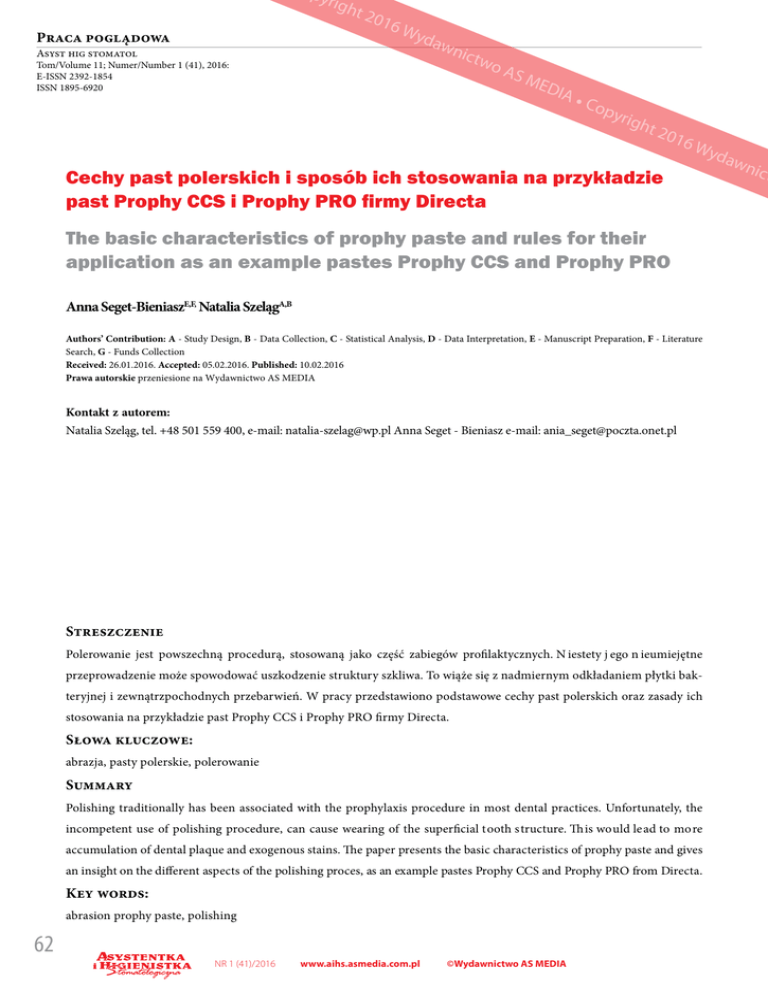 pyr ig ht 2 0 Praca poglądowa Asyst hig stomatol 16 W yda w nict Tom/Volume 11; Numer/Number 1 (41), 2016: E-ISSN 2392-1854 ISSN 1895-6920 wo A SM EDI A• Cop y righ t 20 Cechy past polerskich i sposób ich stosowania na przykładzie past Prophy CCS i Prophy PRO firmy Directa 16 W yda w The basic characteristics of prophy paste and rules for their application as an example pastes Prophy CCS and Prophy PRO Anna Seget-BieniaszE,F, Natalia SzelągA,B Authors’ Contribution: A - Study Design, B - Data Collection, C - Statistical Analysis, D - Data Interpretation, E - Manuscript Preparation, F - Literature Search, G - Funds Collection Received: 26.01.2016. Accepted: 05.02.2016. Published: 10.02.2016 Prawa autorskie przeniesione na Wydawnictwo AS MEDIA Kontakt z autorem: Natalia Szeląg, tel. +48 501 559 400, e-mail: [email protected] Anna Seget - Bieniasz e-mail: [email protected] Streszczenie Polerowanie jest powszechną procedurą, stosowaną jako część zabiegów profilaktycznych. N iestety j ego n ieumiejętne przeprowadzenie może spowodować uszkodzenie struktury szkliwa. To wiąże się z nadmiernym odkładaniem płytki bakteryjnej i zewnątrzpochodnych przebarwień. W pracy przedstawiono podstawowe cechy past polerskich oraz zasady ich stosowania na przykładzie past Prophy CCS i Prophy PRO firmy Directa. Słowa kluczowe: abrazja, pasty polerskie, polerowanie Summary Polishing traditionally has been associated with the prophylaxis procedure in most dental practices. Unfortunately, the incompetent use of polishing procedure, can cause wearing of the superficial tooth structure. This would le ad to more accumulation of dental plaque and exogenous stains. The paper presents the basic characteristics of prophy paste and gives an insight on the different aspects of the polishing proces, as an example pastes Prophy CCS and Prophy PRO from Directa. Key words: abrasion prophy paste, polishing 62 NR 1 (41)/2016 www.aihs.asmedia.com.pl ©Wydawnictwo AS MEDIA nict tw Seget-Bieniasz A., Szeląg N. – Cechy past polerskich... Wprowadzenie rodzaj i ilość zastosowanej pasty oraz czas kontaktu pasty z powierzchnią Pierwsze profesjonalne pasty do oczyszczania zębów pojawiły się około [7,8,9]. 50 lat temu wraz z powstaniem nowej profesji higienistki stomatologicz- Im większa prędkość obrotów oraz siła nacisku, tym większy poziom nej. Wcześniej do usuwania przebarwień i osadów nazębnych lekarze abrazji i wytworzonego ciepła, które może skutkować powstaniem nad- stomatolodzy używali mieszaniny pumeksu z wodą, a do końcowego wrażliwości zębów, a nawet uszkodzeniem miazgi. Zwiększając prędkość polerowania wodnej zawiesiny kredy. Wraz z rosnącym poziomem obrotów, należy zmniejszyć siłę nacisku i odwrotnie. Pracujemy zgod- wiedzy na temat struktury szkliwa, retencji bakterii oraz mechanizmu nie z zasadą, że liczba obrotów i siła nacisku powinna być nie większa, ścierania, na rynku zaczęły pojawiać się produkty dedykowane do pro- niż wystarczająca do oczyszczenia zębów. Pozwoli to zminimalizować fesjonalnej profilaktyki stomatologicznej. Bezpieczne dla szkliwa i przy- abrazję szkliwa i uchronić przed termicznym uszkodzeniem miazgi [5]. jemne w smaku dla pacjenta. Ale rozwój stomatologii ciągle stawia przed Dłuższy kontakt narzędzia czyszczącego (gumowego kielicha, szczotki) higienistkami nowe wyzwania. Higienizacja jamy ustnej nie sprowadza wpływa na poziom startego substratu [10]. Dlatego polerowanie powin- się już tylko do oczyszczania powierzchni zębów. Poza wypełnieniami no być wykonywane krótkimi, przerywanymi ruchami, gdyż redukuje kompozytowymi czy amalgamatowymi, higienistka musi też poradzić to abrazję powierzchni i produkcję ciepła. Większość powierzchni może sobie z licówkami czy implantami wraz z osadzonymi na nich pracami być wypolerowana w czasie 2-5s [3]. Należy przy tym używać niewielką protetycznymi. Co stosować u pacjentów zgłaszających nadwrażliwość, ilość pasty (im większa jej ilość tym większa abrazyjność). dzieci w okresie wyrzynania zębów stałych? Jak postępować z odsłonię- Kluczowe znaczenie ma także technika nakładania pasty. Zaleca się czę- tym cementem korzeniowym czy ubytkami abfrakcyjnymi? W pracy ste nakładanie nowej porcji pasty i zapobieganie jej wysychaniu. Środki przedstawiono podstawowe cechy past polerskich oraz zasady ich stoso- ścierne pozbawione spoiwa i wody działają bardziej agresywnie i mogą wania na przykładadzie past Prophy CCS i Prophy PRO firmy Directa. powodować zarysowania. [5,11]. Absolutnie nie powinno się stosować samych środków polerujących w postaci proszku. Cechują się one naj- Polerowanie to integralna część wszystkich procedur stomatologicznych wyższą abrazyjnością i produkują nadmierną ilość ciepła [5]. i nieodłączna część pracy higienistki [1,2]. Ma na celu uzyskanie gład- Najważniejszą cechą past polerskich (a właściwie zawartych w nich kiej, lśniącej powierzchni zębów, po wcześniejszym skalingu, kiretażu środków abrazyjnych), którą trzeba brać pod uwagę są ich właściwo- lub oczyszczaniu zębów gruboziarnistą pastą [3]. Istnieje kilka powo- ści ścierne. Pasty do profesjonalnego oczyszczania zębów mają różną dów, dla których polerowania nie wolno pominąć. Przede wszystkim ścieralność, oznaczoną liczbą RDA. RDA (Relative Dentin Abrasivity) gładką powierzchnię zębów i wypełnień redukuje odkładanie się płytki to współczynnik ścieralności pasty do zębiny. Wyższy wskaźnik ozna- nazębnej i tworzenia zewnątrzpochodnych przebarwień. O powodze- cza większą ścierność pasty. Wśród składników ściernych najwyższy niu i skuteczności profilaktycznych zabiegów profesjonalnych decydu- wskaźnik RDA wykazuje tlenek glinu (145 RDA) W zależności od skła- je przecież głównie to, czy nierówności i zarysowania stworzone przez du, pasta może by