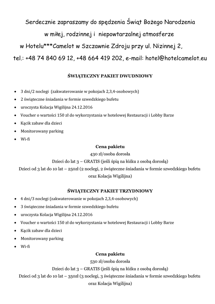 Serdecznie zapraszamy do spędzenia Świąt Bożego Narodzenia w miłej, rodzinnej i niepowtarzalnej atmosferze w Hotelu***Camelot w Szczawnie Zdroju przy ul. Nizinnej 2, tel.: +48 74 840 69 12, +48 664 419 202, e-mail: [email protected] ŚWIĄTECZNY PAKIET DWUDNIOWY 3 dni/2 noclegi (zakwaterowanie w pokojach 2,3,4-osobowych) 2 świąteczne śniadania w formie szwedzkiego bufetu uroczysta Kolacja Wigilijna 24.12.2016 Voucher o wartości 150 zł do wykorzystania w hotelowej Restauracji i Lobby Barze Kącik zabaw dla dzieci Monitorowany parking Wi-fi Cena pakietu 430 zł/osoba dorosła Dzieci do lat 3 – GRATIS (jeśli śpią na łóżku z osobą dorosłą) Dzieci od 3 lat do 10 lat – 250zł (2 noclegi, 2 świąteczne śniadania w formie szwedzkiego bufetu oraz Kolacja Wigilijna) ŚWIĄTECZNY PAKIET TRZYDNIOWY 4 dni/3 noclegi (zakwaterowanie w pokojach 2,3,4-osobowych) 3 świąteczne śniadania w formie szwedzkiego bufetu uroczysta Kolacja Wigilijna 24.12.2016 Voucher o wartości 150 zł do wykorzystania w hotelowej Restauracji i Lobby Barze Kącik zabaw dla dzieci Monitorowany parking Wi-fi Cena pakietu 530 zł/osoba dorosła Dzieci do lat 3 – GRATIS (jeśli śpią na łóżku z osobą dorosłą) Dzieci od 3 lat do 10 lat – 350zł (3 noclegi, 3 świąteczne śniadania w formie szwedzkiego bufetu oraz Kolacja Wigilijna) Warunkiem rezerwacji jest dokonanie wpłaty - 30% wartości zamówienia. ATRAKCJE TURYSTYCZNE W POBLIŻU: - Centrum Aktywnego Wypoczynku „Aqua Zdrój” - Zamek Książ - Stara Kopalnia - Jaskinia Solno – jodowa Galos - Kompleks Sztolni Podziemnych Włodarz - Muzeum Sztolni Walimskich - Pijalnia Wód Mineralnych - Podziemne miasto Głuszyca – Kompleks Osówka - Zamek Grodno - Tama w Zagórzu na Jeziorze Bystrzyckim - Wyciąg narciarski „Dzikowiec” w Boguszowie-Gorcach