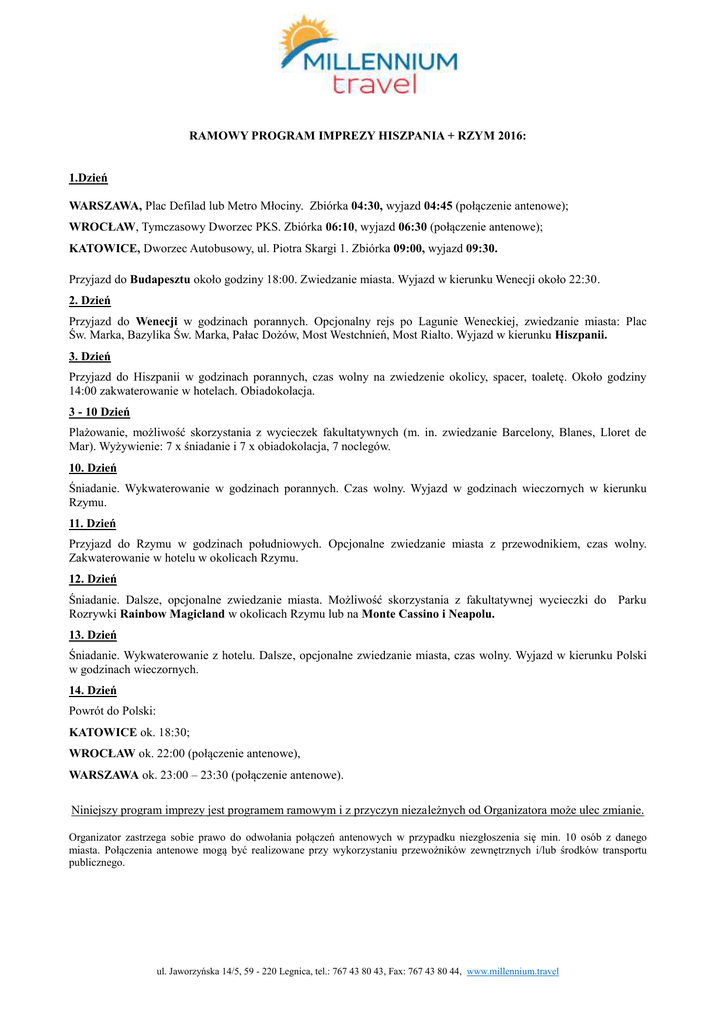 RAMOWY PROGRAM IMPREZY HISZPANIA + RZYM 2016: 1.Dzień WARSZAWA, Plac Defilad lub Metro Młociny. Zbiórka 04:30, wyjazd 04:45 (połączenie antenowe); WROCŁAW, Tymczasowy Dworzec PKS. Zbiórka 06:10, wyjazd 06:30 (połączenie antenowe); KATOWICE, Dworzec Autobusowy, ul. Piotra Skargi 1. Zbiórka 09:00, wyjazd 09:30. Przyjazd do Budapesztu około godziny 18:00. Zwiedzanie miasta. Wyjazd w kierunku Wenecji około 22:30. 2. Dzień Przyjazd do Wenecji w godzinach porannych. Opcjonalny rejs po Lagunie Weneckiej, zwiedzanie miasta: Plac Św. Marka, Bazylika Św. Marka, Pałac Dożów, Most Westchnień, Most Rialto. Wyjazd w kierunku Hiszpanii. 3. Dzień Przyjazd do Hiszpanii w godzinach porannych, czas wolny na zwiedzenie okolicy, spacer, toaletę. Około godziny 14:00 zakwaterowanie w hotelach. Obiadokolacja. 3 - 10 Dzień Plażowanie, możliwość skorzystania z wycieczek fakultatywnych (m. in. zwiedzanie Barcelony, Blanes, Lloret de Mar). Wyżywienie: 7 x śniadanie i 7 x obiadokolacja, 7 noclegów. 10. Dzień Śniadanie. Wykwaterowanie w godzinach porannych. Czas wolny. Wyjazd w godzinach wieczornych w kierunku Rzymu. 11. Dzień Przyjazd do Rzymu w godzinach południowych. Opcjonalne zwiedzanie miasta z przewodnikiem, czas wolny. Zakwaterowanie w hotelu w okolicach Rzymu. 12. Dzień Śniadanie. Dalsze, opcjonalne zwiedzanie miasta. Możliwość skorzystania z fakultatywnej wycieczki do Parku Rozrywki Rainbow Magicland w okolicach Rzymu lub na Monte Cassino i Neapolu. 13. Dzień Śniadanie. Wykwaterowanie z hotelu. Dalsze, opcjonalne zwiedzanie miasta, czas wolny. Wyjazd w kierunku Polski w godzinach wieczornych. 14. Dzień Powrót do Polski: KATOWICE ok. 18:30; WROCŁAW ok. 22:00 (połączenie antenowe), WARSZAWA ok. 23:00 – 23:30 (połączenie antenowe). Niniejszy program imprezy jest programem ramowym i z przyczyn niezależnych od Organizatora może ulec zmianie. Organizator zastrzega sobie prawo do odwołania połączeń antenowych w przypadku niezgłoszenia się min. 10 osób z danego miasta. Połączenia antenowe mogą być realizowane przy wykorzystaniu przewoźników zewnętrznych i/lub środków transportu publicznego. ul. Jaworzyńska 14/5, 59 - 220 Legnica, tel.: 767 43 80 43, Fax: 767 43 80 44, www.millennium.travel