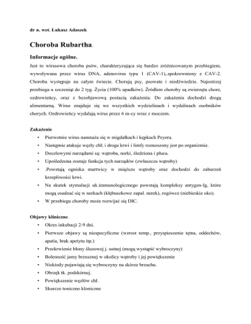 dr n. wet. Łukasz Adaszek Choroba Rubartha. Informacje ogólne. Jest to wirusowa choroba psów, charakteryzująca się bardzo zróŜnicowanym przebiegiem, wywoływana przez wirus DNA, adenovirus typu 1 (CAV-1),.spokrewniony z CAV-2. Choroba występuje na całym świecie. Chorują psy, psowate i niedźwiedzie. Najostrzej przebiega u szczeniąt do 2 tyg. śycia (100% upadków). Źródłem choroby są zwierzęta chore, ozdrowieńcy, oraz z bezobjawową postacią zakaŜenia. Do zakaŜenia dochodzi drogą alimentarną. Wirus znajduje się we wszystkich wydzielinach i wydalinach osobników chorych. Ozdrowieńcy wydalają wirus przez 6 m-cy wraz z moczem. ZakaŜenie • Pierwotnie wirus namnaŜa się w migdałkach i kępkach Peyera. • Następnie atakuje węzły chł; i droga krwi i limfy roznoszony jest po organizmie. • Docelowymi narządami są: wątroba, nerki, śledziona i płuca. • Upośledzona zostaje funkcja tych narządów (zwłaszcza wątroby) • .Powstają ogniska martwicy w miąŜszu wątroby oraz dochodzi do zaburzeń krzepliwości krwi. • Na skutek stymulacji uk.immunologicznego powstają kompleksy antygen-Ig, które mogą osadzać się w nerkach (kłębuszkowe zapal. nerek), rogówce (niebieskie oko). • W przebiegu choroby moŜe rozwijać się DIC. Objawy kliniczne. • Okres inkubacji 2-9 dni. • Pierwsze objawy są niespecyficzne (wzrost temp., przyspieszenie tętna, oddechów, apatia, brak apetytu itp.) • Przekrwienie błony śluzowej j. ustnej (mogą wystąpić wybroczyny) • Bolesność jamy brzusznej w okolicy wątroby i jej powiększenie • Niekiedy pojawiają się wybroczyny na skórze brzucha. • Obrzęk tk. podskórnej. • Powiększenie węzłów chł. • Skurcze toniczno kloniczne • Samoistne powstawanie krwiaków i wybroczyn. • Po 1- 3 tyg. po przechorowaniu u 5-10% psów rozwija się zmętnienie rogówki, samoistnie ustępujące. Rozpoznawanie. • Sytuacja epizootyczna. • Badanie kliniczne. • Izolacje wirusa z krwi, moczu i hodowla na komórkach lub identyfikacja metodą PCR. • Pośmiertnie moŜna wykazać ciałka wtrętowe metodą IF w skrawkach wątroby i nerek • Testy serologiczne ELISA i immunodyfuzji. Postępowanie. • Transfuzja krwi • DoŜylne podawanie płynów wieloelektrolitowych • Kontrolowanie poziomu glukozy i w razie potrzeby wyrównywanie go. • ObniŜanie poziomu amoniaku we krwi (dieta ubogobiałkowa, podawanie wit. C, wlewy doodbytnicze) • Antybiotykoterapia Zapobieganie • W pierwszym roku Ŝycia zaleca się co najmniej 2 immunizacje w wieku 8-10 tyg., a następnie 11-13 tygodni. • Następnie psa naleŜy poddawać szczepieniu co roku.