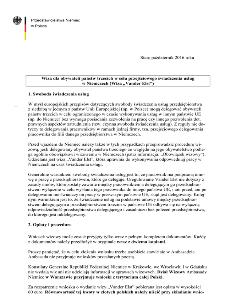 Przedstawicielstwa Niemiec w Polsce Stan: październik 2016 roku Wiza dla obywateli państw trzecich w celu przejściowego świadczenia usług w Niemczech (Wiza „Vander Elst”) 1. Swoboda świadczenia usług W myśl europejskich przepisów dotyczących swobody świadczenia usług przedsiębiorstwa z siedzibą w jednym z państw Unii Europejskiej (np. w Polsce) mogą delegować obywateli państw trzecich w celu ograniczonego w czasie wykonywania usług w innym państwie UE (np. do Niemiec) bez wymogu posiadania zezwolenia na pracę czy innego pozwolenia dot. prawnych aspektów zatrudnienia (tzw. czynna swoboda świadczenia usług). Z reguły nie dotyczy to delegowania pracowników w ramach jednej firmy, tzn. przejściowego delegowania pracownika do filii danego przedsiębiorstwa w Niemczech. Przed wjazdem do Niemiec należy także w tych przypadkach przeprowadzić procedurę wizową, jeśli delegowany obywatel państwa trzeciego ze względu na jego obywatelstwo podlega ogólnie obowiązkowi wizowemu w Niemczech (patrz informacja: „Obowiązek wizowy”). Udzielana jest wiza „Vander Elst”, która uprawnia do wykonywania odpowiedniej pracy w Niemczech na czas świadczenia usługi. Generalnie warunkiem swobody świadczenia usług jest to, że pracownik ma podpisaną umowę o pracę z przedsiębiorstwem, które go deleguje. Uregulowanie Vander Elst nie dotyczy z zasady umów, które zostały zawarte między pracownikiem a delegującym go przedsiębiorstwem wyłącznie w celu wysłania tego pracownika do innego państwa UE, i ani przed, ani po delegowaniu nie świadczy on pracy w pierwszym państwie UE, skąd jest delegowany. Kolejnym warunkiem jest to, że świadczenie usług na podstawie umowy między przedsiębiorstwem delegującym a przedsiębiorstwem trzecim w państwie UE odbywa się na wyłączną odpowiedzialność przedsiębiorstwa delegującego i zasadniczo bez poleceń przedsiębiorstwa, do którego jest oddelegowany. 2. Opłaty i procedura Wniosek wizowy może zostać przyjęty tylko wraz z pełnym kompletem dokumentów. Każdy z dokumentów należy przedłożyć w oryginale wraz z dwiema kopiami. Proszę pamiętać, że w celu złożenia wniosku trzeba osobiście stawić się w Ambasadzie. Ambasada nie przyjmuje wniosków przesłanych pocztą. Konsulaty Generalne Republiki Federalnej Niemiec w Krakowie, we Wrocławiu i w Gdańsku nie wydają wiz ani nie udzielają informacji w sprawach wizowych. Dział Wizowy Ambasady Niemiec w Warszawie przyjmuje wnioski z terytorium całej Polski. Za rozpatrzenie wniosku o wydanie wizy „Vander Elst” pobierana jest opłata w wysokości 60 euro. Równowartość tej kwoty w złotych polskich należy uiścić przy składaniu wnio- 2 sku. Jest to opłata manipulacyjna. W przypadku odmowy udzielenia wizy lub wycofania wniosku o wizę nie przysługuje jej zwrot. 3. Wymagane dokumenty dwa dokładnie wypełnione i własnoręcznie podpisane wnioski w języku niemieckim (formularze można pobrać tutaj) 2 aktualne fotografie biometryczne (zdjęcia wzorcowe) paszport wydany w ciągu ostatnich dziesięciu lat, ważny co najmniej sześć miesięcy po upływie ważności pozwolenia na pobyt stosowny dokument potwierdzający posiadanie zezwolenia na pobyt i pracę w Polsce o terminie ważności wystarczającym, aby po zakończeniu świadczenia usług powrócić z Niemiec do Polski umowa między firmą świadczącą usługę a przedsiębiorstwem trzecim w państwie UE zaświadczenie firmy świadczącej daną usługę (osobne dla każdego wnioskodawcy w przypadku składania wniosku grupowo) zawierające informacje dot.: - zgodnego z przepisami zatrudnienia wnioskodawcy (umowa o pracę wzgl. rozliczenia wynagrodzenia, dowód ubezpieczenia społecznego); przewidywanego czasu rozpoczęcia i zakończenia realizacji usługi w Niemczech; miejsca realizacji usługi w Niemczech; krótki opis świadczonej usługi. dowód ubezpieczenia na wypadek choroby w Polsce i w Niemczech na czas oddelegowania (dokument A1 + karta EKUZ). Ambasada zastrzega sobie prawo do zażądania dodatkowych dokumentów.