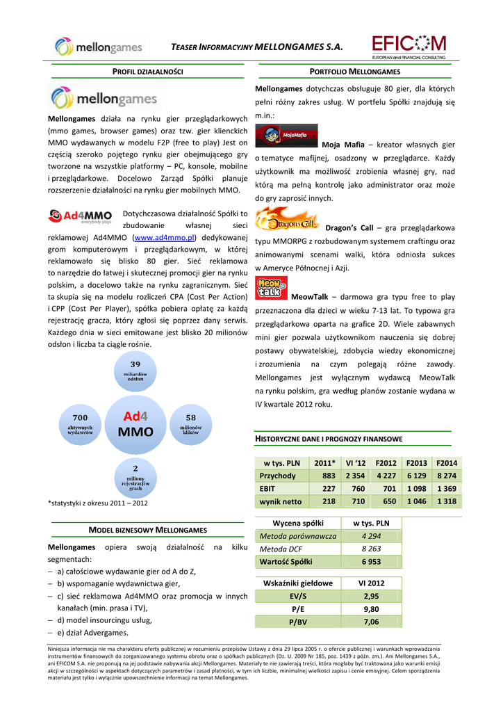 TEASER INFORMACYJNY ME LLONG A MES S. A. PROFIL DZIAŁALNOŚCI PORTFOLIO MELLONGAMES Mellongames dotychczas obsługuje 80 gier, dla których pełni różny zakres usług. W portfelu Spółki znajdują się Mellongames działa na rynku gier przeglądarkowych (mmo games, browser games) oraz tzw. gier klienckich MMO wydawanych w modelu F2P (free to play) Jest on częścią szeroko pojętego rynku gier obejmującego gry tworzone na wszystkie platformy – PC, konsole, mobilne i przeglądarkowe. Docelowo Zarząd Spółki planuje rozszerzenie działalności na rynku gier mobilnych MMO. m.in.: Moja Mafia – kreator własnych gier o tematyce mafijnej, osadzony w przeglądarce. Każdy użytkownik ma możliwość zrobienia własnej gry, nad którą ma pełną kontrolę jako administrator oraz może do gry zaprosić innych. Dotychczasowa działalność Spółki to zbudowanie własnej sieci reklamowej Ad4MMO (www.ad4mmo.pl) dedykowanej grom komputerowym i przeglądarkowym, w której reklamowało się blisko 80 gier. Sieć reklamowa to narzędzie do łatwej i skutecznej promocji gier na rynku polskim, a docelowo także na rynku zagranicznym. Sieć ta skupia się na modelu rozliczeń CPA (Cost Per Action) i CPP (Cost Per Player), spółka pobiera opłatę za każdą rejestrację gracza, który zgłosi się poprzez dany serwis. Każdego dnia w sieci emitowane jest blisko 20 milionów odsłon i liczba ta ciągle rośnie. Dragon’s Call – gra przeglądarkowa typu MMORPG z rozbudowanym systemem craftingu oraz animowanymi scenami walki, która odniosła sukces w Ameryce Północnej i Azji. MeowTalk – darmowa gra typu free to play przeznaczona dla dzieci w wieku 7-13 lat. To typowa gra przeglądarkowa oparta na grafice 2D. Wiele zabawnych mini gier pozwala użytkownikom nauczenia się dobrej postawy obywatelskiej, zdobycia wiedzy ekonomicznej i zrozumienia na czym polegają Mellongames jest wyłącznym różne wydawcą zawody. MeowTalk na rynku polskim, gra według planów zostanie wydana w IV kwartale 2012 roku. HISTORYCZNE DANE I PROGNOZY FINANSOWE w tys. PLN *statystyki z okresu 2011 – 2012 MODEL BIZNESOWY MELLONGAMES Mellongames opiera swoją działalność na kilku segmentach: − a) całościowe wydawanie gier od A do Z, − b) wspomaganie wydawnictwa gier, − c) sieć reklamowa Ad4MMO oraz promocja w innych kanałach (min. prasa i TV), − d) model insourcingu usług, − e) dział Advergames. 2011* VI ‘12 F2012 F2013 F2014 Przychody 883 2 354 4 227 6 129 8 274 EBIT 227 760 701 1 098 1 369 wynik netto 218 710 650 1 046 1 318 Wycena spółki w tys. PLN Metoda porównawcza 4 294 Metoda DCF 8 263 Wartość Spółki 6 953 Wskaźniki giełdowe VI 2012 EV/S 2,95 P/E 9,80 P/BV 7,06 Niniejsza informacja nie ma charakteru oferty publicznej w rozumieniu przepisów Ustawy z dnia 29 lipca 2005 r. o ofercie publicznej i warunkach wprowadzania instrumentów finansowych do zorganizowanego systemu obrotu oraz o spółkach publicznych (Dz. U. 2009 Nr 185, poz. 1439 z późn. zm.). Ani Mellongames S.A., ani EFICOM S.A. nie proponują na jej podstawie nabywania akcji Mellongames. Materiały te nie zawierają treści, która mogłaby być traktowana jako warunki emisji akcji w szczególności w aspektach dotyczących parametrów i zasad płatności, w tym ich liczbie, minimalnej wielkości zapisu i cenie emisyjnej. Celem sporządzenia materiału jest tylko i wyłącznie upowszechnienie informacji na temat Mellongames. TEASER INFORMACYJNY ME LLONG A MES S. A. GŁÓWNI AKCJONARIUSZE DLACZEGO WARTO ZAINWESTOWAĆ W MELLONGAMES? Akcjonariusz % udziałów Adam Semik 23,375 % Rafał Szefera 23,375 % Maciej Czerwiński 23,375 % Andrzej Wodecki 13,375 % Adam Dyba 10,000 % Pozostali 6,500 % Kluczowe kompetencje Pionierzy na polskim rynku STRATEGIA ZARZĄDU MELLONGAMES Zarząd Spółki Mellongames posiada zdefiniowane następujące cele długookresowej strategii rozwoju: Zwiększenie poziomu sprzedaży poprzez wprowadzenie do oferty nowych gier F2P, Zwiększenie poziomu sprzedaży poprzez podpisanie umów partnerskich z nowymi wydawcami (portalami), Zwiększenie poziomu sprzedaży poprzez dalszą rozbudowę sieci reklamowej Ad4MMO, Zdobycie znaczącej pozycji na rynku krajowym, jako wydawca gier przeglądarkowych, Ciągły rozwój Mellongames, Pozyskanie wiodących tytułów, ich lokalizacja i wdrożenie na rynek Polski, Ekspansja gier na rynek środkowoeuropejski, Sieć Ad4MMO ekspansja zagraniczna, Produkcja gier własnych, Promocja brandu Mellongames, Rozwój nowego źródła przychodów – reklamy w grach. z emisji akcji środki Kluczowy czynnik sukcesu Wieloletnie doświadczenie Stabilność finansowa CELE INWESTYCYJNE Pozyskane Szeroki rynek potencjalnych odbiorców Spółka zamierza przeznaczyć na kolejne inwestycje, zgodnie ze strategią rozwoju na lata 2012 – 2014. W szczególności będzie to: 1. Wykonanie platformy łączącej producentów gier z wydawcami (portalami) 2. Pozyskanie licencji na wydanie 2 – 3 gier free to play, następnie lokalizacja i wdrożenie tych gier na rynek Polski jako wyłączny wydawca 3. Rozbudowa sieci reklamowej gier internetowych poza granice Polski 4. Założenie i rozwój spółki zależnej na Cyprze – Mellongames Ltd Inwestycje współfinansowane będą przez Spółkę ze środków własnych i obcych. Spółka posiada własną sieć reklamową Ad4MMO – sieć reklamowa gier internetowych, dzięki której możliwe będzie promowanie własnych i obcych gier. Mellongames jest pierwszą w Polsce spółką zajmującą się wydawnictwem gier przeglądarkowych. Działa na rynku, który jest łatwo skalowany, a model działania można łatwo i szybko wdrożyć w także innych krajach. Według stanu na koniec sierpnia 2011 roku w Polsce jest blisko 7 milionów osób, które grają w gry przeglądarkowe, a rynek gier tego typu bardzo szybko się rozwija. Spółka jest wydawcą, producentem i opiekunem kilkudziesięciu gier. Ponadto posiada własną sieć reklamową Ad4MMO, w kt
