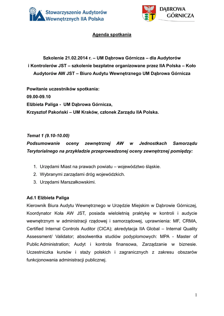 Agenda spotkania Szkolenie 21.02.2014 r. – UM Dąbrowa Górnicza – dla Audytorów i Kontrolerów JST – szkolenie bezpłatne organizowane przez IIA Polska – Koło Audytorów AW JST – Biuro Audytu Wewnętrznego UM Dąbrowa Górnicza Powitanie uczestników spotkania: 09.00-09.10 Elżbieta Paliga - UM Dąbrowa Górnicza, Krzysztof Pakoński – UM Kraków, członek Zarządu IIA Polska. Temat 1 (9.10-10.00) Podsumowanie oceny zewnętrznej AW w Jednostkach Samorządu Terytorialnego na przykładzie przeprowadzonej oceny zewnętrznej pomiędzy: 1. Urzędami Miast na prawach powiatu – województwo śląskie. 2. Wybranymi zarządami dróg wojewódzkich. 3. Urzędami Marszałkowskimi. Ad.1 Elżbieta Paliga Kierownik Biura Audytu Wewnętrznego w Urzędzie Miejskim w Dąbrowie Górniczej, Koordynator Koła AW JST, posiada wieloletnią praktykę w kontroli i audycie wewnętrznym w administracji rządowej i samorządowej, uprawnienia: MF, CRMA, Certified Internal Controls Auditor (CICA); akredytacja IIA Global – Internal Quality Assessment/ Validator; absolwentka studiów podyplomowych: MPA - Master of Public Administration; Audyt i kontrola finansowa, Zarządzanie w biznesie. Uczestniczka kursów i staży polskich i zagranicznych z zakresu obszarów funkcjonowania administracji publicznej. 1 Ad. 2 Agnieszka Antonowicz Audytor wewnętrzny obecnie zatrudniony w Podlaskim Zarządzie Dróg Wojewódzkich w Białymstoku, wcześniej w Biurze Audytu Wewnętrznego Urzędu Marszałkowskiego Województwa Podlaskiego w Białymstoku. Posiada certyfikat audytora wewnętrznego Komisji Egzaminacyjnej Ministerstwa Finansów (nr zaświadczenia: 2158/2006), oraz certyfikat CGAP nr 2824. W 2012 r. uczestnik szkolenia organizowanego przez Stowarzyszenie Audytorów Wewnętrznych IIA Polska dotyczącego oceny jakości audytu wewnętrznego. Koordynator i uczestnik oceny zewnętrznej jakości audytu wewnętrznego w ramach przeglądu partnerskiego przeprowadzonej w zarządach dróg wojewódzkich, które przystąpiły do współpracy. Ad. 3 Katarzyna Lenczyk-Woroniecka Dyrektor Wydziału Urzędu Marszałkowskiego Województwa Dolnośląskiego. Członek SAW IIA Polska, dyplomowany audytor sektora publicznego (CGAP), certyfikowany audytor Ministerstwa Finansów (698/2004), Internal Quality Assessment/Validator, posiada certyfikat zapewnienia zarządzania ryzykiem (CRMA). Autorka publikacji w miesięczniku rachunkowość nr 11/2011 „Specyfika badania sprawozdań finansowych publicznych uczelni wyższych” oraz publikacji w zeszytach naukowych „Audyt wewnętrzny jako źródło systematycznej oceny” - Uniwersytet Ekonomiczny w Katowicach. Autorka polskiego tłumaczenia arkuszy do samooceny według metodologii II Global z podręcznika Quality Assessment Manual oraz podręcznika II Global „Rola audytu w zarządzaniu sektorem publicznym”. 2 Temat 2 (10.00 – 11.40) Przyznawanie dotacji dla organizacji pozarządowych na realizację zadań publicznych. Bożena Grabowska audytor wewnętrzny (zaświadczenie Ministra Finansów nr 887/2004) z ponad 10 letnim stażem pracy w Urzędzie Miasta Częstochowy, gdzie pracowała w komórkach kontroli i audytu wewnętrznego. Członek IIA Polska. Od 2008 roku kieruje Zespołem Audytu Wewnętrznego w Urzędzie Miasta Częstochowy oraz nadzoruje proces zdobywania dwuletniej praktyki w prowadzeniu audytu przez osoby nabywające uprawnienia audytora. Przez ostatnie lata pracy przeprowadziła i nadzorowała szereg zadań audytowych obejmujących wiele aspektów działania dużego miasta na prawach powiatu, jakim jest Częstochowa. Jest absolwentką dziennych studiów magisterskich Szkoły Głównej Handlowej w Warszawie na kierunku Ekonomiczno-Społecznym w zakresie gospodarki miejskiej oraz studiów podyplomowych z zakresu kontroli finansowej i audytu wewnętrznego w jednostkach sektora finansów publicznych na Akademii Ekonomicznej w Katowicach. Posiada także doświadczenie w prowadzeniu audytu w sektorze bankowym, które zdobyła pracując ponad 6 lat w nadzorze bankowym Narodowego Banku Polskiego. Lilla Zajdel audytor wewnętrzny, posiadająca zaświadczenie Ministra Finansów nr 974/2004, od 10 lat zdobywająca doświadczenie zawodowe w komórce kontroli, a później audytu wewnętrznego w Urzędzie Miasta Częstochowy. Członek IIA Polska. Jest absolwentką dziennych studiów magisterskich na Wydziale Handlu Transportu i Usług Akademii Ekonomicznej w Katowicach oraz studiów podyplomowych na kierunku „Zarządzanie i kontrola wewnętrzna oraz audyt” - Akademii Polonijnej w Częstochowie, Wydział Edukacji Pernamentnej - zakończone wpisem na listę Profesjonalnych Audytorów Wewnętrznych prowadzoną przez PIKW oraz kierunku „Administracja Publiczna” w Studium Prawa Europejskiego w Warszawie działającym pod naukowym i dydaktycznym patronatem Wyższej Szkoły Studiów Międzynarodowych. Przeprowadzone dotychczas zadania audytowe (samodzielnie 3 lub w zespole audytorów) obejmowały szereg różnorodnych zagadnień związanych z działalnością samorządu. 4 Temat 3 (11.40 – 12.50) Kontrola dotacji celowych udzielonych jednostkom sektora finansów publicznych. Monika Organa Główny specjalista Województwa Wydziału Śląskiego Kontroli w Katowicach, i Audytu Urzędu Marszałkowskiego absolwentka Wydziału Zarządzania i Komunikacji Społecznej Uniwersytetu Jagiellońskiego w Krakowie (kierunek Zarządzanie firmą). Odbyła studia podyplomowe na Uniwersytecie Ekonomicznym w Katowicach – kierunek Kontrola i audyt w jednostkach sektora finansów publicznych oraz na Uniwersytecie Ekonomicznym w Krakowie – kierunek Rachunkowość i finanse dla zaawansowanych. Od 2001 r. pracownik Urzędu Marszałkowskiego Województwa Śląskiego, w latach 2001 –2003 pracownik Biura Obsługi Inwestora. Od 2011 r. członek II A Polska. W 2013 r. odbyła staż językowy doskonalący język francuski w zakresie stosunków międzynarodowych na Uniwersytecie w Mons w Belgii (stypen