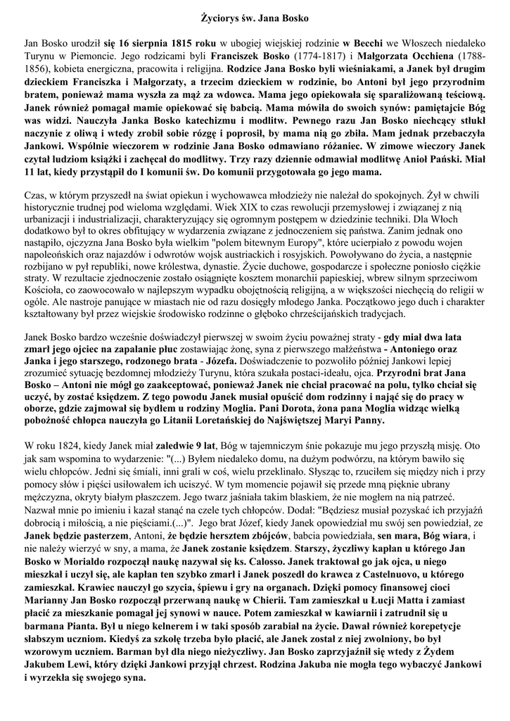 Życiorys św. Jana Bosko Jan Bosko urodził się 16 sierpnia 1815 roku w ubogiej wiejskiej rodzinie w Becchi we Włoszech niedaleko Turynu w Piemoncie. Jego rodzicami byli Franciszek Bosko (1774-1817) i Małgorzata Occhiena (17881856), kobieta energiczna, pracowita i religijna. Rodzice Jana Bosko byli wieśniakami, a Janek był drugim dzieckiem Franciszka i Małgorzaty, a trzecim dzieckiem w rodzinie, bo Antoni był jego przyrodnim bratem, ponieważ mama wyszła za mąż za wdowca. Mama jego opiekowała się sparaliżowaną teściową. Janek również pomagał mamie opiekować się babcią. Mama mówiła do swoich synów: pamiętajcie Bóg was widzi. Nauczyła Janka Bosko katechizmu i modlitw. Pewnego razu Jan Bosko niechcący stłukł naczynie z oliwą i wtedy zrobił sobie rózgę i poprosił, by mama nią go zbiła. Mam jednak przebaczyła Jankowi. Wspólnie wieczorem w rodzinie Jana Bosko odmawiano różaniec. W zimowe wieczory Janek czytał ludziom książki i zachęcał do modlitwy. Trzy razy dziennie odmawiał modlitwę Anioł Pański. Miał 11 lat, kiedy przystąpił do I komunii św. Do komunii przygotowała go jego mama. Czas, w którym przyszedł na świat opiekun i wychowawca młodzieży nie należał do spokojnych. Żył w chwili historycznie trudnej pod wieloma względami. Wiek XIX to czas rewolucji przemysłowej i związanej z nią urbanizacji i industrializacji, charakteryzujący się ogromnym postępem w dziedzinie techniki. Dla Włoch dodatkowo był to okres obfitujący w wydarzenia związane z jednoczeniem się państwa. Zanim jednak ono nastąpiło, ojczyzna Jana Bosko była wielkim "polem bitewnym Europy", które ucierpiało z powodu wojen napoleońskich oraz najazdów i odwrotów wojsk austriackich i rosyjskich. Powoływano do życia, a następnie rozbijano w pył republiki, nowe królestwa, dynastie. Życie duchowe, gospodarcze i społeczne poniosło ciężkie straty. W rezultacie zjednoczenie zostało osiągnięte kosztem monarchii papieskiej, wbrew silnym sprzeciwom Kościoła, co zaowocowało w najlepszym wypadku obojętnością religijną, a w większości niechęcią do religii w ogóle. Ale nastroje panujące w miastach nie od razu dosięgły młodego Janka. Początkowo jego duch i charakter kształtowany był przez wiejskie środowisko rodzinne o głęboko chrześcijańskich tradycjach. Janek Bosko bardzo wcześnie doświadczył pierwszej w swoim życiu poważnej straty - gdy miał dwa lata zmarł jego ojciec na zapalanie płuc zostawiając żonę, syna z pierwszego małżeństwa - Antoniego oraz Janka i jego starszego, rodzonego brata - Józefa. Doświadczenie to pozwoliło później Jankowi lepiej zrozumieć sytuację bezdomnej młodzieży Turynu, która szukała postaci-ideału, ojca. Przyrodni brat Jana Bosko – Antoni nie mógł go zaakceptować, ponieważ Janek nie chciał pracować na polu, tylko chciał się uczyć, by zostać księdzem. Z tego powodu Janek musiał opuścić dom rodzinny i nająć się do pracy w oborze, gdzie zajmował się bydłem u rodziny Moglia. Pani Dorota, żona pana Moglia widząc wielką pobożność chłopca nauczyła go Litanii Loretańskiej do Najświętszej Maryi Panny. W roku 1824, kiedy Janek miał zaledwie 9 lat, Bóg w tajemniczym śnie pokazuje mu jego przyszłą misję. Oto jak sam wspomina to wydarzenie: "(...) Byłem niedaleko domu, na dużym podwórzu, na którym bawiło się wielu chłopców. Jedni się śmiali, inni grali w coś, wielu przeklinało. Słysząc to, rzuciłem się między nich i przy pomocy słów i pięści usiłowałem ich uciszyć. W tym momencie pojawił się przede mną pięknie ubrany mężczyzna, okryty białym płaszczem. Jego twarz jaśniała takim blaskiem, że nie mogłem na nią patrzeć. Nazwał mnie po imieniu i kazał stanąć na czele tych chłopców. Dodał: "Będziesz musiał pozyskać ich przyjaźń dobrocią i miłością, a nie pięściami.(...)". Jego brat Józef, kiedy Janek opowiedział mu swój sen powiedział, ze Janek będzie pasterzem, Antoni, że będzie hersztem zbójców, babcia powiedziała, sen mara, Bóg wiara, i nie należy wierzyć w sny, a mama, że Janek zostanie księdzem. Starszy, życzliwy kapłan u którego Jan Bosko w Morialdo rozpoczął naukę nazywał się ks. Calosso. Janek traktował go jak ojca, u niego mieszkał i uczył się, ale kapłan ten szybko zmarł i Janek poszedł do krawca z Castelnuovo, u którego zamieszkał. Krawiec nauczył go szycia, śpiewu i gry na organach. Dzięki pomocy finansowej cioci Marianny Jan Bosko rozpoczął przerwaną naukę w Chierii. Tam zamieszkał u Łucji Matta i zamiast płacić za mieszkanie pomagał jej synowi w nauce. Potem zamieszkał w kawiarnii i zatrudnił się u barmana Pianta. Był u niego kelnerem i w taki sposób zarabiał na życie. Dawał również korepetycje słabszym uczniom. Kiedyś za szkołę trzeba było płacić, ale Janek został z niej zwolniony, bo był wzorowym uczniem. Barman był dla niego nieżyczliwy. Jan Bosko zaprzyjaźnił się wtedy z Żydem Jakubem Lewi, który dzięki Jankowi przyjął chrzest. Rodzina Jakuba nie mogła tego wybaczyć Jankowi i wyrzekła się swojego syna. 2 Od tego momentu, mimo bardzo jeszcze młodego wieku, Janek Bosko robił wszystko, aby wypełnić powierzone mu zadanie. Od przygodnych kuglarzy i cyrkowców nauczył się wielu sztuczek, którymi potem chętnie popisywał się przed mieszkańcami swojej wioski, a pokazy przeplatał modlitwą, pobożnym śpiewem i powtórzeniem kazania, które w niedzielę usłyszał w kościele. Wysłuchanie kazania i modlitwa były biletem wstępu na przedstawienie, które urządzał Janek. Kiedy pewnego razu po zakładzie z kuglarzem wygrał dużo pieniędzy, widząc, że kuglarz jest z tego powodu smutny, oddal mu pieniądze i kazał sobie i kolegom postawić obiad. Postanowił też zostać księdzem, by pomagać ubogiej młodzieży, ale niestety matka chłopca była zbyt uboga, by zapłacić za jego naukę. Dlatego Ja