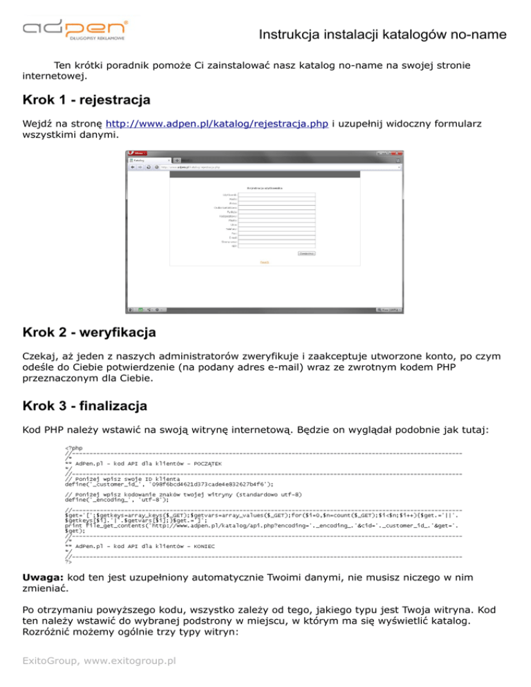 Instrukcja instalacji katalogów no-name Ten krótki poradnik pomoże Ci zainstalować nasz katalog no-name na swojej stronie internetowej. Krok 1 - rejestracja Wejdź na stronę http://www.adpen.pl/katalog/rejestracja.php i uzupełnij widoczny formularz wszystkimi danymi. Krok 2 - weryfikacja Czekaj, aż jeden z naszych administratorów zweryfikuje i zaakceptuje utworzone konto, po czym odeśle do Ciebie potwierdzenie (na podany adres e-mail) wraz ze zwrotnym kodem PHP przeznaczonym dla Ciebie. Krok 3 - finalizacja Kod PHP należy wstawić na swoją witrynę internetową. Będzie on wyglądał podobnie jak tutaj: Uwaga: kod ten jest uzupełniony automatycznie Twoimi danymi, nie musisz niczego w nim zmieniać. Po otrzymaniu powyższego kodu, wszystko zależy od tego, jakiego typu jest Twoja witryna. Kod ten należy wstawić do wybranej podstrony w miejscu, w którym ma się wyświetlić katalog. Rozróżnić możemy ogólnie trzy typy witryn: ExitoGroup, www.exitogroup.pl Instrukcja instalacji katalogów no-name 1. Strona internetowa, której zawartości podstron umieszczone są w plikach PHP na serwerze. W przypadku tego typu witryny, należy zalogować się na swój serwer plików (FTP), edytować wybrany plik z podstroną (lub dodać nowy), w którym ma się pojawić katalog i wkleić kod w odpowiednim miejscu. Wymagana jest tutaj znajomość własnej witryny internetowej. Pamiętaj, że aby katalog działał poprawnie, podstrona musi być parsowana jako PHP, nie jako zwykły HTML. Wykorzystaj odpowiedni edytor HTML. Przykładowo, może to wyglądać tak: 2. Strona internetowa, której zawartości podstron umieszczone są w bazie danych i które można edytować przez panel administracyjny systemu CMS. Zaloguj się do swojego systemu CMS, edytuj istniejącą podstronę lub dodaj nową i w miejscu, gdzie ma się pojawić katalog, w treści podstrony, wklej otrzymany kod. Pamiętaj, że aby katalog działał poprawnie, Twój system CMS musi pozwalać na wykonywanie kodu PHP. Przykładowo, może to wyglądać tak: ExitoGroup, www.exitogroup.pl Instrukcja instalacji katalogów no-name 3. Strona internetowa wykonana w technologii Flash. Tutaj wymagane jest stworzenie plików na twoim serwerze plików (FTP), w głównym katalogu strony, o nazwie np. katalog.php. Plik ten powinien zawierać standardowe nagłówki HTML oraz podstawowy arkusz stylów CSS, który będzie służył do nadania katalogowi odpowiednich czcionek i kolorów. Jak widać na powyższym zrzucie ekranu, kod PHP został wklejony w odpowiednim miejscu. Taki plik, po wykonaniu na serwerze jako http://www.nazwa-twojej-domeny.pl/katalog.php wyświetli Twój katalog. Jedyne, co jeszcze musisz zrobić, to dodać ten link do Twojej witryny w Flash. Opcjonalne ustawienia Aby wybrać ustawienia swojego katalogu, możesz zalogować się na swoje konto pod adresem http://www.adpen.pl/katalog/ . ExitoGroup, www.exitogroup.pl Instrukcja instalacji katalogów no-name Oprócz tego, możesz dostosować kolorystykę tabel, czcionki i inne elementy pod wygląd Twojej witryny przy pomocy arkuszy stylów CSS. Aby to zrobić, należy mieć podstawową wiedzę z zakresu HTML oraz CSS. Katalog staje się integralną częścią Twojej witryny i style jego kodu HTML można dowolnie dopasować. Ważną funkcją, której możesz użyć, jest narzucenie swojej marży do cen naszych produktów. Możesz to zrobić po zalogowaniu się do panelu klienta i wybraniu zakładki "Ustawienia": W pierwszej kolejności należy ustawić widoczność cen na "widoczne", a później ustalić narzut na np. 55%. Panel klienta umożliwia także podgląd efektu końcowego (jest to osobny link, którego też można użyć bezpośrednio na swojej witrynie, używany jako dawna metoda umieszczania katalogu) i zawartości oferty. Warto także dostosować liczbę kolumn z produktami tak, by katalog idealnie wkomponował się w witrynę. Informacje końcowe W przypadku jakichkolwiek problemów, możesz zgłosić się do firmy informatycznej, z którą współpracujemy. Firma ta wdroży katalog na Twojej witrynie (obojętnie jakiego typu) zupełnie za darmo. Poniżej przedstawiamy dane kontaktowe: Bil Software, Katowice http://www.bilsoftware.com e-mail: [email protected] telefon: +48 693 310 785 Osoba do kontaktu: Michał Gacki Preferowany jest kontakt poprzez e-mail. Jedyne, co musisz zrobić, to podać wymagane dane do Twojej witryny, czyli podstawowe dane do serwera FTP (zalecamy na czas modyfikacji zmienić hasło na tymczasowe) oraz ewentualne dane do bazy danych MySQL. ExitoGroup, www.exitogroup.pl Instrukcja instalacji katalogów no-name Efekt końcowy Katalog wdrożony na witrynie (na poniższym zrzucie ekranu jest przykładowa strona internetowa), powinien wyglądać mniej więcej tak: Biuro czynne jest od poniedziałku do piątku w godzinach: 9.00 - 17.00 ul. Stępińska 22/30 00-739 Warszawa tel.: +48 22 852 22 98 faks: +48 22 852 12 16 [email protected] www.adpen.pl NIP: 521-33-62-020 ExitoGroup, www.exitogroup.pl