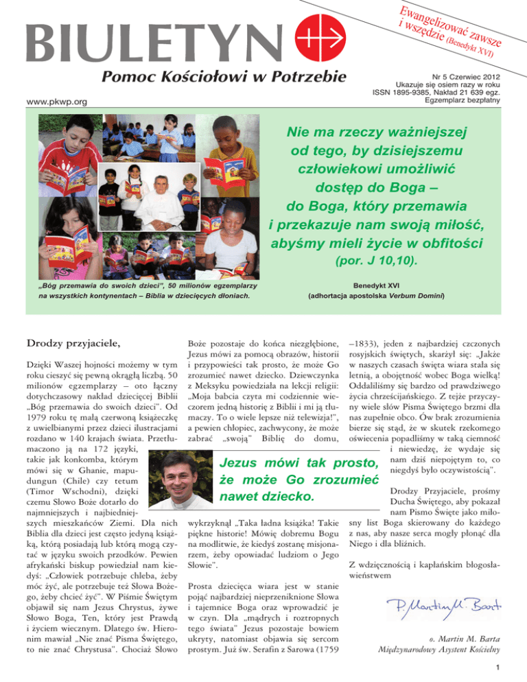 Ewa i wszngelizow ędzie ać za w (Ben edyk sze t XVI ) Pomoc KoÊcio∏owi w Potrzebie www.pkwp.org Nr 5 Czerwiec 2012 Ukazuje si´ osiem razy w roku ISSN 1895-9385, Nak∏ad 21 639 egz. Egzemplarz bezp∏atny Nie ma rzeczy ważniejszej od tego, by dzisiejszemu człowiekowi umożliwić dostęp do Boga – do Boga, który przemawia i przekazuje nam swoją miłość, abyśmy mieli życie w obfitości (por. J 10,10). „Bóg przemawia do swoich dzieci”, 50 milionów egzemplarzy na wszystkich kontynentach – Biblia w dziecięcych dłoniach. Drodzy przyjaciele, Dzięki Waszej hojności możemy w tym roku cieszyć się pewną okrągłą liczbą. 50 milionów egzemplarzy – oto łączny dotychczasowy nakład dziecięcej Biblii „Bóg przemawia do swoich dzieci”. Od 1979 roku tę małą czerwoną książeczkę z uwielbianymi przez dzieci ilustracjami rozdano w 140 krajach świata. Przetłumaczono ją na 172 języki, takie jak konkomba, którym mówi się w Ghanie, mapudungun (Chile) czy tetum (Timor Wschodni), dzięki czemu Słowo Boże dotarło do najmniejszych i najbiedniejszych mieszkańców Ziemi. Dla nich Biblia dla dzieci jest często jedyną książką, którą posiadają lub którą mogą czytać w języku swoich przodków. Pewien afrykański biskup powiedział nam kiedyś: „Człowiek potrzebuje chleba, żeby móc żyć, ale potrzebuje też Słowa Bożego, żeby chcieć żyć”. W Piśmie Świętym objawił się nam Jezus Chrystus, żywe Słowo Boga, Ten, który jest Prawdą i życiem wiecznym. Dlatego św. Hieronim mawiał „Nie znać Pisma Świętego, to nie znać Chrystusa”. Chociaż Słowo Benedykt XVI (adhortacja apostolska Verbum Domini) –1833), jeden z najbardziej czczonych rosyjskich świętych, skarżył się: „Jakże w naszych czasach święta wiara stała się letnią, a obojętność wobec Boga wielką! Oddaliliśmy się bardzo od prawdziwego życia chrześcijańskiego. Z tejże przyczyny wiele słów Pisma Świętego brzmi dla nas zupełnie obco. Ów brak zrozumienia bierze się stąd, że w skutek rzekomego oświecenia popadliśmy w taką ciemność i niewiedzę, że wydaje się dziś niepojętym to, co prosto, nam niegdyś było oczywistością”. Boże pozostaje do końca niezgłębione, Jezus mówi za pomocą obrazów, historii i przypowieści tak prosto, że może Go zrozumieć nawet dziecko. Dziewczynka z Meksyku powiedziała na lekcji religii: „Moja babcia czyta mi codziennie wieczorem jedną historię z Biblii i mi ją tłumaczy. To o wiele lepsze niż telewizja!”, a pewien chłopiec, zachwycony, że może zabrać „swoją” Biblię do domu, Jezus mówi tak że może Go zrozumieć nawet dziecko. wykrzyknął „Taka ładna książka! Takie piękne historie! Mówię dobremu Bogu na modlitwie, że kiedyś zostanę misjonarzem, żeby opowiadać ludziom o Jego Słowie”. Prosta dziecięca wiara jest w stanie pojąć najbardziej nieprzeniknione Słowa i tajemnice Boga oraz wprowadzić je w czyn. Dla „mądrych i roztropnych tego świata” Jezus pozostaje bowiem ukryty, natomiast objawia się sercom prostym. Już św. Serafin z Sarowa (1759 Drodzy Przyjaciele, prośmy Ducha Świętego, aby pokazał nam Pismo Święte jako miłosny list Boga skierowany do każdego z nas, aby nasze serca mogły płonąć dla Niego i dla bliźnich. Z wdzięcznością i kapłańskim błogosławieństwem o. Martin M. Barta Międzynarodowy Asystent Kościelny 1 ligijna ra re Literatu Dobrą Nowinę przelać na papier Ewangelia, Dobra Nowina – już pierwszy papież wzywał chrześcijan by byli „zawsze gotowi do obrony wobec każdego, kto domaga się od was uzasadnienia tej nadziei, która w was jest” (1 P 3,15). Taka postawa zakłada znajomość Ewangelii i gotowość do jej głoszenia. Wielu następców św. Piotra kierowało do wiernych podobne wezwania. Misyjność, zawierająca się w pojęciu Dobrej Nowiny, wymaga odpowiednich środków, zwłaszcza wtedy, gdy realia społeczne są trudne. Na północnym wschodzie Zimbabwe w diecezji Chinhoyi, w której ponad 100 000 katolików mieszka rozproszonych na dużej przestrzeni, przez długi czas najważniejszym środkiem przekazu był lokalny biuletyn. Zawierał nie tylko nowości z życia diecezji, lecz także materiały dla katechetów. Niestety, koszty druku gwałtownie wzrosły. Alternatywa to albo zakup własnej kopiarki, albo brak katechezy i osłabienie więzi wspólnoty. Zimbabwe – drukowanie materiałów liturgicznych dla wspólnoty. Finansujemy połowę kosztów urządzenia do kopiowania (34 000 zł). Najważniejsza księga liturgiczna to Mszał Rzymski, zaś jednym z najistotniejszych postanowień Soboru Watykańskiego II jest możliwość sprawowania liturgii w językach narodowych. Dzięki temu miał miejsce rozkwit ewangelizacji. Na Ukrainie nastąpił on Dlatego, że są mniejszością, katolicy w Pakistanie potrzebują dobrej wiedzy religijnej. W zdobywaniu jej pomaga księgarnia, w której można kupić Biblię w języku urdu. dopiero po 1991 roku. Ile jednak warte jest dla chrześcijan godne sprawowanie Eucharystii? Dobry mszał jest drogi – mocny papier, porządna czcionka, skład i zszywanie (ręczne), materiał na obwolutę, samo drukowanie, transport do parafii. Czy może teksty liturgiczne mają być czytane ze świstków? Nasz wkład to 272 000 zł – aby we wszystkich parafiach liturgia mogła być sprawowana godnie. Biblie w językach narodowych, książki i pisma katechetyczne, podręczniki dla seminariów – „każdy ochrzczony, jako świadek Chrystusa, winien zdobyć formację odpowiednią do swego stanu po to, by pobudzić ewangelizacyjne świadectwo” (bł. Jan Paweł II). Jest dobra wola, często brakuje środków. Czas, byśmy pomogli. G Słucham Twego głosu – modlitwy dla służby liturgicznej „Panie, naucz nas modlić się” – prosili Jezusa uczniowie. I nauczył ich. Również modlitwy można się więc nauczyć. W Meridzie (Wenezuela) s. Teresita Medina przygotow