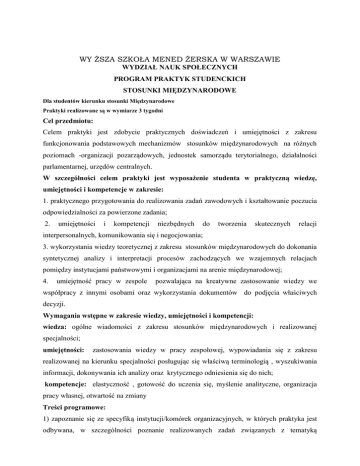 WY ŻSZA SZKOŁA MENED ŻERSKA W WARSZAWIE WYDZIAŁ NAUK SPOŁECZNYCH PROGRAM PRAKTYK STUDENCKICH STOSUNKI MIĘDZYNARODOWE Dla studentów kierunku stosunki Międzynarodowe Praktyki realizowane są w wymiarze 3 tygodni Cel przedmiotu: Celem praktyki jest zdobycie praktycznych doświadczeń i umiejętności z zakresu funkcjonowania podstawowych mechanizmów stosunków międzynarodowych na różnych poziomach -organizacji pozarządowych, jednostek samorządu terytorialnego, działalności parlamentarnej, urzędów centralnych. W szczególności celem praktyki jest wyposażenie studenta w praktyczną wiedzę, umiejętności i kompetencje w zakresie: 1. praktycznego przygotowania do realizowania zadań zawodowych i kształtowanie poczucia odpowiedzialności za powierzone zadania; 2. umiejętności i kompetencji niezbędnych do tworzenia skutecznych relacji interpersonalnych, komunikowania się i negocjowania; 3. wykorzystania wiedzy teoretycznej z zakresu stosunków międzynarodowych do dokonania syntetycznej analizy i interpretacji procesów zachodzących we wzajemnych relacjach pomiędzy instytucjami państwowymi i organizacjami na arenie międzynarodowej; 4. umiejętność pracy w zespole pozwalająca na kreatywne zastosowanie wiedzy we współpracy z innymi osobami oraz wykorzystania dokumentów do podjęcia właściwych decyzji. Wymagania wstępne w zakresie wiedzy, umiejętności i kompetencji: wiedza: ogólne wiadomości z zakresu stosunków międzynarodowych i realizowanej specjalności; umiejętności: zastosowania wiedzy w pracy zespołowej, wypowiadania się z zakresu realizowanej na kierunku specjalności posługując się właściwą terminologią , wyszukiwania informacji, dokonywania ich analizy oraz krytycznego odniesienia się do nich; kompetencje: elastyczność , gotowość do uczenia się, myślenie analityczne, organizacja pracy własnej, otwartość na zmiany Treści programowe: 1) zapoznanie się ze specyfiką instytucji/komórek organizacyjnych, w których praktyka jest odbywana, w szczególności poznanie realizowanych zadań związanych z tematyką międzynarodową, sposobu funkcjonowania, organizacji pracy oraz prowadzonej dokumentacji; Program praktyk obejmuje: 1) analizowanie procesów zachodzących we wzajemnych relacjach pomiędzy instytucjami i organizacjami na arenie europejskiej i międzynarodowej; 2) poznawanie problemów społecznych, kulturowych i gospodarczych wybranych krajów, narodów, organizacji i instytucji; 3)zaznajamianie się z problemami gospodarczymi/dyplomatycznymi/bezpieczeństwa zachodzącymi w Europie i na świecie; 4)zaznajamianie się z podejmowaniem procesów decyzyjnych; 5)zapoznawanie się z funkcjonowaniem i efektami działalności europejskich i międzynarodowych instytucji kulturalnych i humanitarnych; 6)uczenie się i nabywanie umiejętności prowadzenia dokumentacji organizacji i instytucji w zakresie zasad prawnych, ich funkcjonowania i praktycznej działalności; 7)zapoznawanie się z programami i planami rozwoju europejskich stosunków politycznych, społecznych i gospodarczych wybranych instytucji i organizacji; 8) badanie przyczyn sukcesów i niepowodzeń w stosunkach Polski ze swymi sąsiadami w ramach Unii i poza jej strukturami; 9)studiowanie polskiego systemu społeczno-politycznego i analizowanie go na tle innych państw Unii Europejskiej i wschodnich sąsiadów; 11 )nabywanie umiejętności stosowania metod prowadzenia negocjacji. 12)poznawanie stosowanych zasad dyplomacji publicznej np. w zakresie promocji własnej miejscowości/regionu/kraju. Organizacja praktyk: Praktyka odbywa się w fundacjach i stowarzyszeniach zajmujących się problematyką międzynarodową, jednostkach samorządu terytorialnego (komórki związane z problematyką międzynarodową), biurach poselskich, senatorskich, euro parlamentarzystów, partii politycznych, placówkach dyplomatycznych i konsularnych, organizacjach międzynarodowych (ich agendach i punktach informacyjnych w Polsce), mediach. Metody oceny praktyki: Zaliczenie na podstawie potwierdzenia odbytej praktyki realizowanej zgodnie z programem praktyk.
