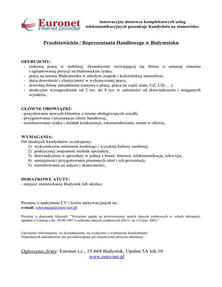 innowacyjny dostawca kompleksowych usług telekomunikacyjnych poszukuje Kandydata na stanowisko: Przedstawiciela / Reprezentanta Handlowego w Białymstoku OFERUJEMY: - ciekawą pracę w stabilnej, dynamicznie rozwijającej się firmie o uznanej renomie i ugruntowanej pozycji na białostockim rynku, - pracę na terenie Białymstoku w młodym zespole i koleżeńskiej atmosferze, - dużą dowolność i elastyczność w wykonywanej pracy, - dowolną formę zatrudnienia (umowa o pracę, praca na część etatu, UZ, UD, …) - atrakcyjne wynagrodzenie od 2 tys. do 8 tys. w zależności od doświadczenia i osiąganych wyników, GŁÓWNE OBOWIĄZKI: - pozyskiwanie nowych klientów z terenu obsługiwanych osiedli, - przygotowanie i prezentacja oferty handlowej, - monitorowanie rynku i działań konkurencji, rekomendowanie zmian w ofercie, WYMAGANIA: Od idealnych kandydatów oczekujemy: 1) wykształcenia minimum średniego i wysokiej kultury osobistej, 2) praktycznej znajomość technik sprzedaży, 3) doświadczenia w sprzedaży w jednej z branż: Internet, telekomunikacja, telewizja, 4) umiejętności przygotowania pisemnych ofert i ich prezentacji, 5) zorientowania na sukces i skuteczności, DODATKOWE ATUTY: - miejsce zamieszkania Białystok lub okolice. Prosimy o nadsyłanie CV i listów motywacyjnych na : e-mail: [email protected] Prosimy o dopisanie klauzuli: "Wyrażam zgodę na przetwarzanie moich danych osobowych w celach rekrutacji, zgodnie z Ustawą z dn. 29.08.1997 o ochronie danych osobowych (Dz.U. nr 133 poz. 883).” Uprzejmie informujemy, że skontaktujemy się wyłącznie z wybranymi kandydatami. Nadesłanych dokumentów nie przechowujemy po zakończeniu procesu rekrutacji. Ogłoszenie firmy: Euronet s.c., 15-668 Białystok, Upalna 5A lok.10 www.euro-net.pl